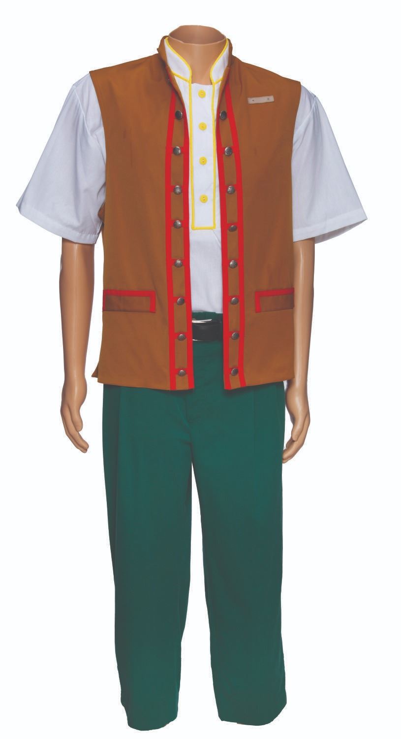 (Walt Disney World, 2000s) A costume worn by Fantasyland Attractions Hosts and Hostesses at The Magic Kingdom, including a shirt, pair of pants, vest, and a belt. The shirt and vest measure a size medium, the pants are a unisex size 38X, and the belt is 36/38. The pieces are in very good condition overall, exhibiting light wear from Cast use.