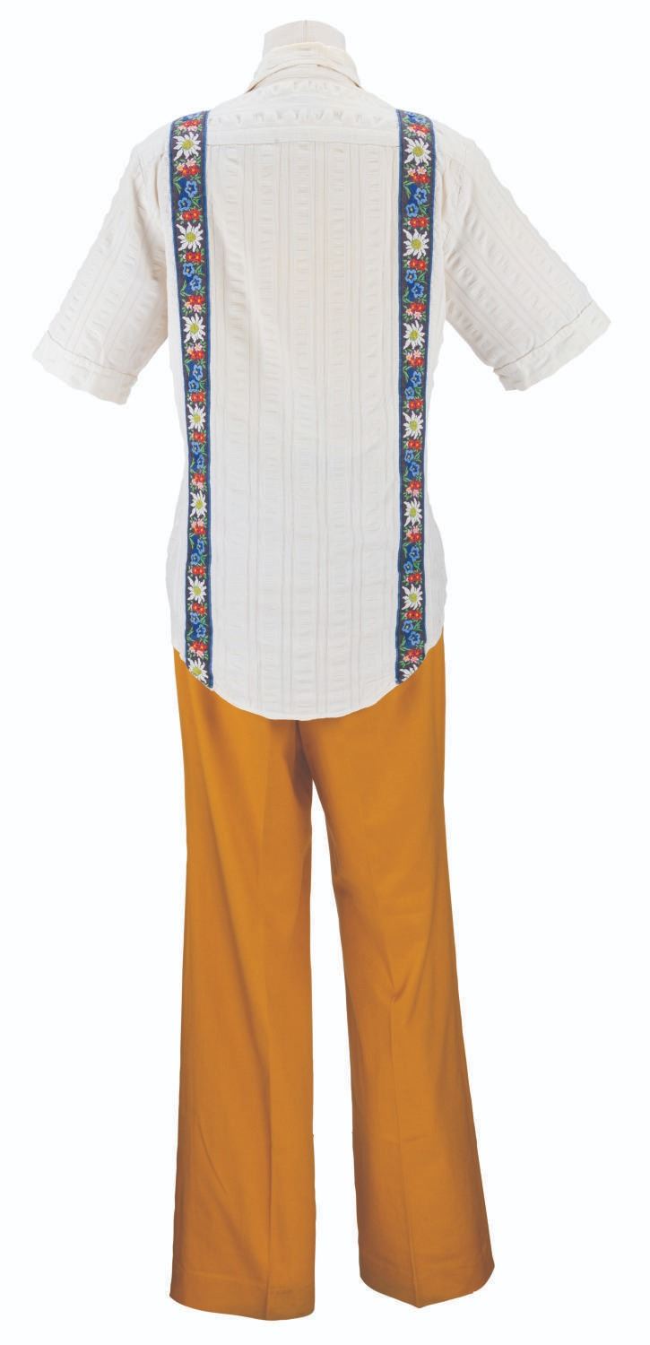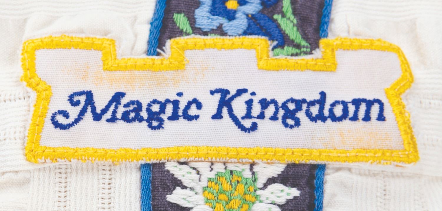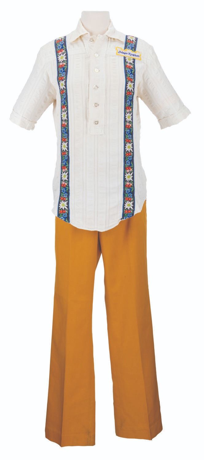 (Walt Disney World, 1990s-2000s) A uniform shirt and pants worn by a Cast Member working in Fantasyland at the Magic Kingdom. The shirt is labeled a size S and the pants 32x34, both displaying in very good condition with wear from Park use and light spots of discoloration, notably on the Magic Kingdom patch.