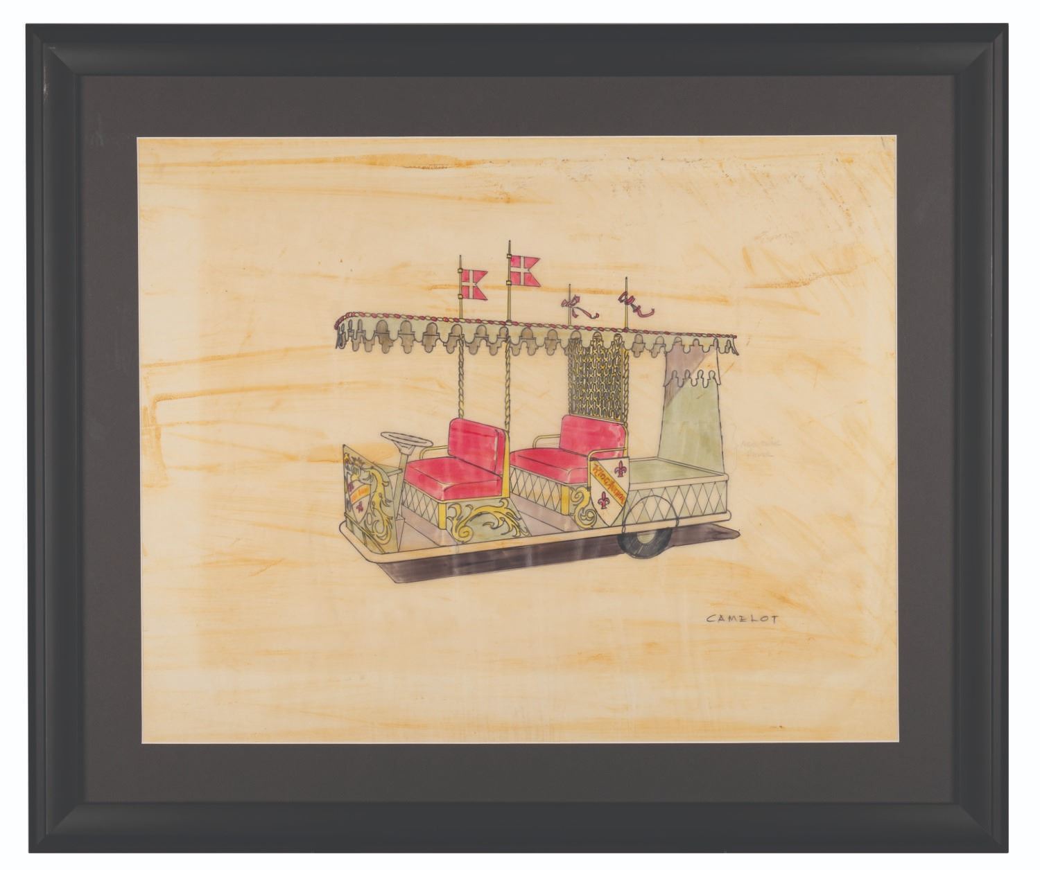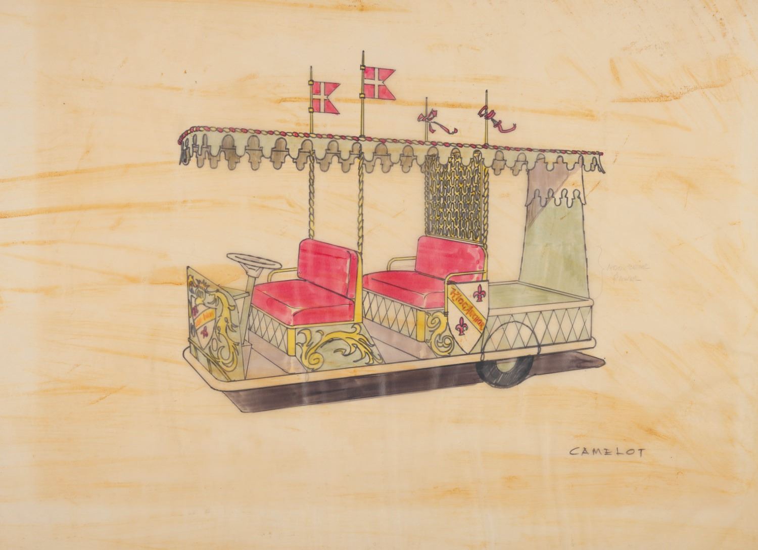(Disneyland, 1955) An original concept drawing for a Fantasyland “Camelot” themed service vehicle by Imagineer Bruce Bushman. Accomplished in ink and watercolor on thin artist’s paper measuring 18.5” x 23.5”, this piece is in good condition with adhesive discoloration from age throughout, and a thin strip of tape along the top edge of the reverse.