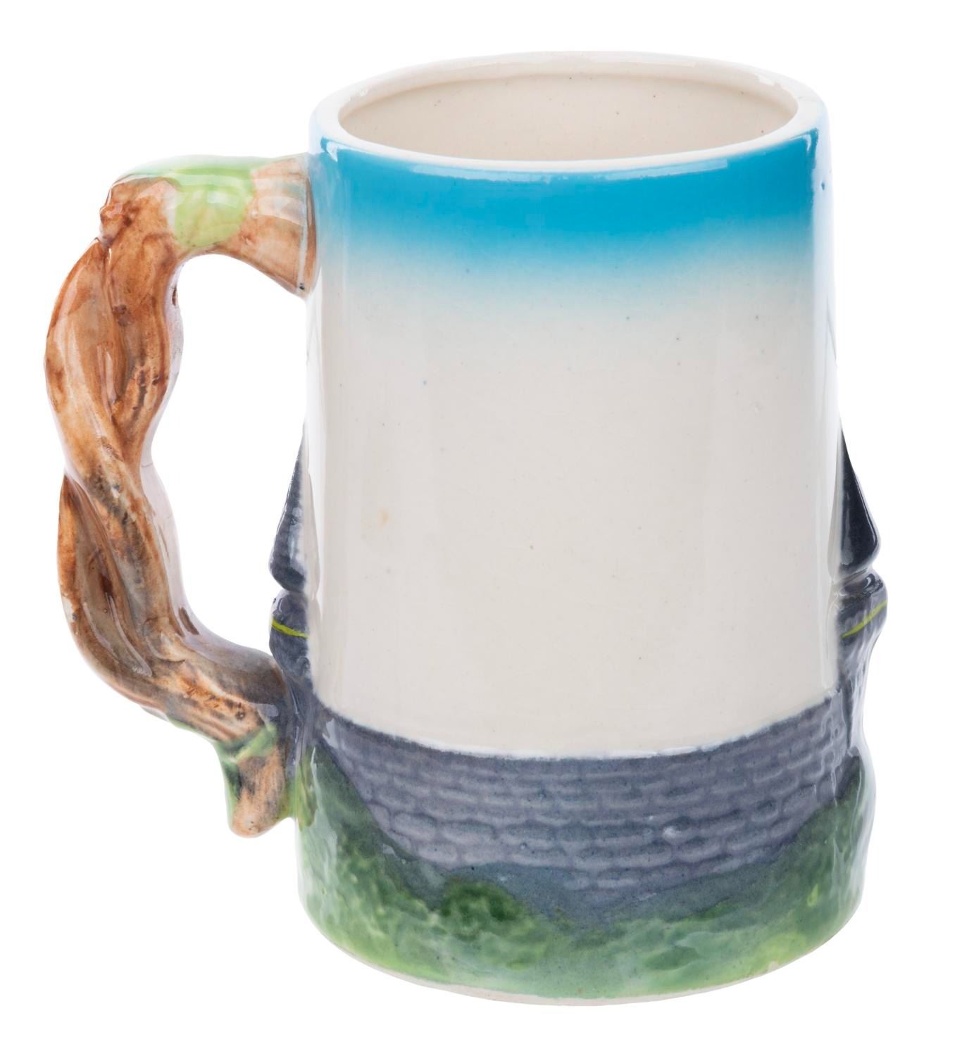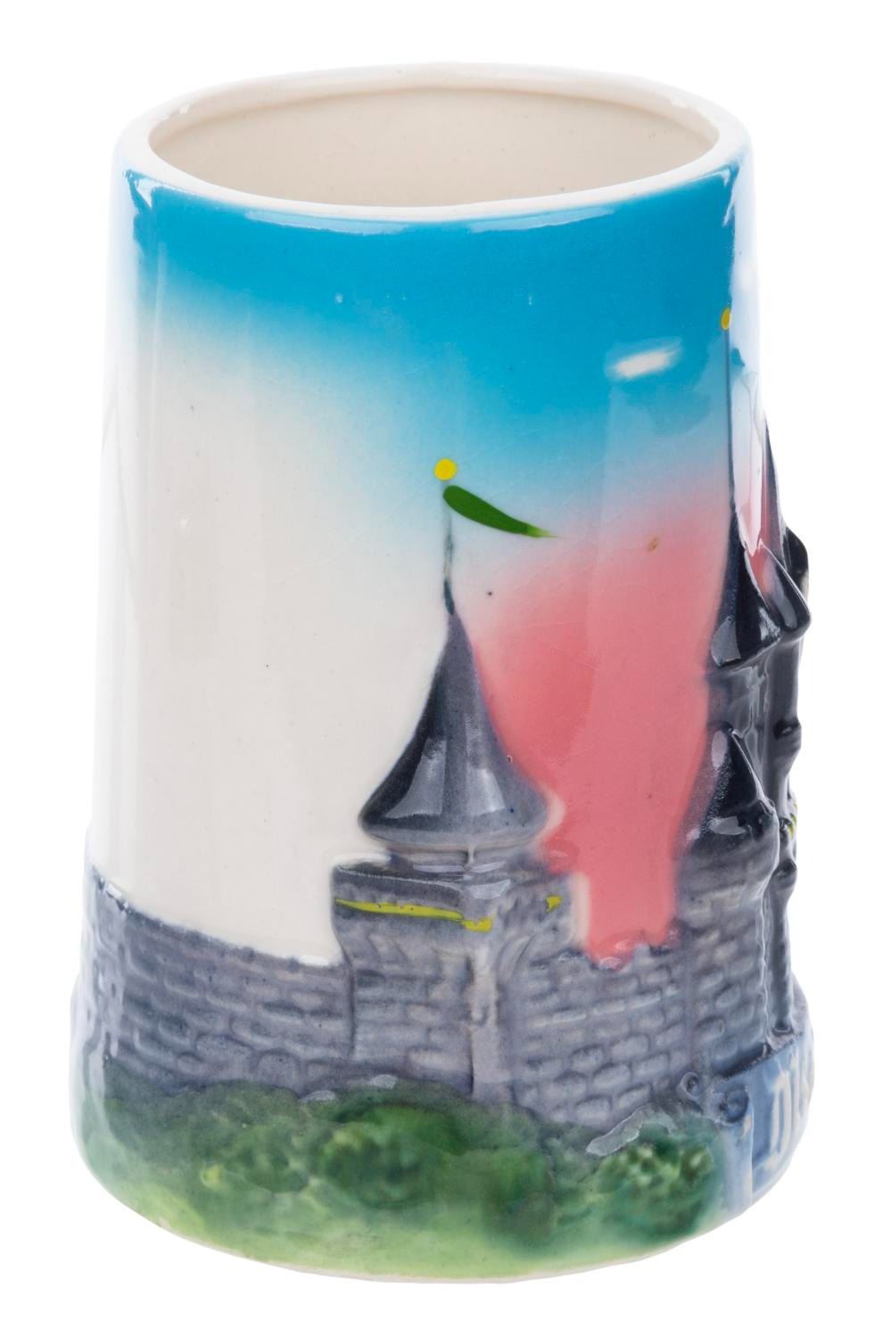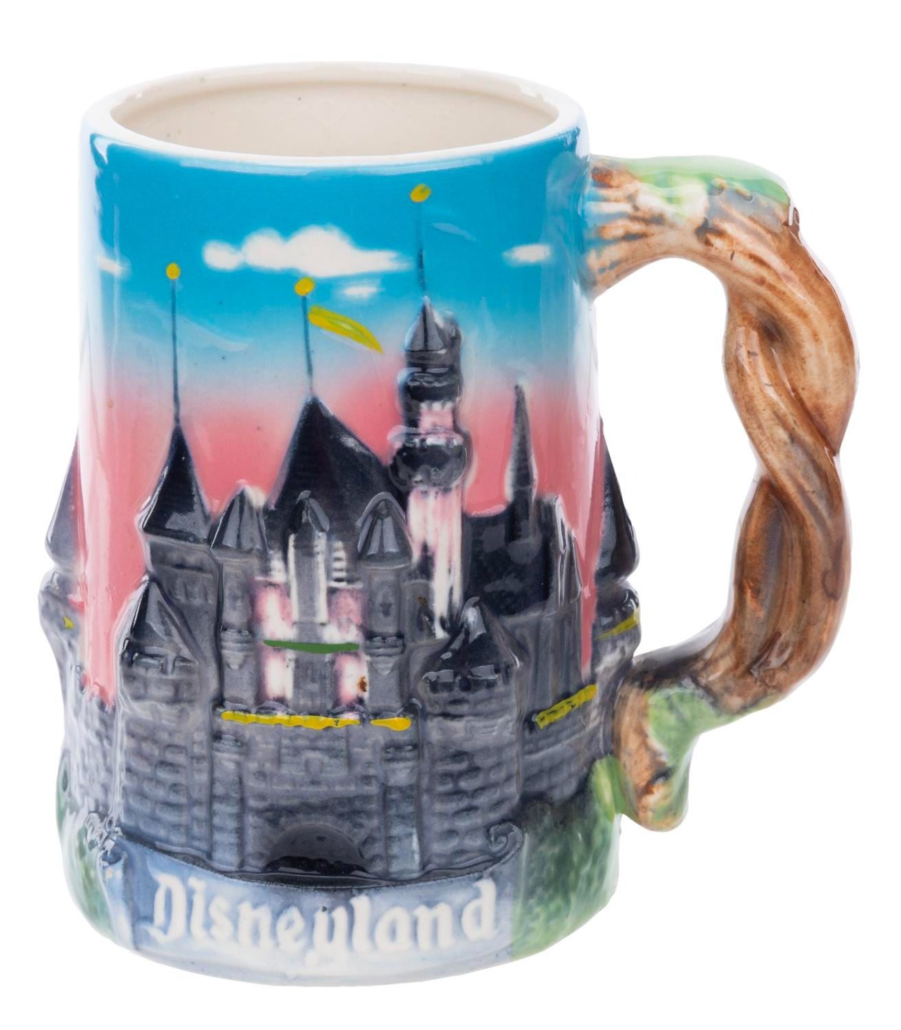(Disneyland, 1960s) An early bas-relief souvenir Disneyland ceramic castle stein featuring a sculpted relief of Sleeping Beauty Castle. Measuring 5.5" x 4" x 5.5" high, the mug is in very good condition with light crazing.