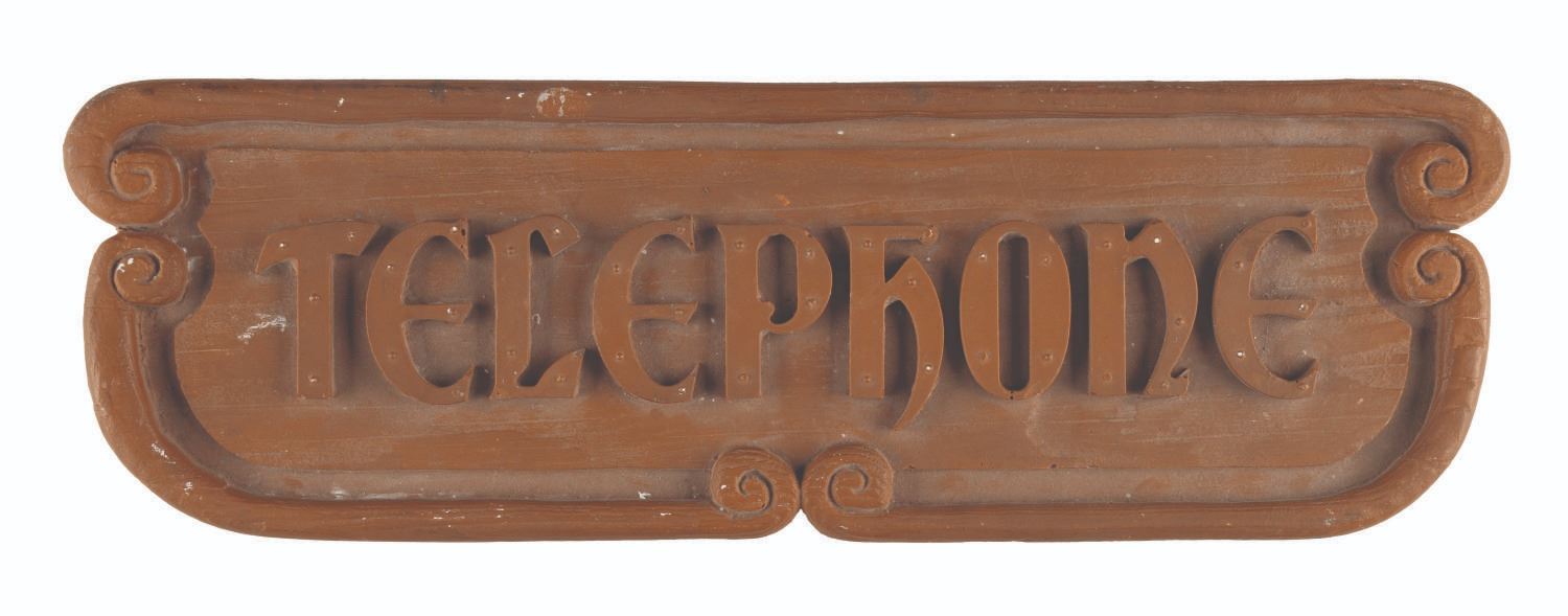 (Disneyland, 1970s-1990s) A fiberglass Fantasyland telephone sign. Measuring 5.5” x 17.25”, the sign is in good condition with paint marks and scuffs from Park use.