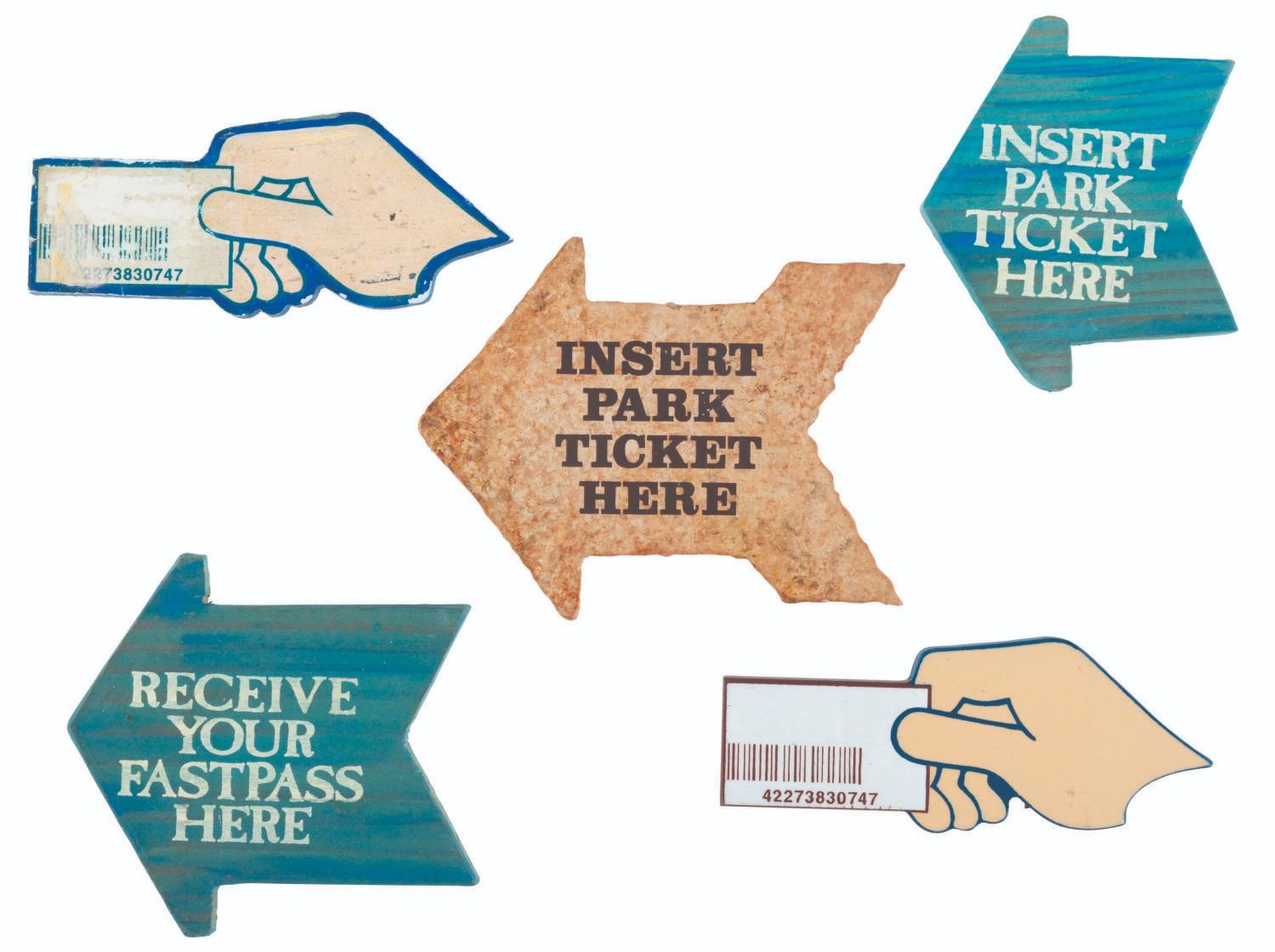 (Disney Parks, 1999-2000s) A collection of five FastPass kiosk signs, used to help Guests aquire FastPasses. Included are two “Insert Park ticket here” signs, one “Receive your FastPass here” sign, and two FastPass scan signs. Ranging in size from 3” x 3.5” to 3.5” x 4.5”, the wood and plastic signs are in fair to very good condition with scratches, scuffs, and one scan sign showing heavy wear and paint loss from Park use.