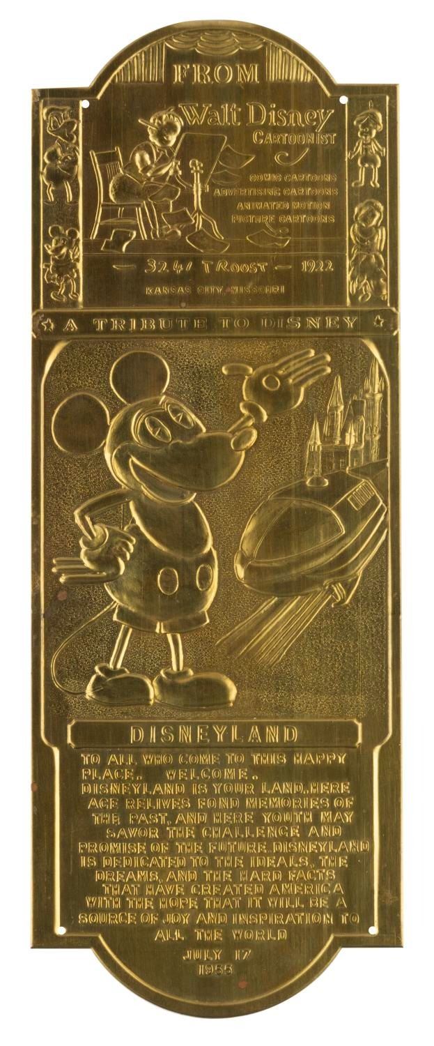 (Unknown, 1970s) During the 1970s, several “tribute” items appeared in the Disney collectibles scene, designed to look like 1930s or 1950s souvenirs. This door plaque produced in England is one of these items, featuring images of Walt’s Kansas City business card, Mickey Mouse and the monorail, and Walt’s Disneyland opening day speech. Despite the unusual history of these items, they are actually quite desired among collectors and have earned a unique place in Disneyana history. Measuring 3.5” x 9.75”, the plaque is in very good condition with very slight wear from age and handling.