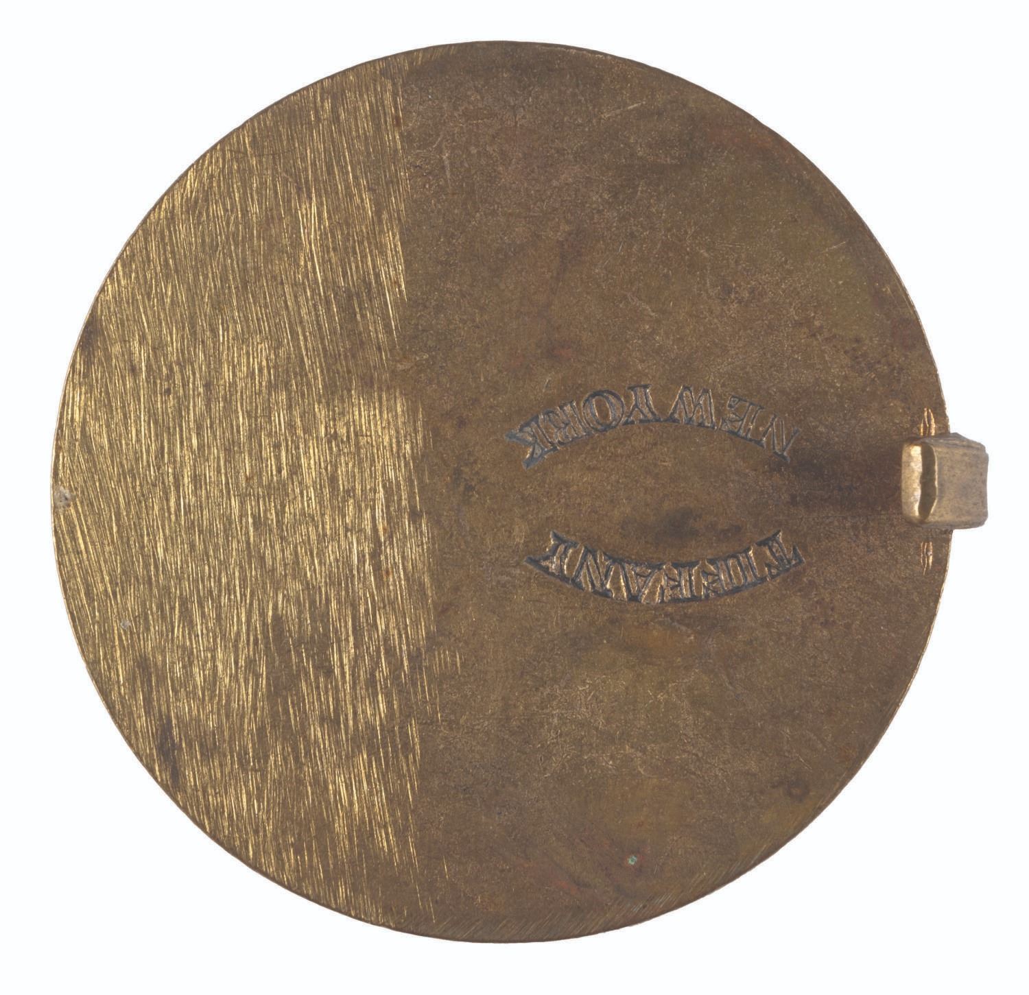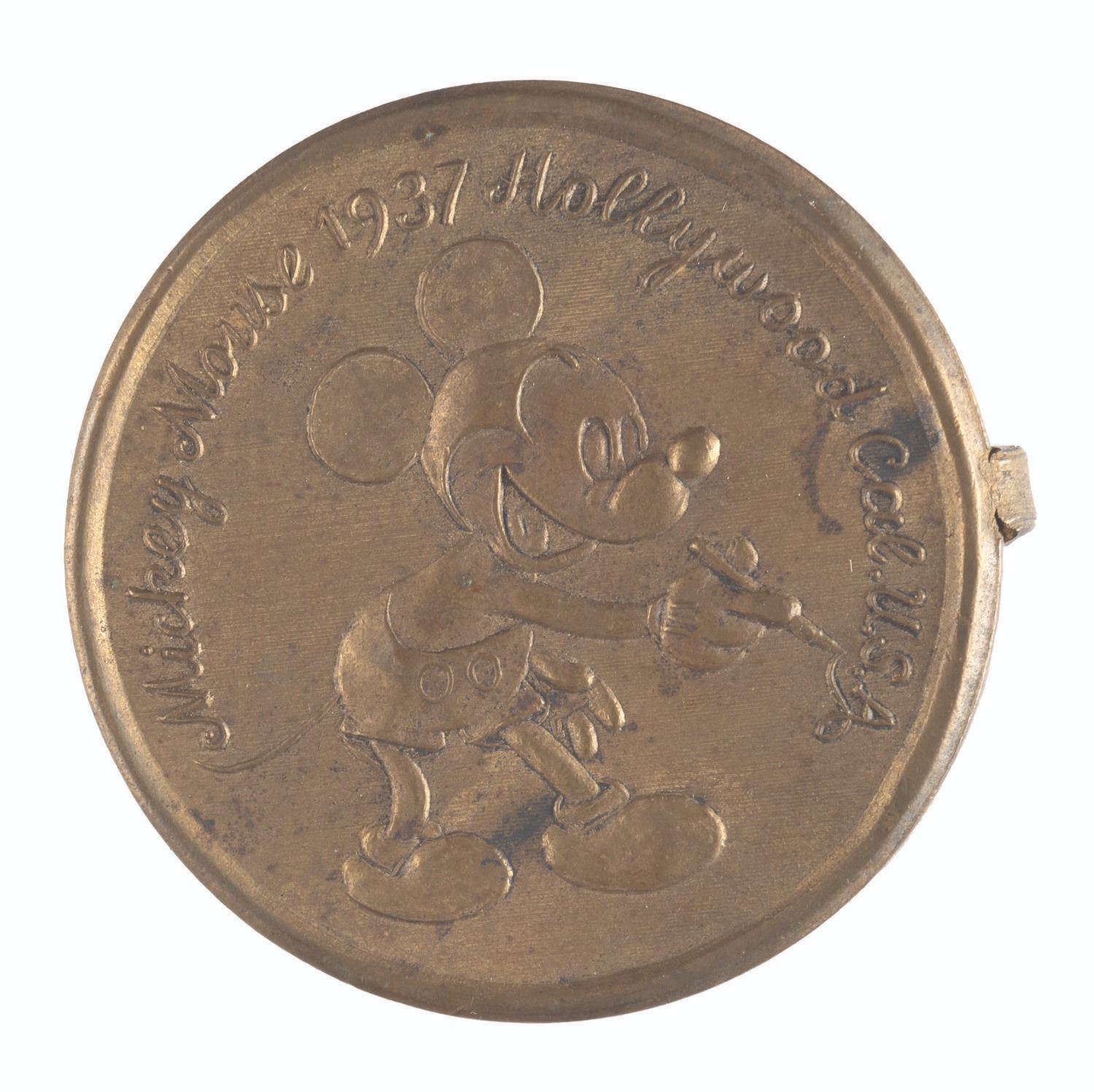 (John Fairchild, 1960s-1970s) An infamous faux Tiffany Mickey Mouse belt buckle. A relief on the buckle features Mickey Mouse with a pencil writing the text “Mickey Mouse 1937 Hollywood Calif. U.S.A.” with "Tiffany New York" on the reverse. These belt buckles were created and sold by English forger John Fairchild. Fairchild went so far as to write a book about the belt buckles under the pen name “Percy Siebart” to convince people of his work’s legitimacy. U.S. Customs eventually came down on Fairchild. Despite the unusual history of these belt buckles, they are quite desirable among collectors and have earned a unique place in Disneyana history. Measuring 2.5” in diameter, the brass belt buckle is in good condition with oxidation, stains, and wear.