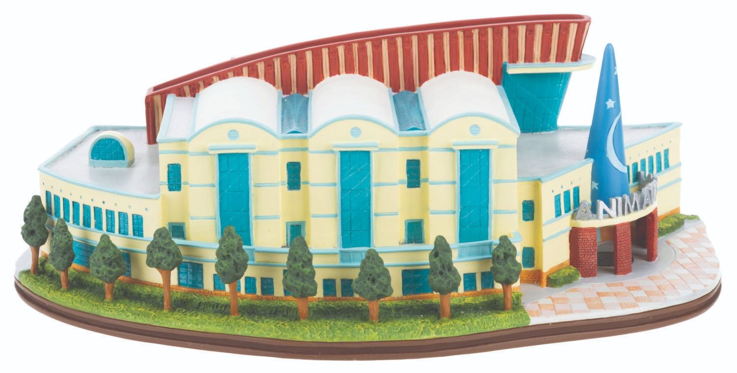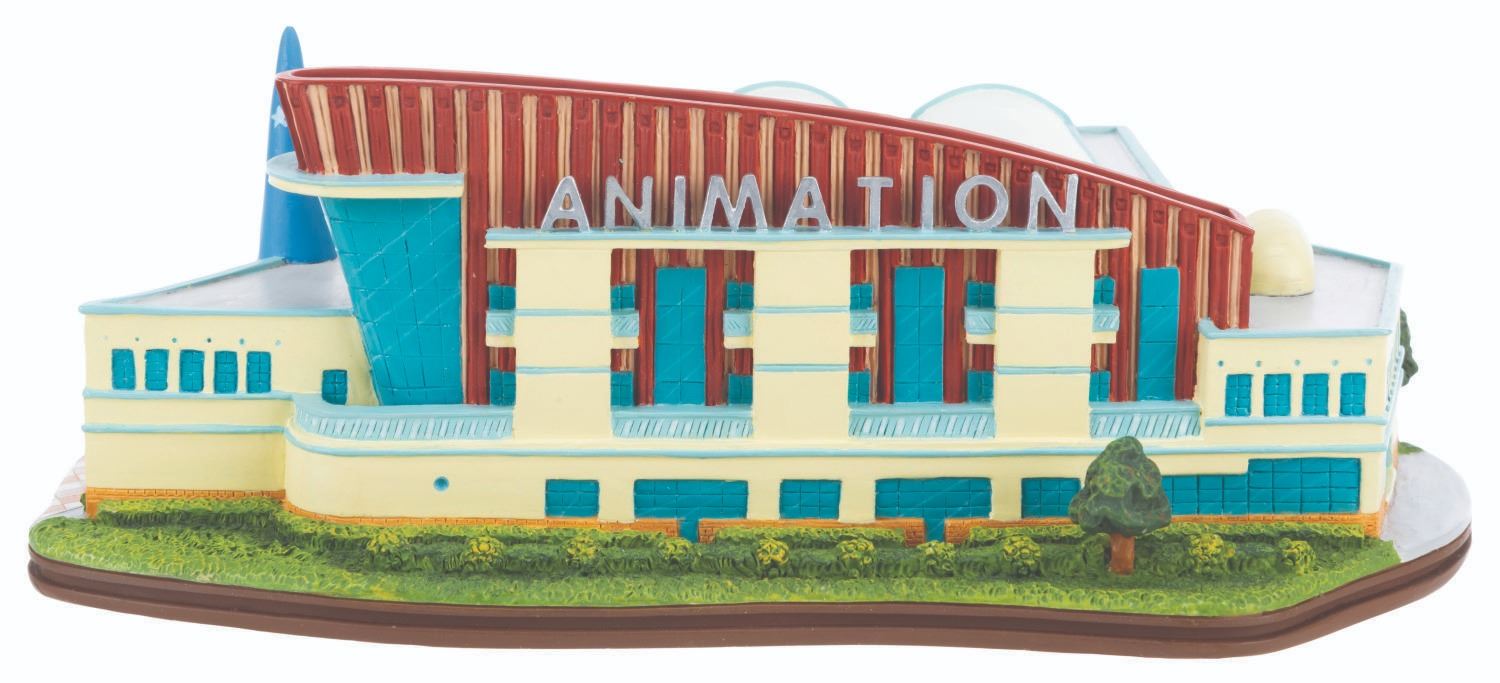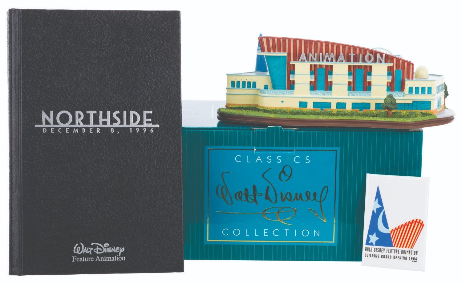 (WDCC, 2002) A Walt Disney Classics Collection sculpture of the Feature Animation Building at Walt Disney Studios in Burbank. Titled"Where the Magic Begins," the figurine was released in a limited edition at the 2002 Walt Disney Art Classics Convention and is numbered 290/500. Included are a button from the building's 1994 grand opening and a Cast Member notebook commemorating the December 8, 1996, grand opening of Feature Animation's Northside building. Ranging in size from the 2.25" x 3.25" button to the 8.25" x 4" x 3" tall sculpture, the items display in very good to fine condition with heavy scratches on the button and the roof of the building.