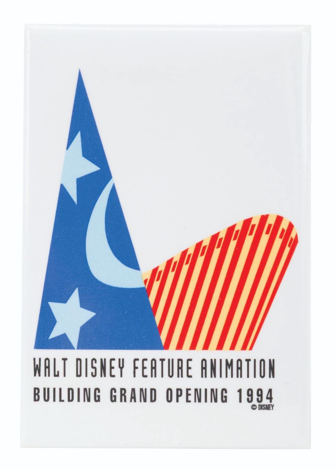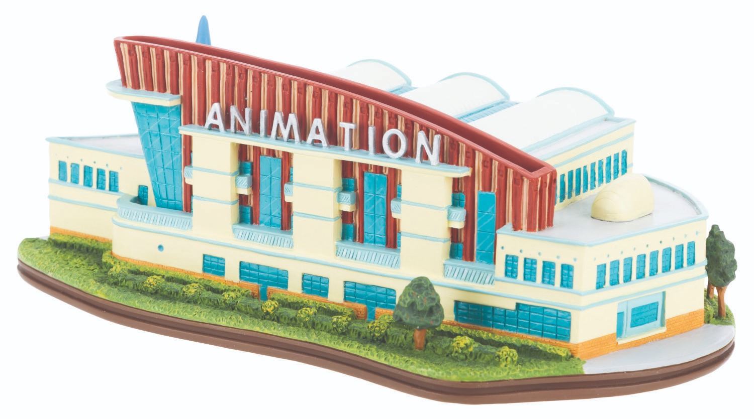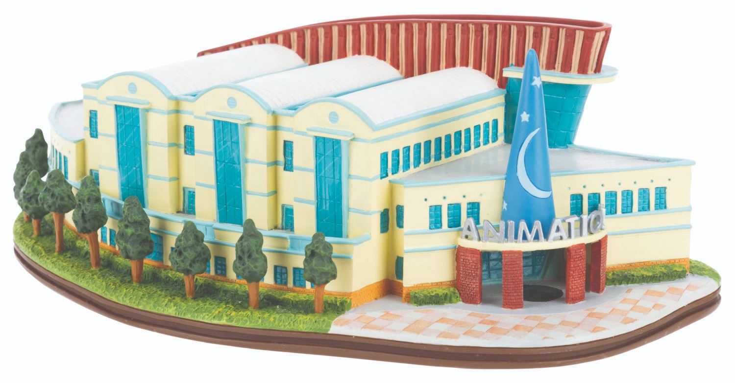 (WDCC, 2002) A Walt Disney Classics Collection sculpture of the Feature Animation Building at Walt Disney Studios in Burbank. Titled"Where the Magic Begins," the figurine was released in a limited edition at the 2002 Walt Disney Art Classics Convention and is numbered 290/500. Included are a button from the building's 1994 grand opening and a Cast Member notebook commemorating the December 8, 1996, grand opening of Feature Animation's Northside building. Ranging in size from the 2.25" x 3.25" button to the 8.25" x 4" x 3" tall sculpture, the items display in very good to fine condition with heavy scratches on the button and the roof of the building.