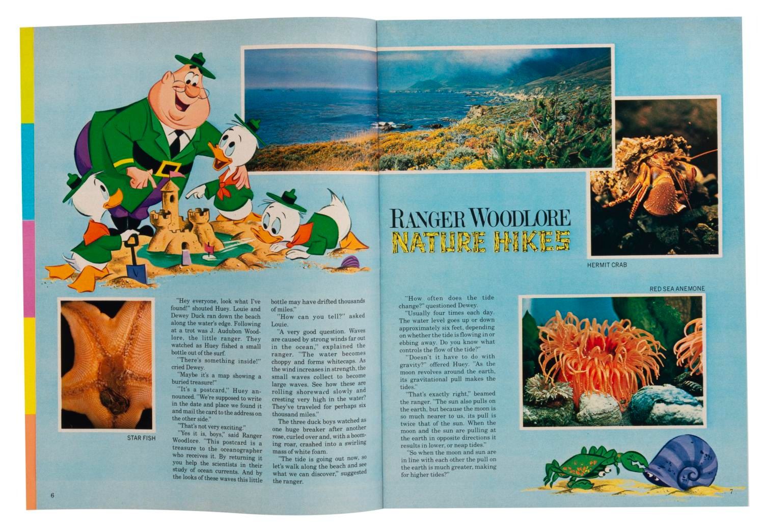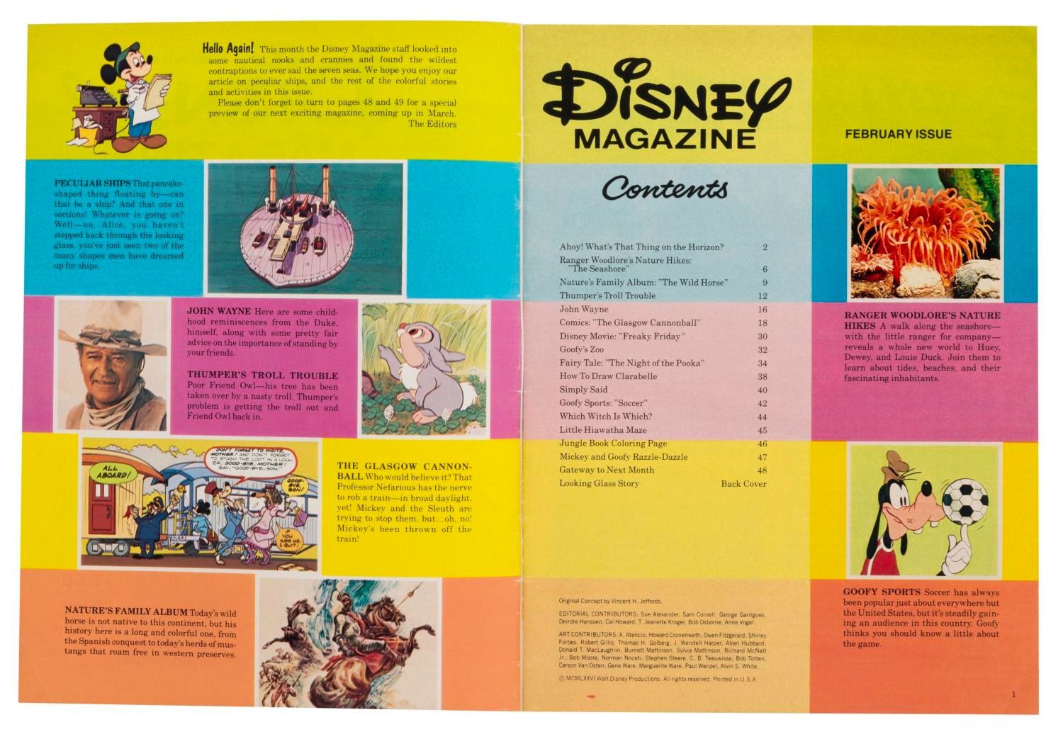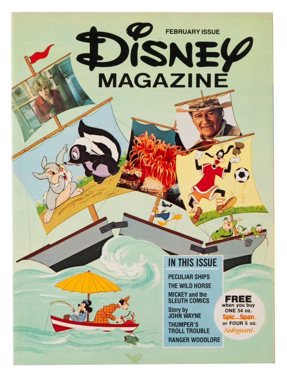 (Disney, 1976) A February 1976 issue of Disney Magazine featuring comics and a story by John Wayne. Measuring 8.25" x 11", the issue displays in very good condition with light handling wear, a piece of tape on the cover, and discoloration from age.