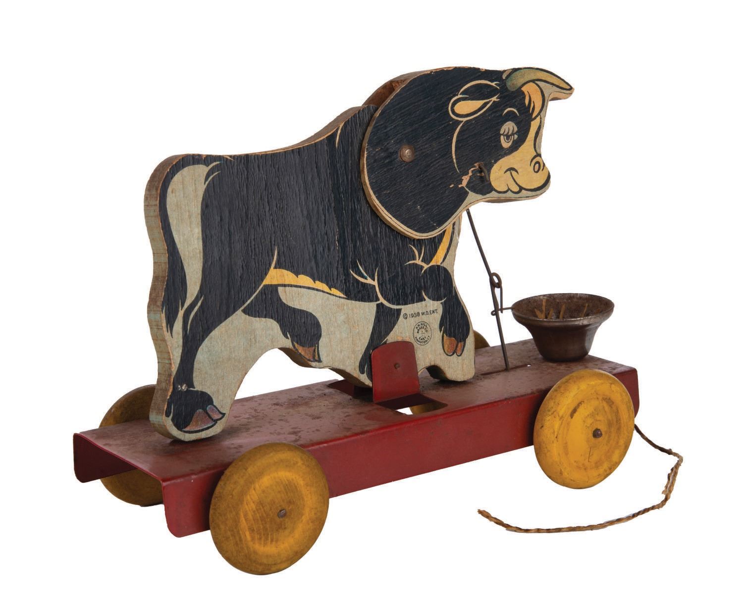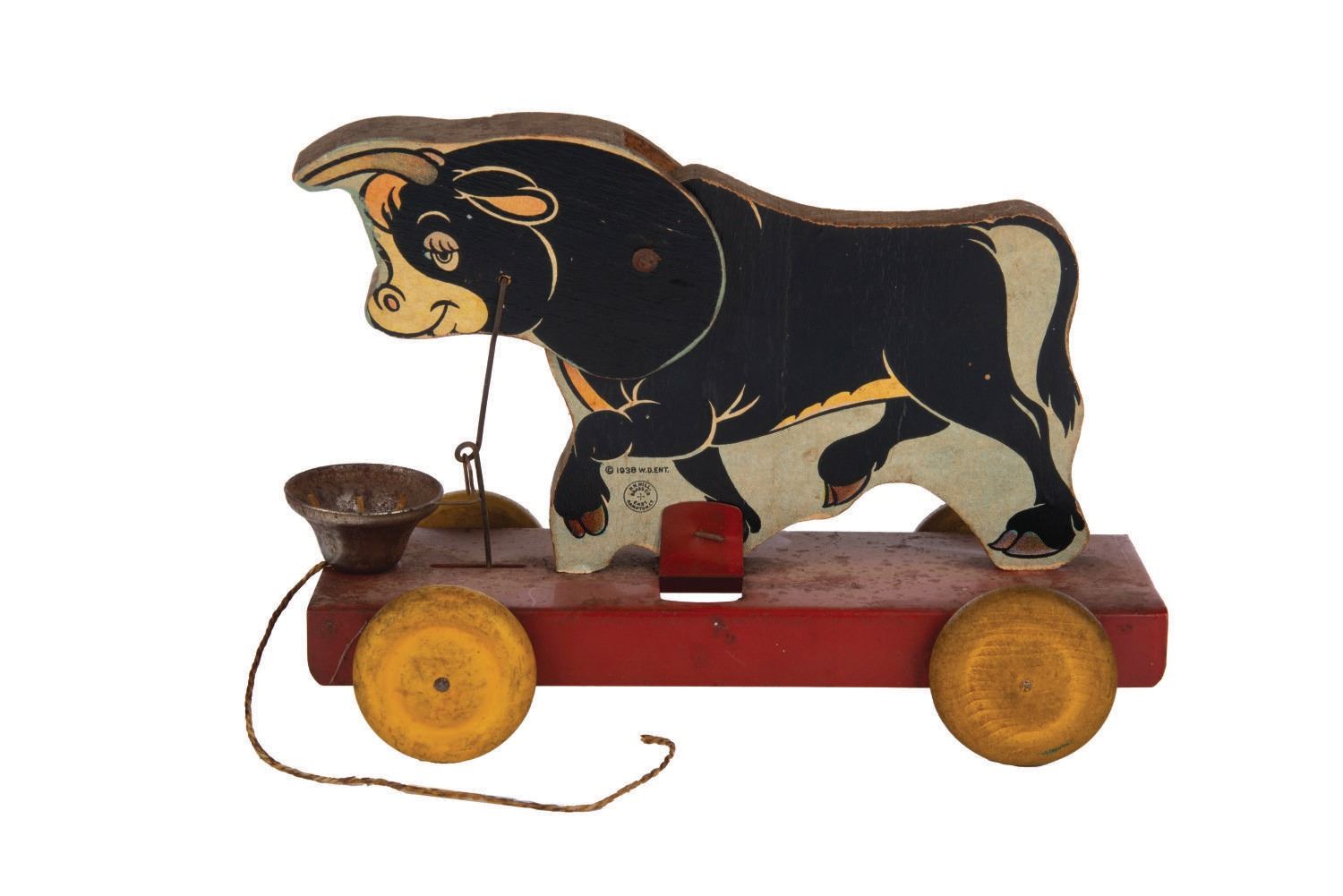 (N.N. Hill, 1938) A Ferdinand the Bull Pull Toy by the N.N. Hill Brass Company of East Hampton, Connecticut. The toy features a wooden Ferdinand with printed imagery, fastened atop a metallic base with wooden wheels. Measuring 9" long and 6.75" tall, the toy is in good condition with expected oxidation to metallic parts, creases and spots of discoloration to printed imagery, and scuffs and wear throughout. The original pull cord has been replaced.