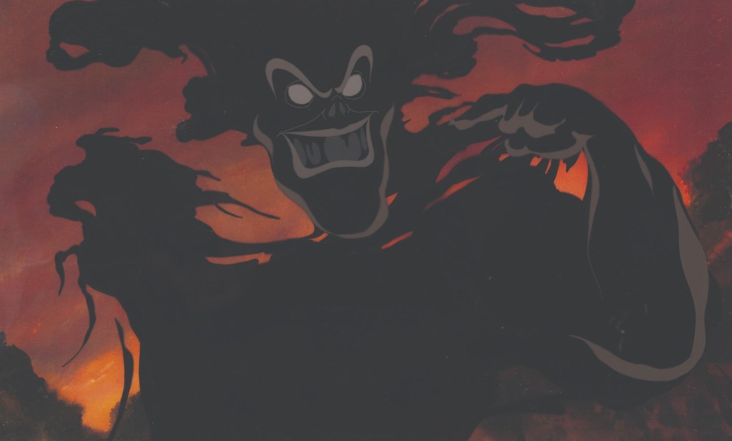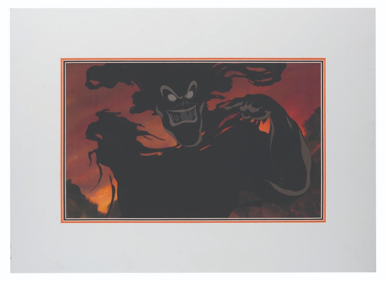 (20th Century Fox, 1992) An original multi-layer production cel from "FernGully: The Last Rainforest" of the villain Hexxus, voiced by Tim Curry. Hexxus has an image size of 9.25" x 13.75" in a 9.25" x 15.5" visible window. The entire matted piece measures 16" x 22". The art is paired with a color copy background and displays in very good condition with scratches, wear from production use, and the outline of a piece of tape on the chest from previous adhesive use.