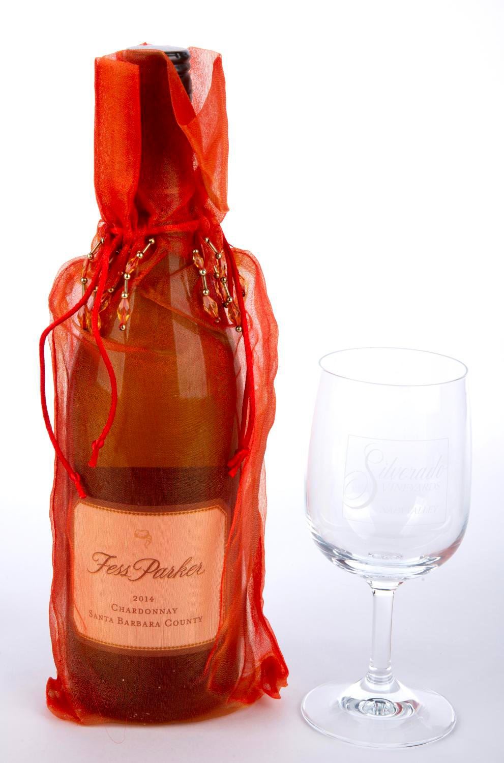 (Fess Parker, 2014) A bottle of Fess Parker's Silverado Vineyard Chardonnay paired with an etched Silverado Wineries wine glass. Both pieces are in fine unused condition.