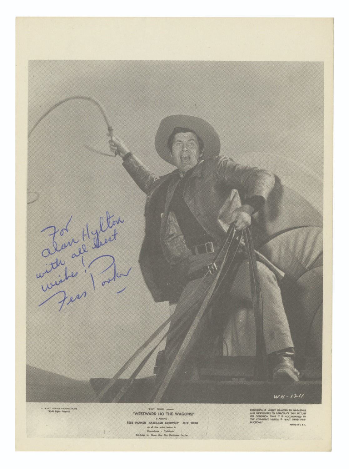 (Disney, 1980s) A signed press photograph of Fess Parker as John 'Doc' Grayson in the Walt Disney Studios western film, "Westward Ho the Wagons!" While the photo appears to be an older press photo, it was signed by Parker around 1980 and personalized to Alan Hylton. Measuring 7" x 5", the photo is in very good condition with minor wear.