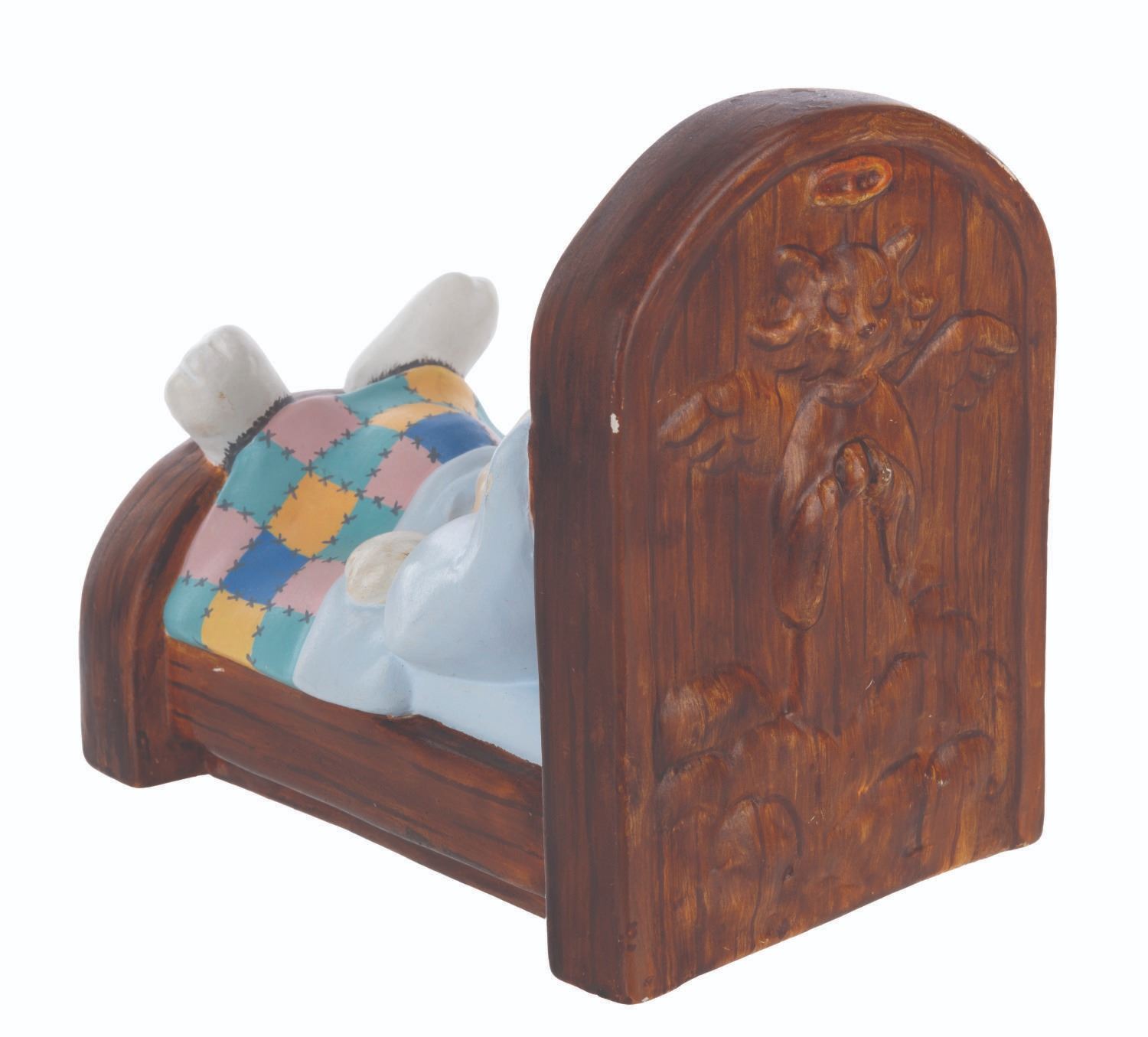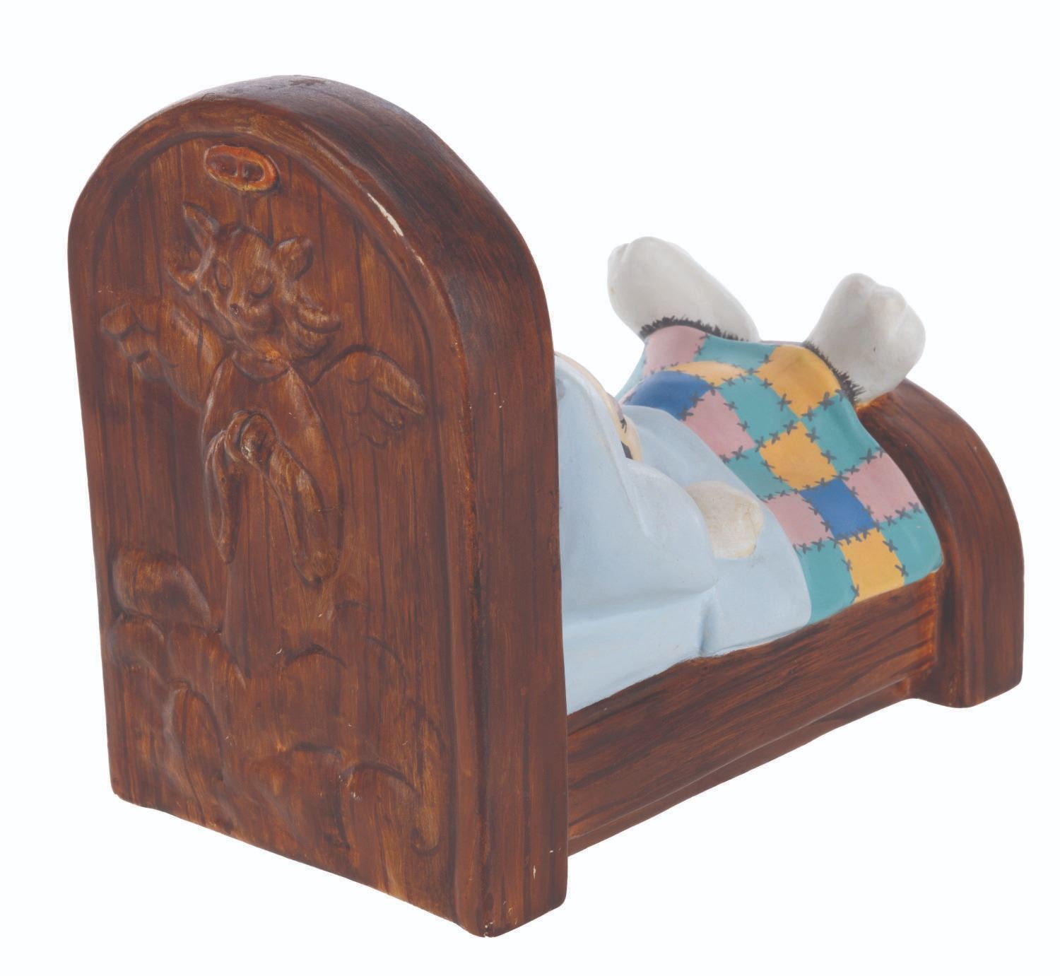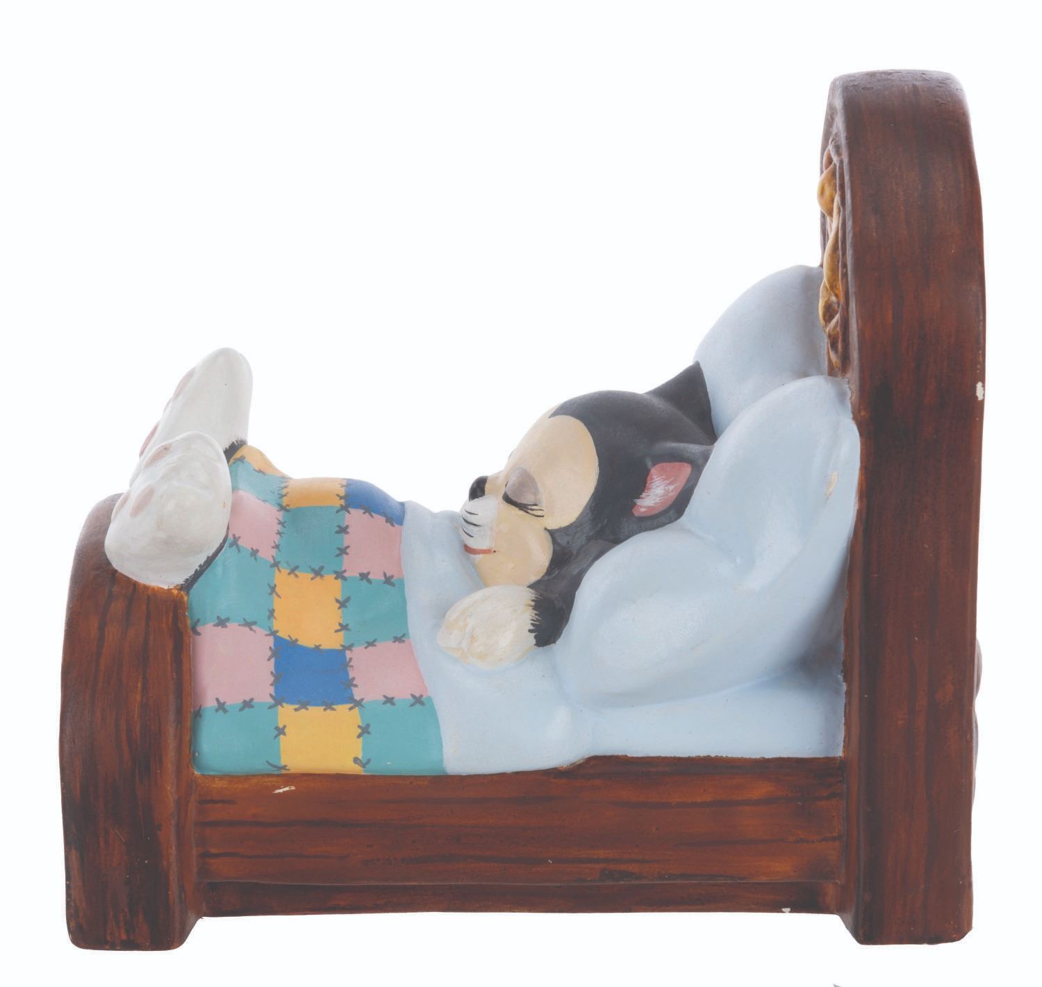 (Disney, 1940) An extremely rare Figaro production maquette from “Pinocchio.” Maquettes such as this one were used by animators for three-dimensional character reference. Only a handful of these hand-painted pieces were produced and distributed among the animators. Painted on the bottom of the base is the name “Helen Nerbovig McIntosh.” Nerbovig started off in Disney’s Ink & Paint Department as one of their first paid trainees. Nerbovig’s duties included painting character maquettes for productions, but what really set her apart were her cel setups. Walt was so impressed with her work that he made her the head of the Cel Setup Department, which worked with Disney’s new partner Courvoisier of San Francisco to sell cel setups to collectors. Her impressive work continues to be in high demand at auction houses worldwide. She most likely painted this particular maquette for herself. Measuring 6.5” x 4.25” x 6”, the hand-painted ceramic maquette is in very good condition with light scuffs and wear from production use.