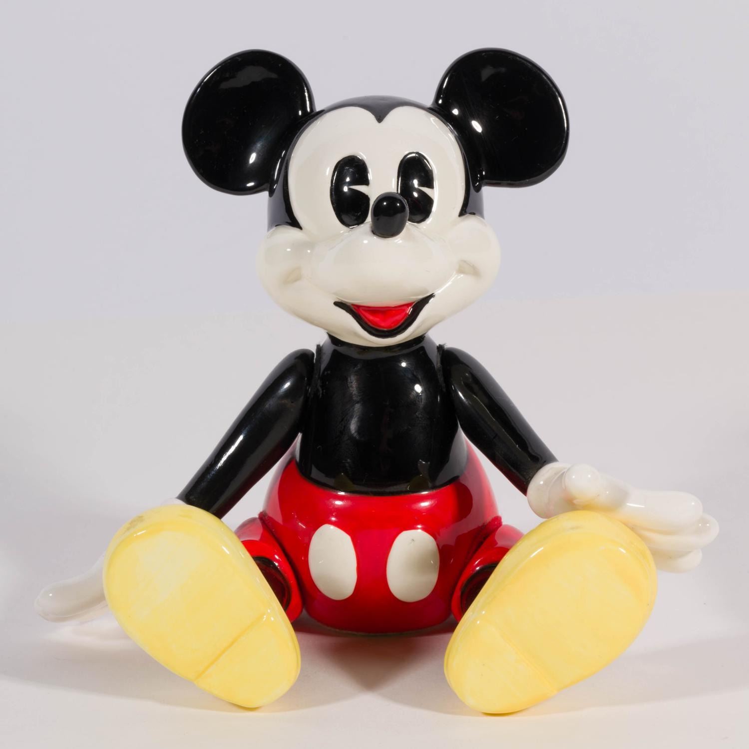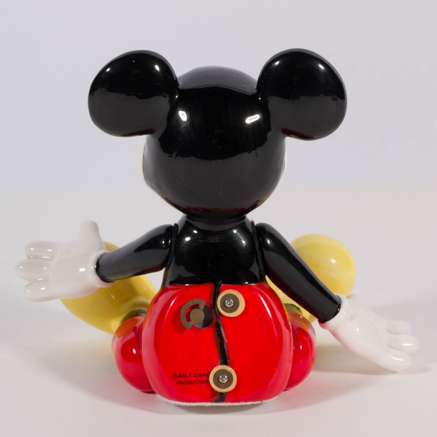 (Schmid, 1980s) A ceramic music box of Mickey Mouse manufactured by Schmid. Featuring articulated legs and arms, the box plays the "Mickey Mouse Club March." Measuring 6" x 4" and 5" tall, the music box is in very good working condition.