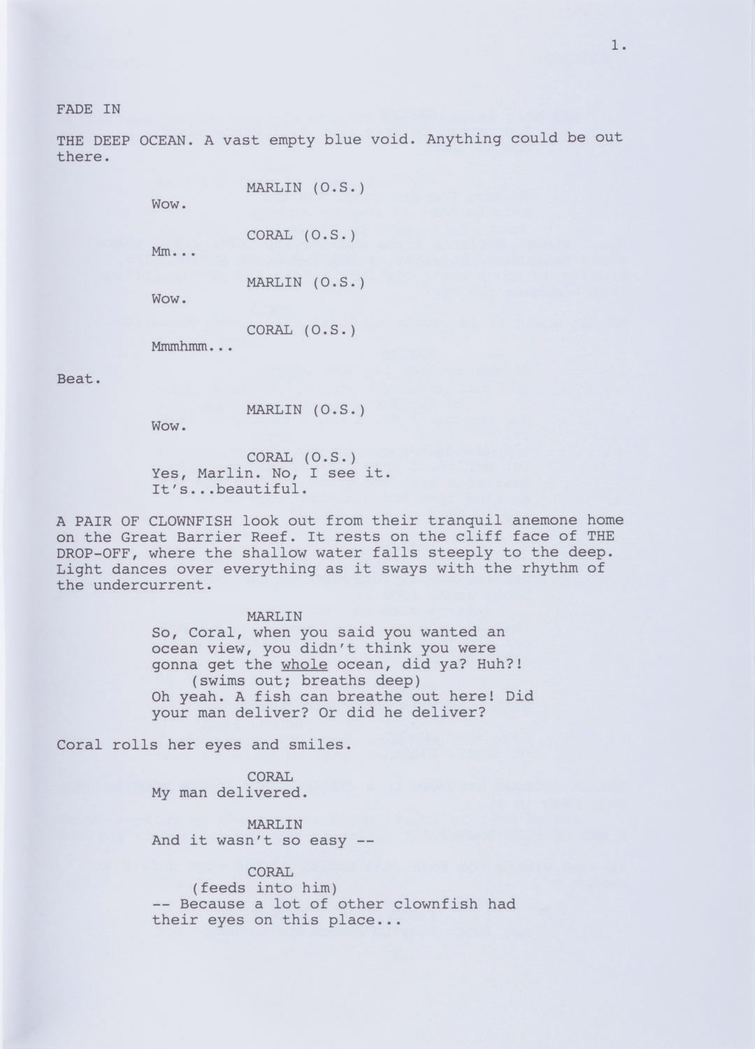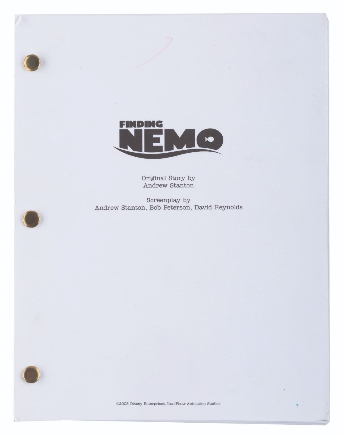 (Disney/Pixar, 2003) A For Your Consideration screenplay for"Finding Nemo," written by Andrew Stanton, Bob Peterson, and David Reynolds. The 141-page script was nominated for Best Original Screenplay at the Academy Awards, a rare feat for an animated film. Measuring 8.5" x 11", the screenplay is in very good condition with light handling wear, while the cover displays in good condition with scratches, edge wear, and light stains, with a stray red mark near the top and blue spots at the bottom right.