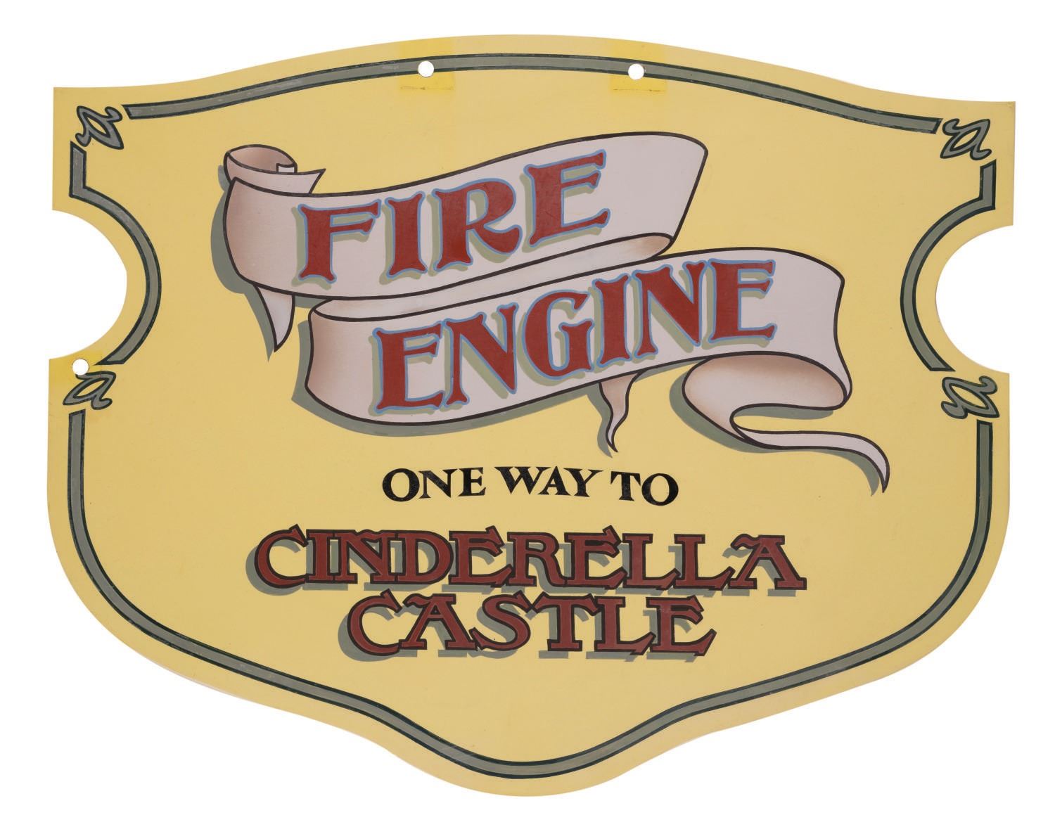 (Walt Disney World, 2000s) A sign for the Town Square boarding point to ride the Fire Engine to Cinderella Castle on Main Street at the Magic Kingdom. The badge-shaped sign reads the same on both sides with hand-painted turn-of-the-century typeface, and has holes at the top where it was suspended from a lamppost. Measuring 14.25"x17.75", the piece is in good condition with paint loss and surface wear to patina, oxidation, and scuffs from handling and outdoor Park display.