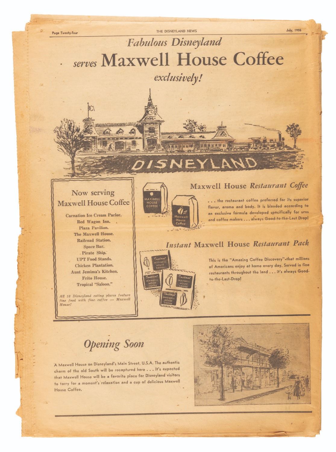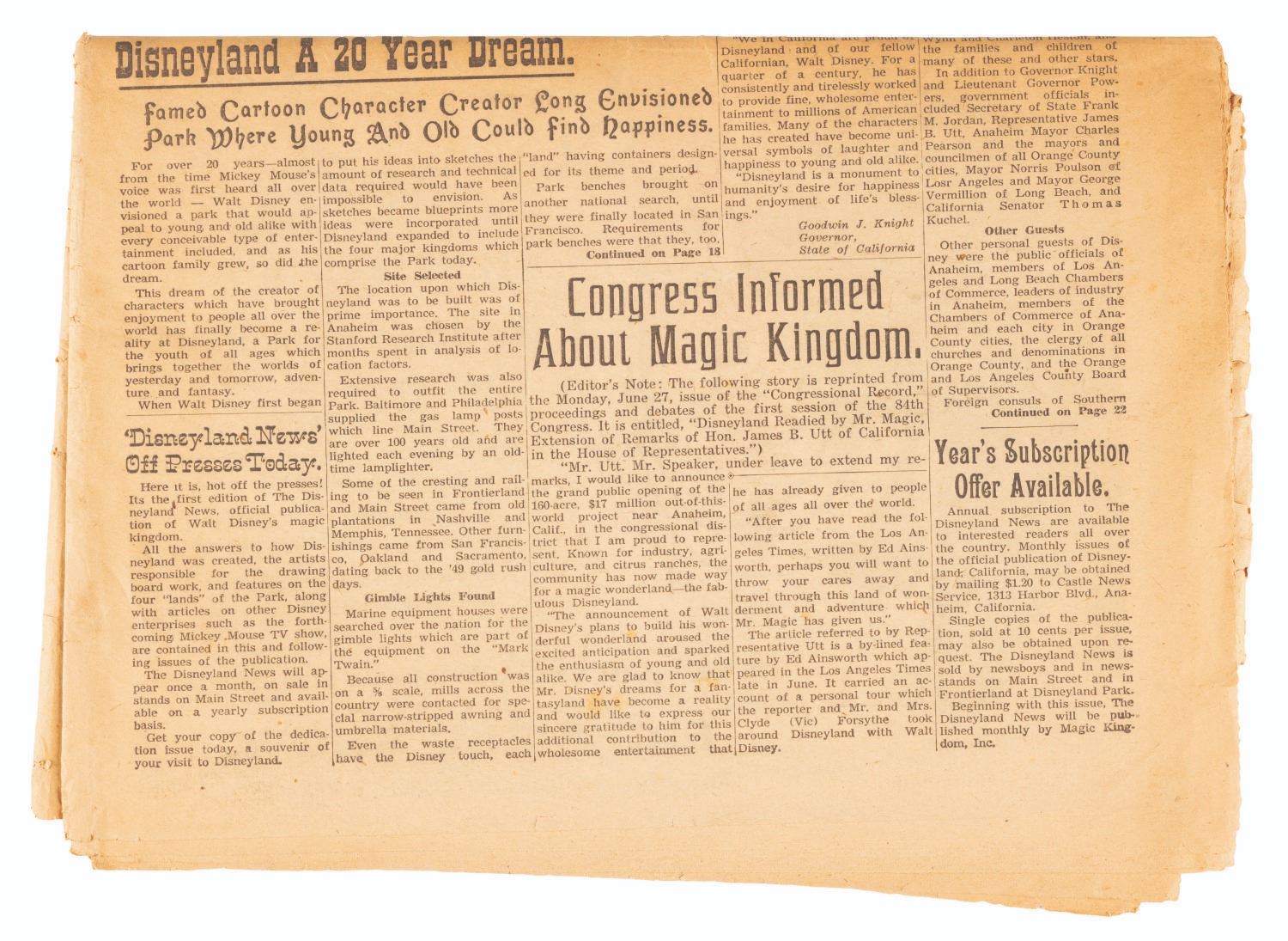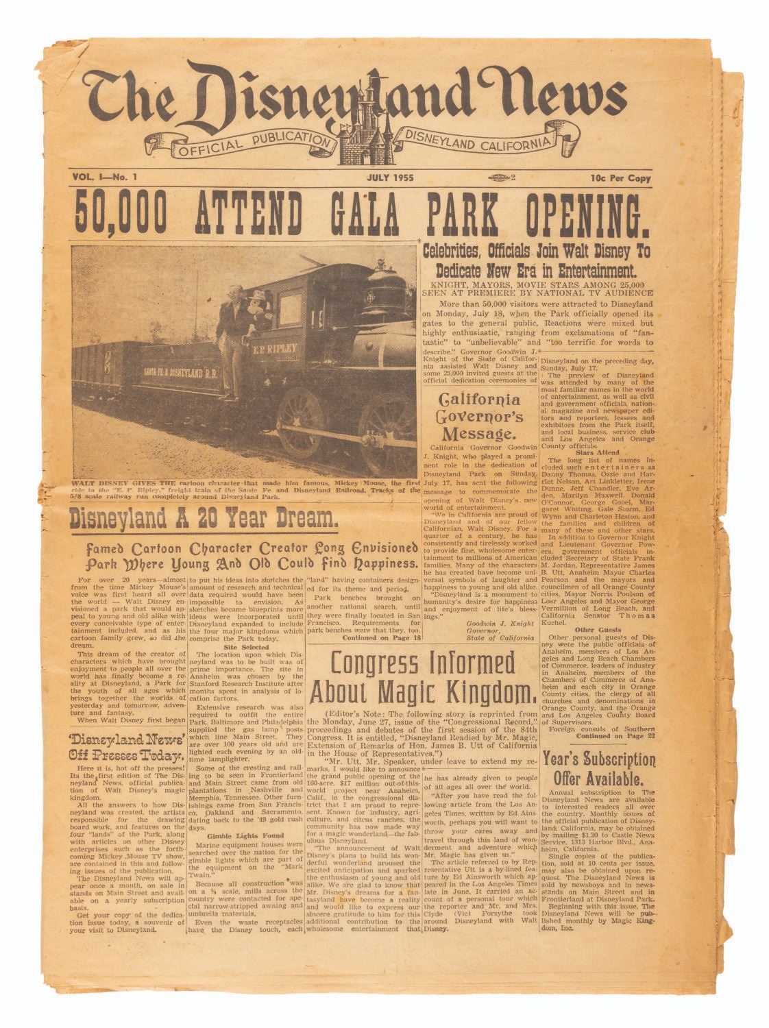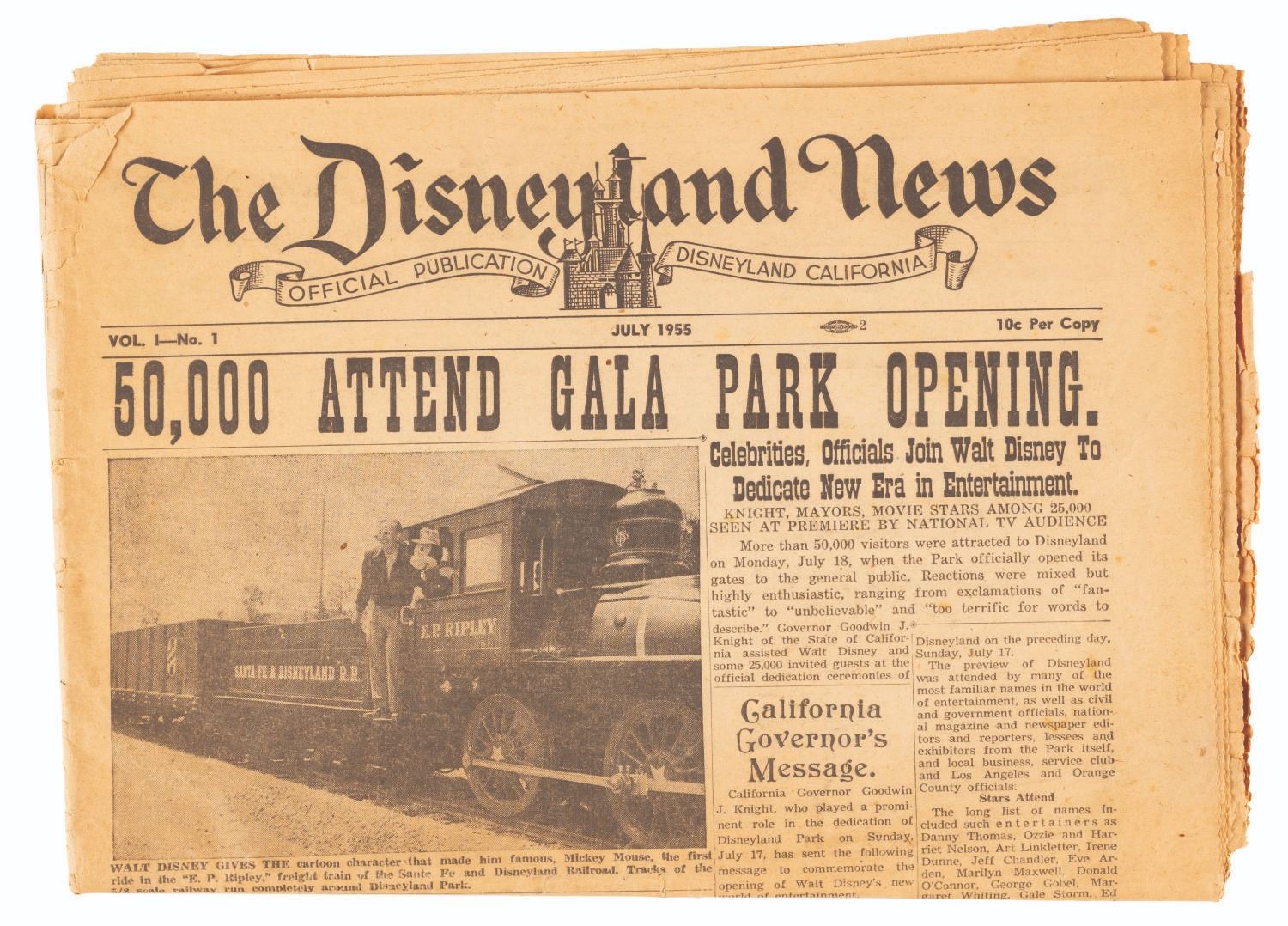 (Disneyland, 1955) A rare first issue of The Disneyland News from the Park's opening in July of 1955. This periodical was published within Disneyland and helmed by its newly appointed Editor-in-Chief, Marty Sklar. This premiere issue largely covers the planning and construction of Disneyland and features advertisements from vendors who helped make the Park's opening possible. These incredible early newspapers not only served to offer Disneyland's Guests the latest information on the Park and its features but also heavily supported the theme of Main Street being a functioning small town. Measuring 11.5” x 16" the 24-page newspaper is in fair condition with yellowing from age, paper separation at the crossfolds, creases from folds, and wear and tear to the edges from handling.