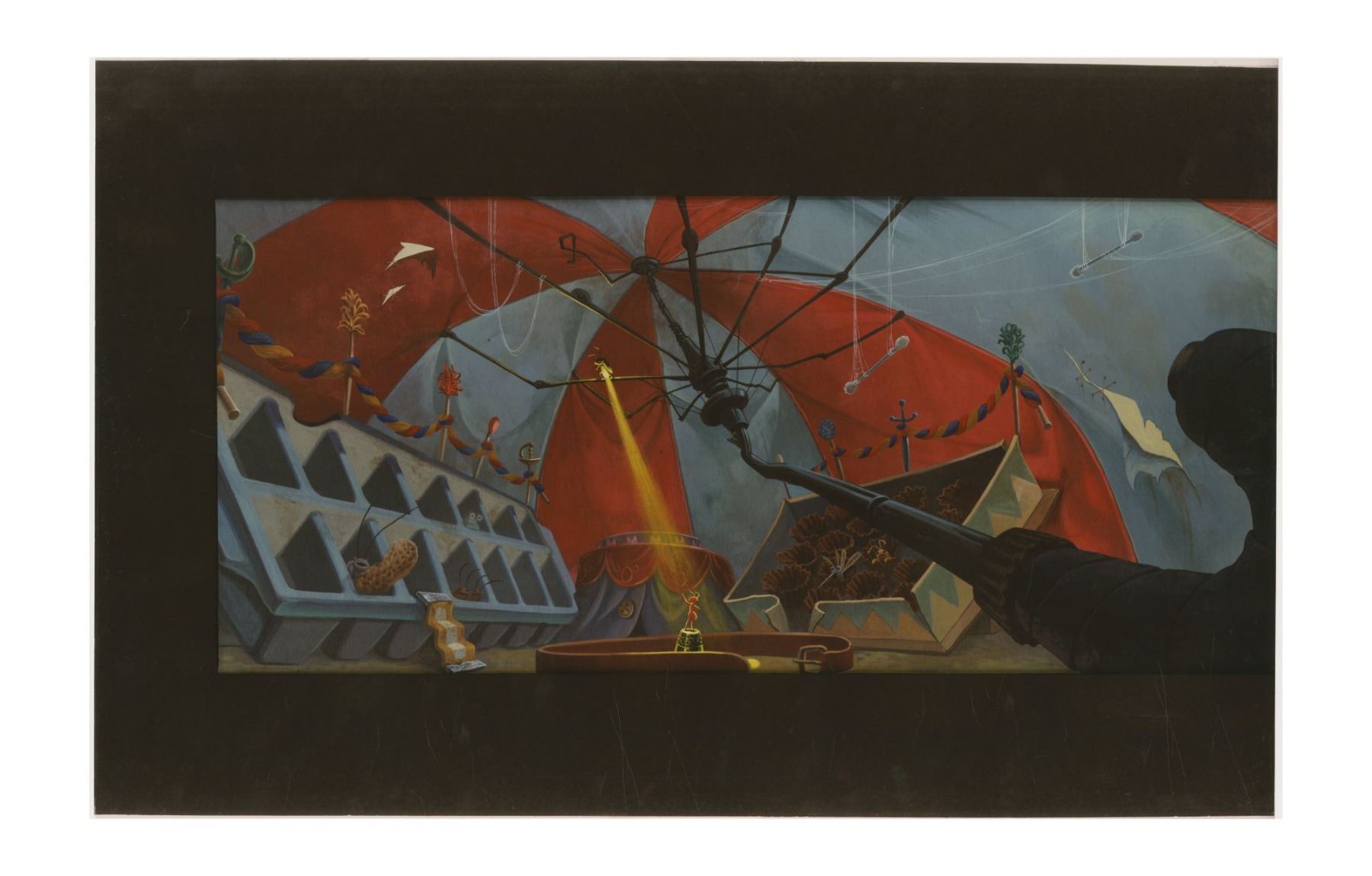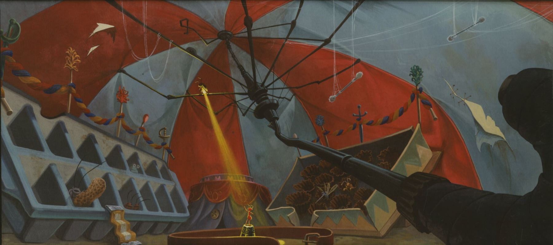 (Disney, 1990s) An original print of digital concept art from Pixar’s “A Bug's Life.” Featuring Flik at the bug circus, the concept was created at the studio and printed to be used during the development of the film and in pitch meetings. Measuring 11" x 17", the print is in fine condition with light wear from studio use.