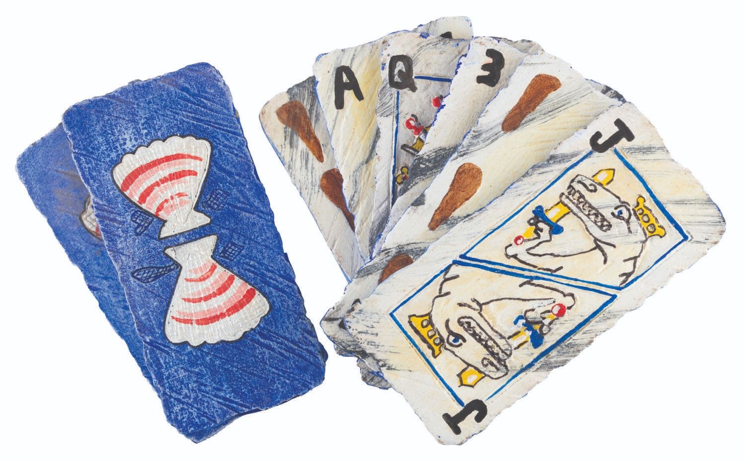 (Universal, 2000) A collection of eight blue playing card props from “The Flintstones in Viva Rock Vegas,” for a “club” deck featuring caveman clubs on one side and clams on the reverse. Included are a 3, 5, 6, 7, 9, Ace, and a Jack and Queen with dinosaur designs. Measuring 3.5” x 7.25” each, the resin hand-painted playing card props are in good to very good condition with typical paint loss, scuffs, and wear from production use.