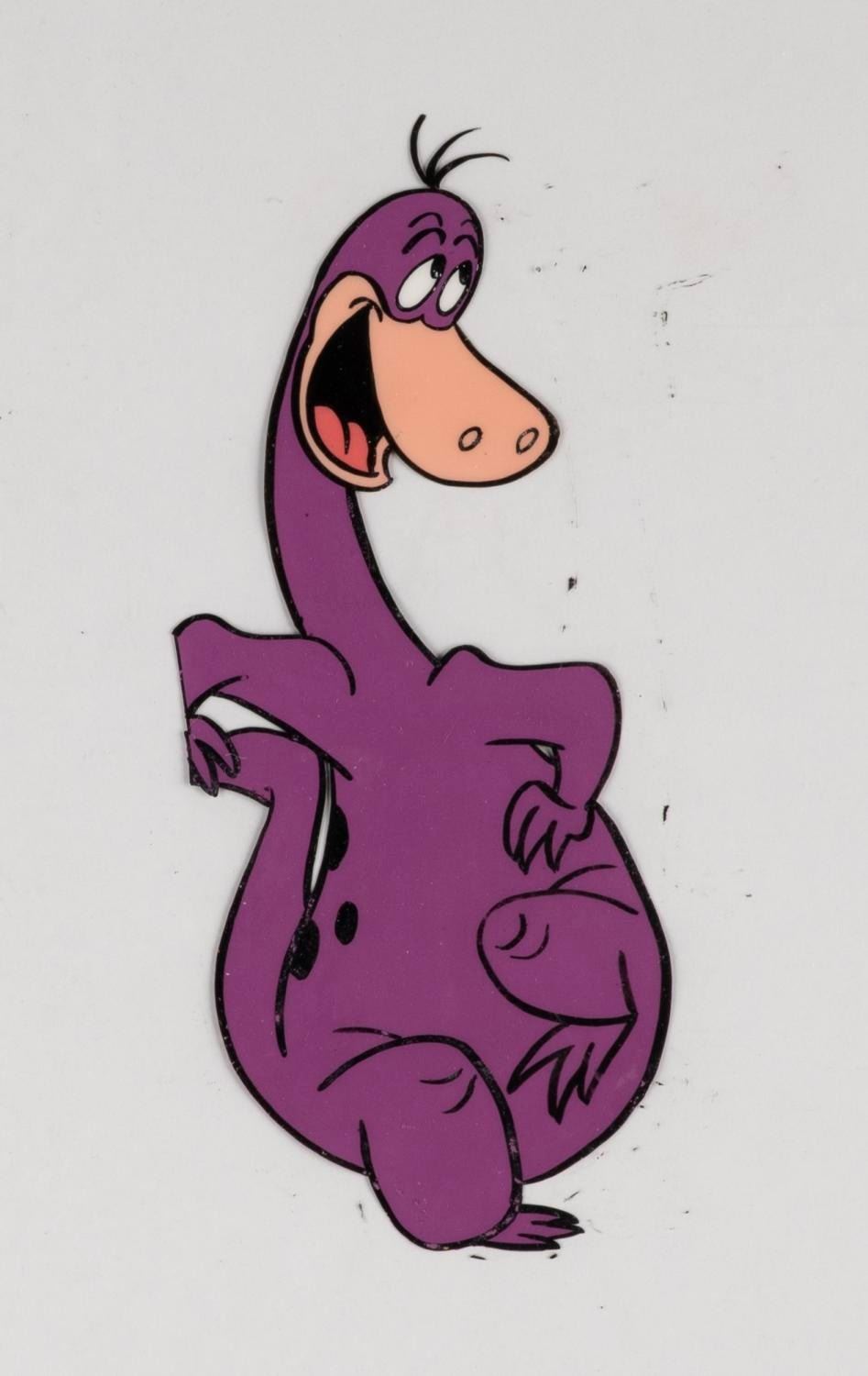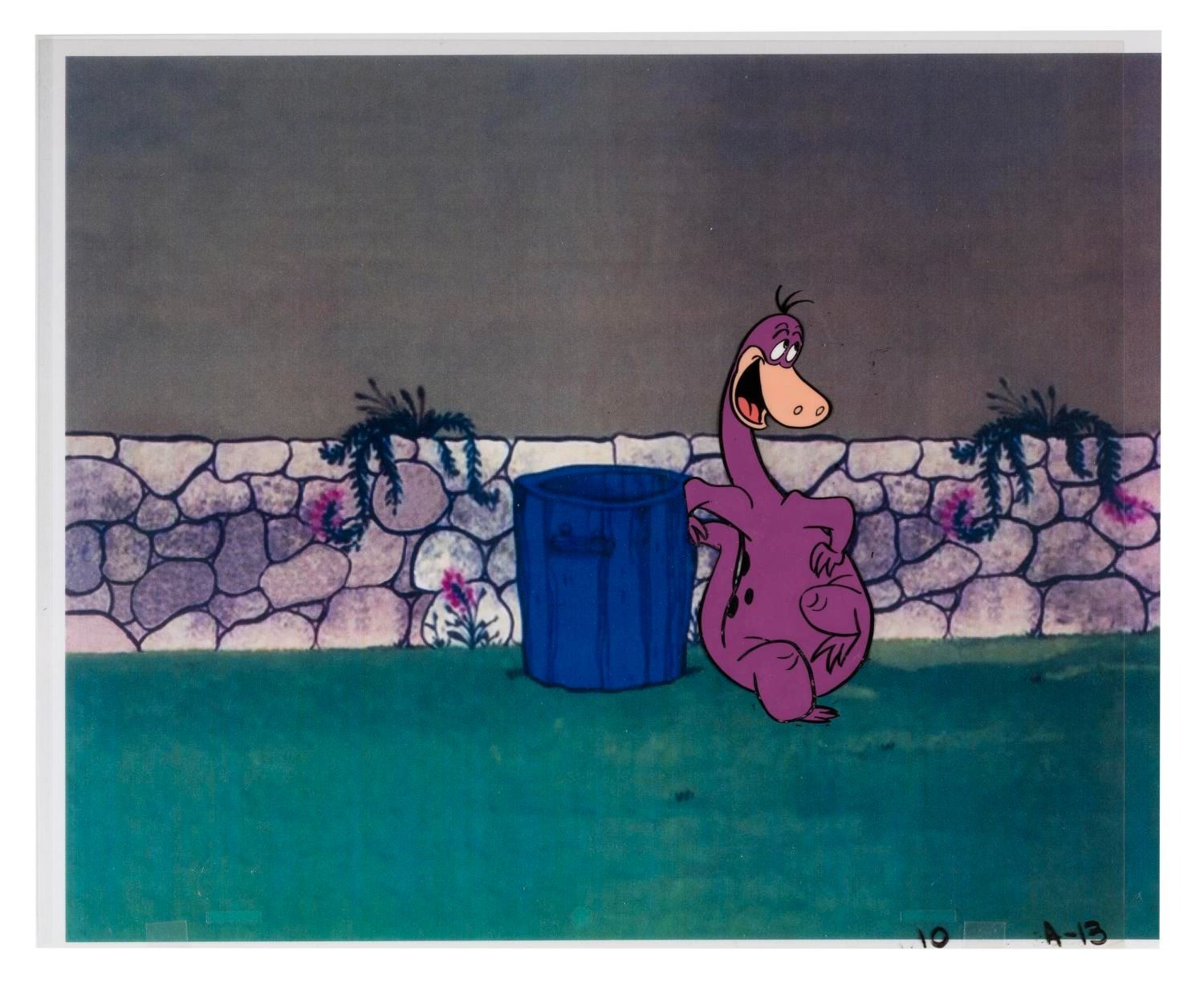 (Hanna Barbera, 1960-1966) An original production cel of Dino from “The Flintstones.” The character has an image of 2.25” x 5” on a 10.5” x 12.5” cel, and has been paired with a 10.75” x 13” reproduction color copy background for presentation purposes. The cel displays in very good condition with light paint loss, scratches, smudges, and wear from production use.