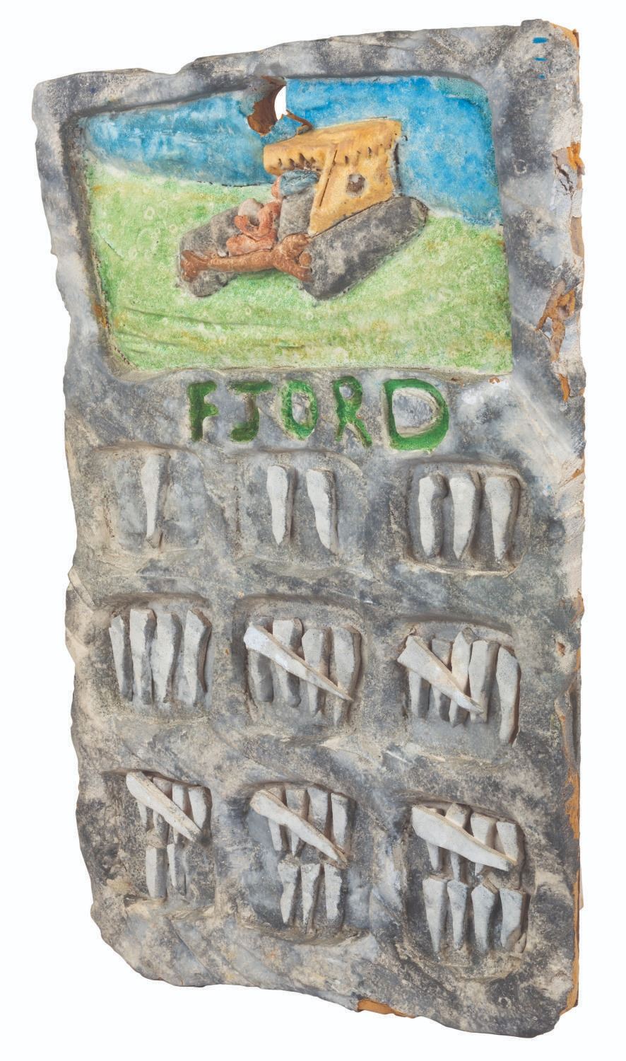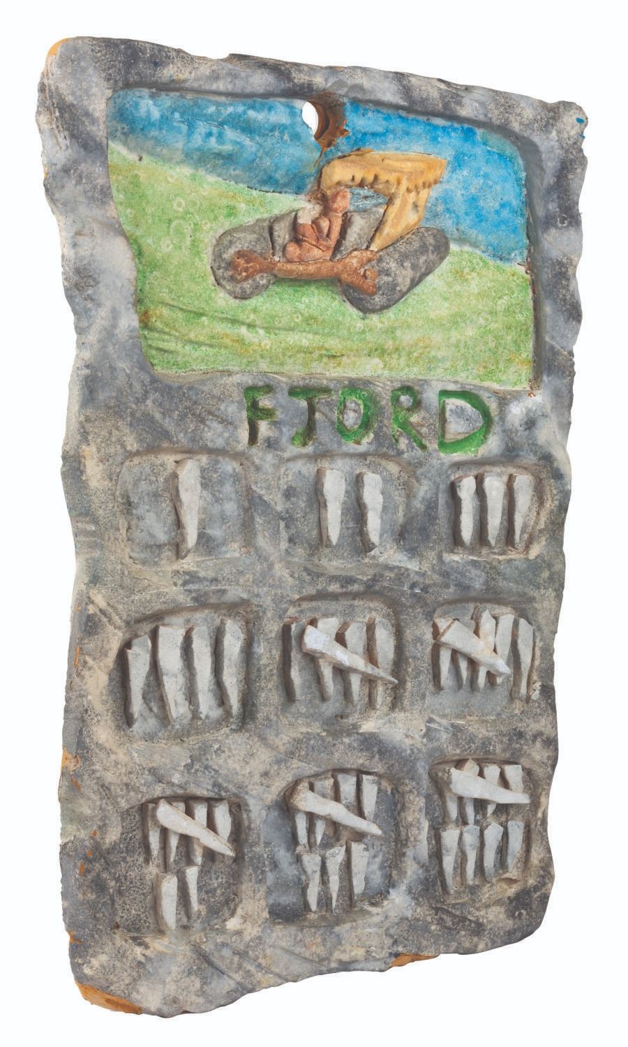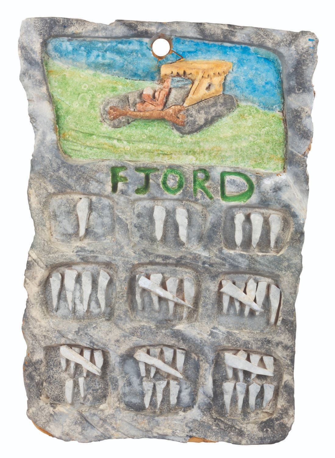 (Universal, 1994) A calendar prop from the live-action “The Flintstones,” with a “Fjord” car pictured. Measuring 25” x 2” x 36” tall, the foam-cast prop displays in good condition with material loss, paint loss, light cracks, and wear from production use.