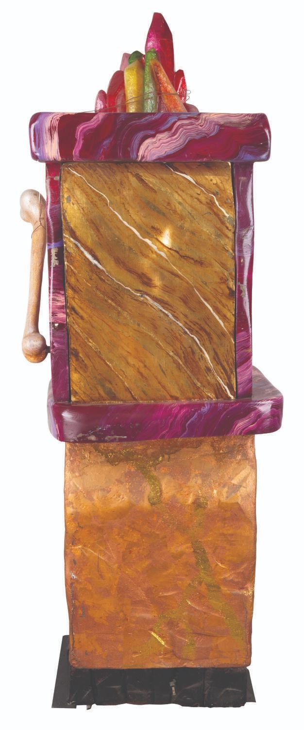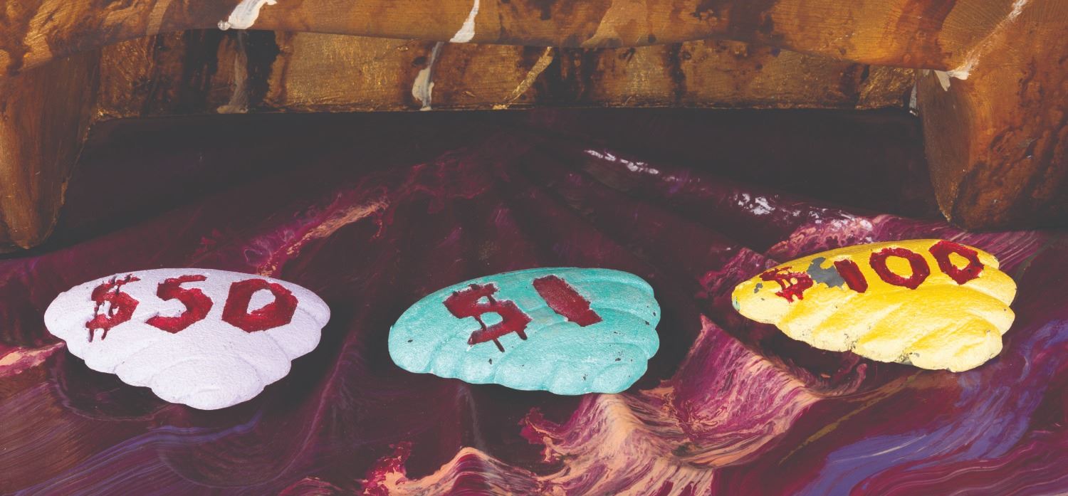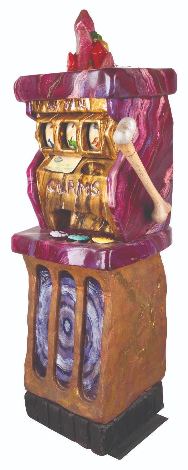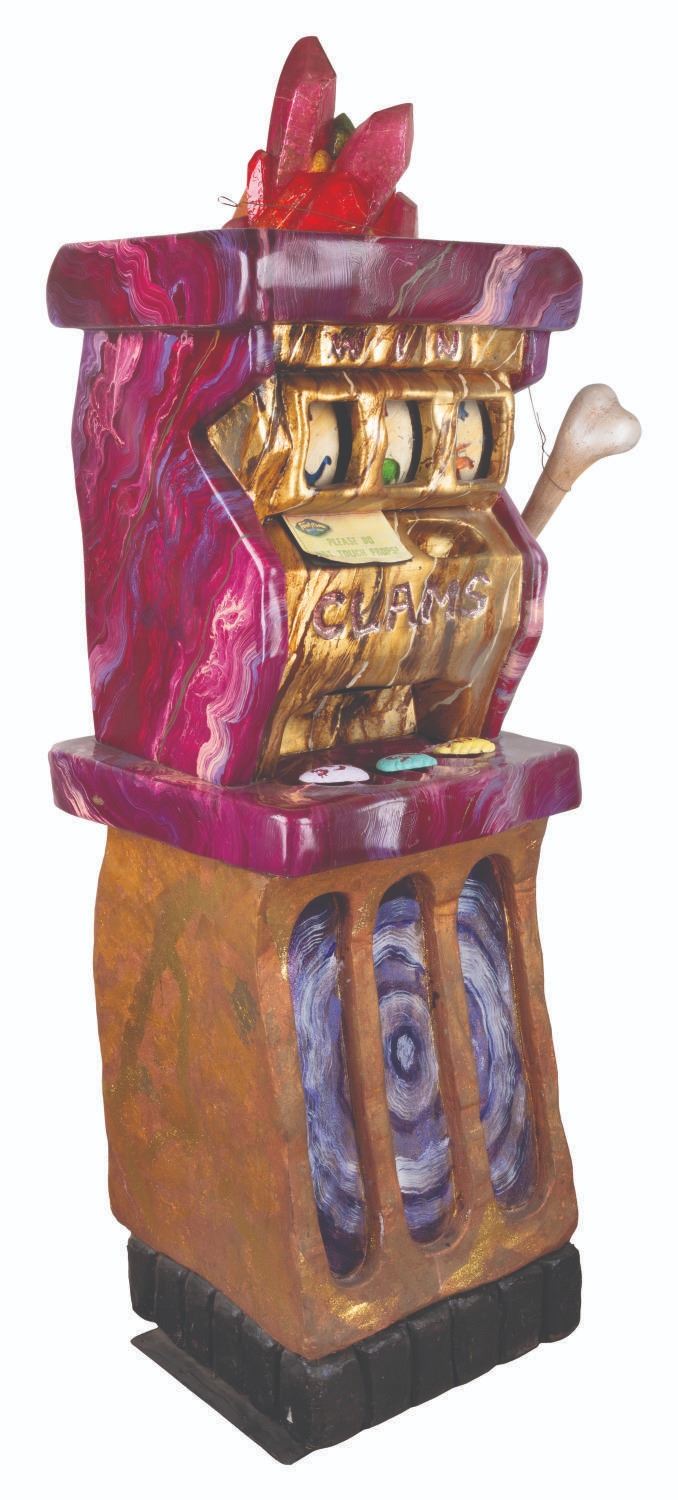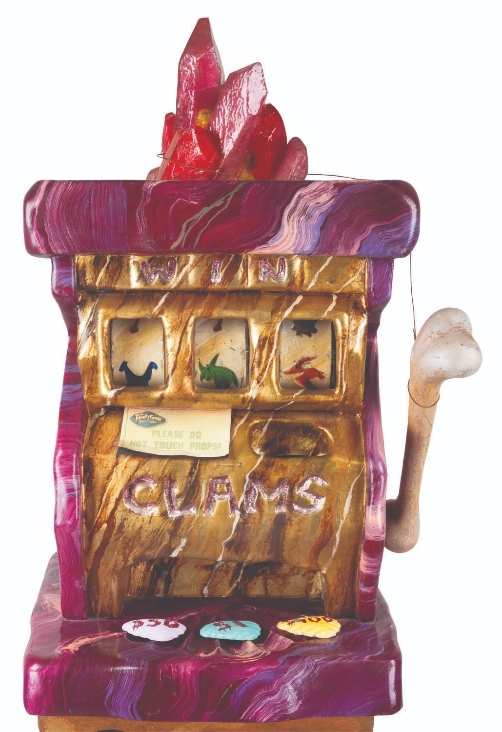(Universal, 2000) A slot machine prop from the live-action sequel “The Flinstones in Viva Rock Vegas.” The impressive fiberglass and resin game machine is hand-painted with colorful dinosaurs on the reels, a bone lever, and “Win clams” engraved on the front. The machine prop’s reels are meant for display only and do not spin. Also included are three production-used $1, $50, and $100 plaster clam props. Measuring 22” x 24” x 77” tall and 3” x 4.25” each, the slot machine and clams are in very good condition with typical scuffs, wear, spots of paint loss, and wear from production use. Due to size and weight, special shipping arrangements are required. Please inquire before bidding.