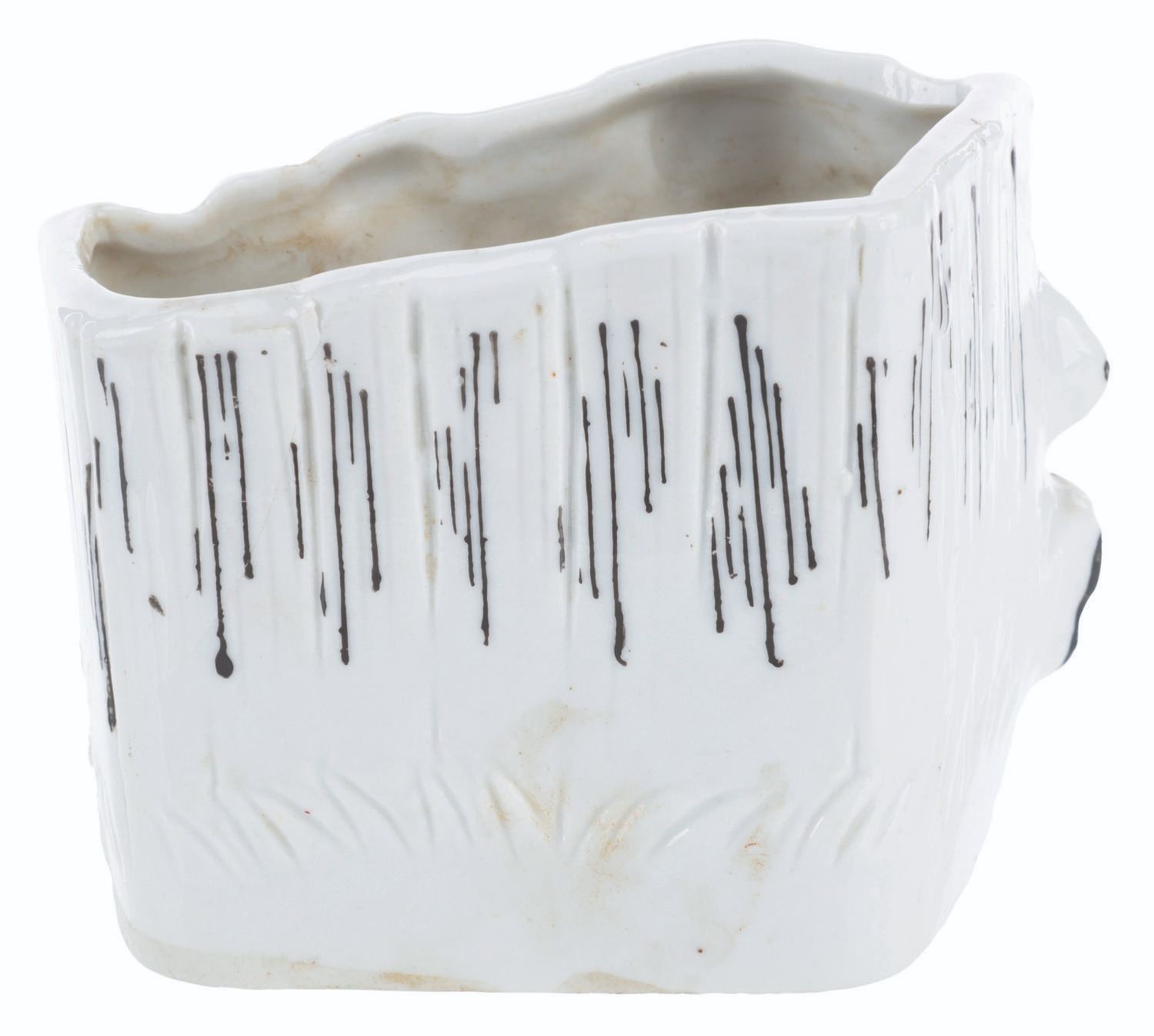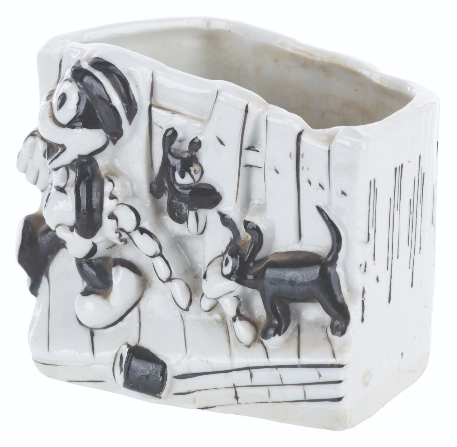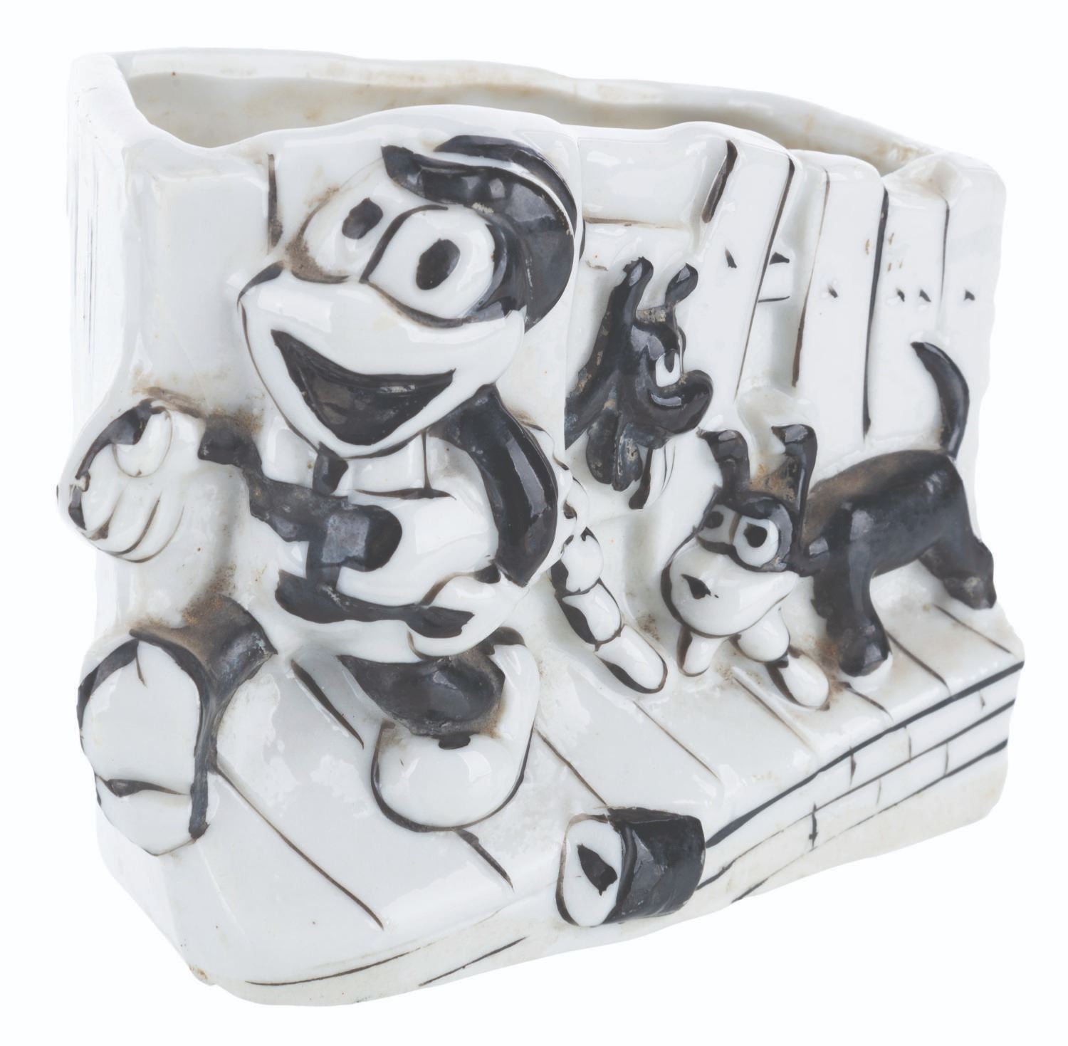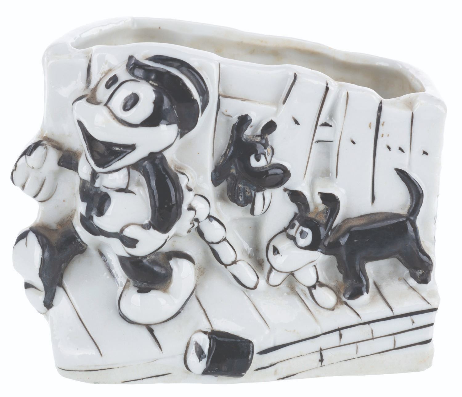 (Japan, 1930s) A Flip the Frog ceramic planter manufactured in Japan in the 1930s. Measuring 3” x 4.25” x 3” tall, the planter is in good condition with paint loss, stains, discoloration, unfinished glaze near the bottom, and spots of bubbling from the production process. Ub Iwerks, the animator chiefly responsible for the design and animation of the first 15 Mickey Mouse shorts, left the Disney Studio in 1930 after a falling out with Walt. Ub set up Iwerks Studio to produce a series of cartoons with all new characters, most famously, Flip the Frog. Flip starred in only 15 cartoons over a period of three years before being dropped by distributor MGM. Unlike his contemporary rival, Mickey Mouse, merchandise featuring the character is incredibly rare, particularly pieces in good condition such as the ones offered here.