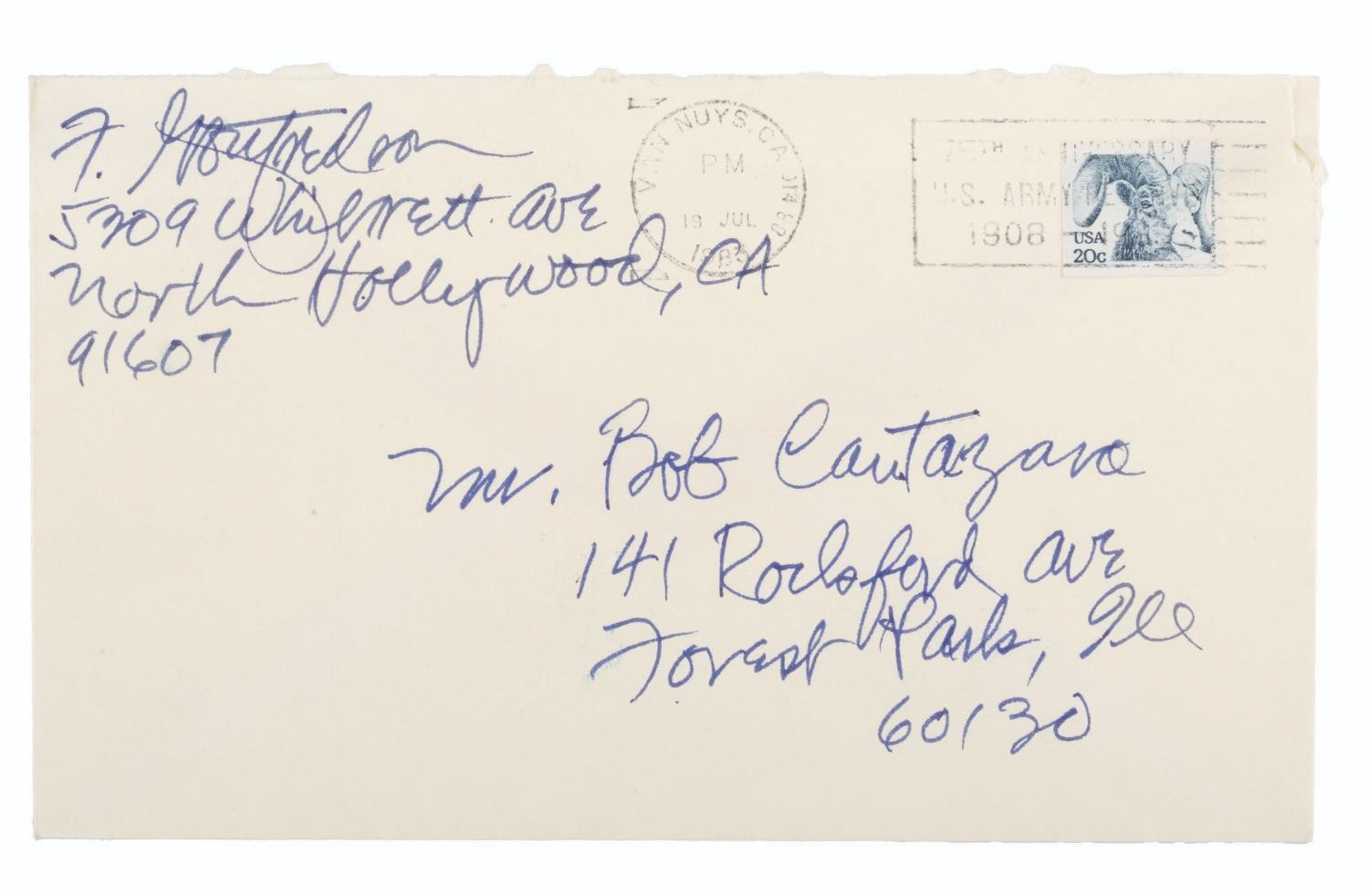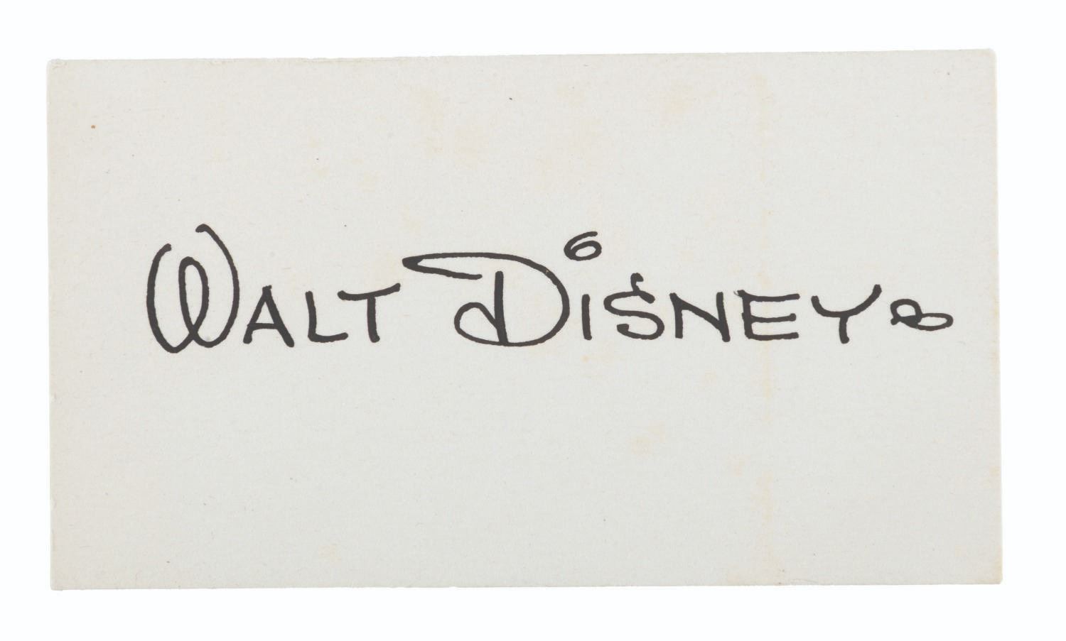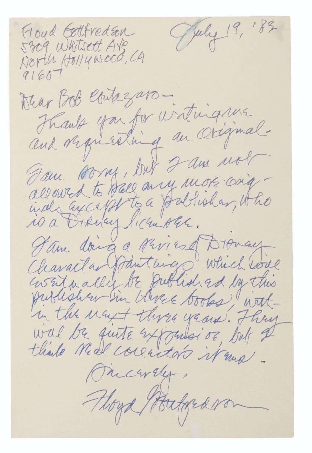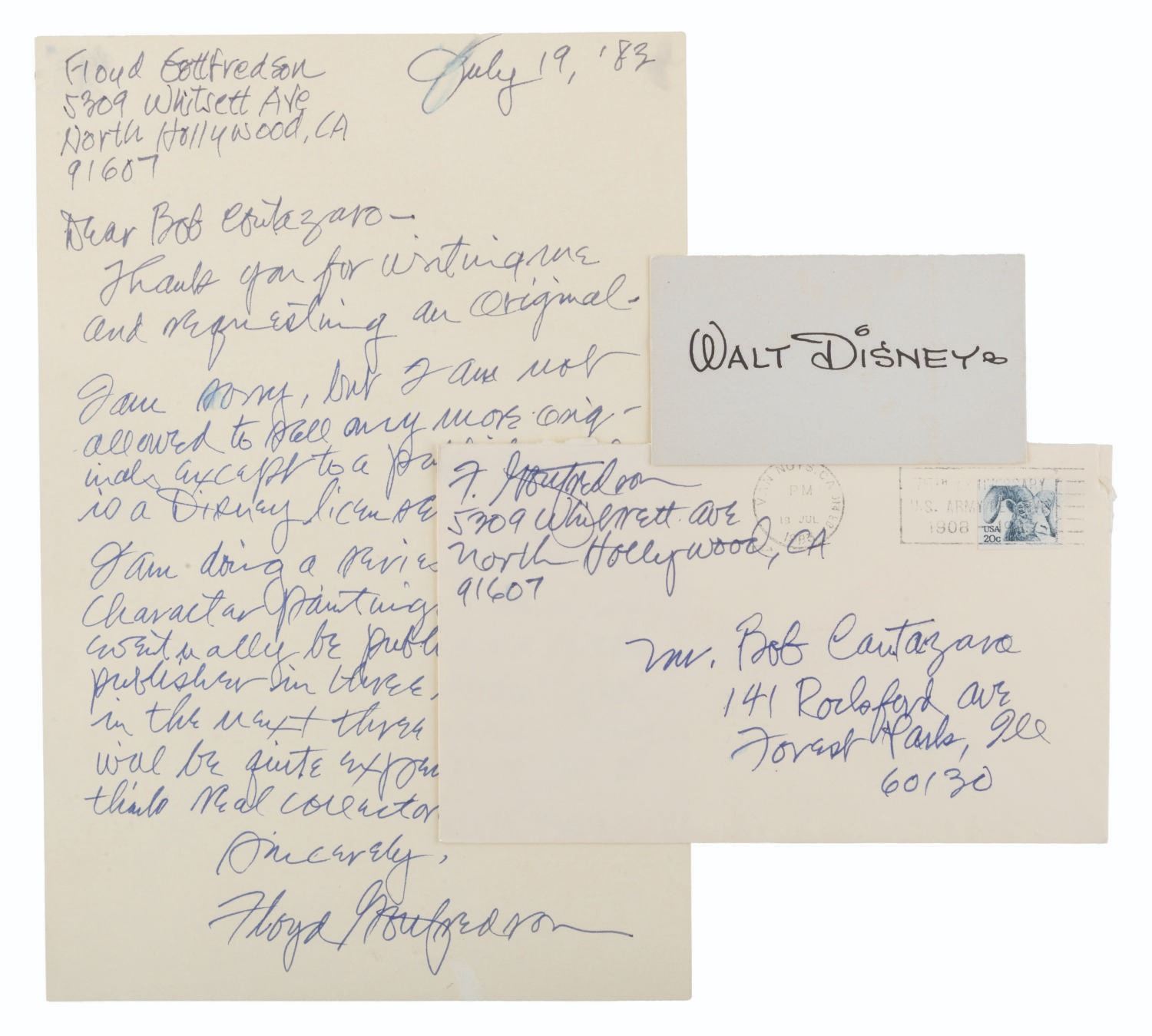 (Gottfredson, 1983) An original hand-written letter, envelope, and Walt Disney "signature" card by Floyd Gottfredson. Gottfredson was the artist and writer chiefly responsible for the Mickey Mouse daily newspaper comic strip from 1930 through 1975. The hand-signed card by Gottfredson is the faux Walt Disney signature he would use on the strips. The items measure between 2.25" x 3.74" to 6.5" x 10" and are in good to very good condition with light edge wear and a smudge on the letter’s date.