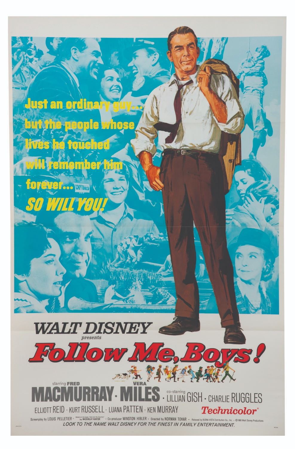 (Disney, 1966) An original release one sheet poster for Walt Disney's "Follow Me Boys!" This poster depicts the cast of the film - Fred MacMurray, Vera Miles, Lillian Gish, and Kurt Russell. Measuring 27"x41", this poster is in very good condition with original folds and a few faint creases and minor wear along its edges.