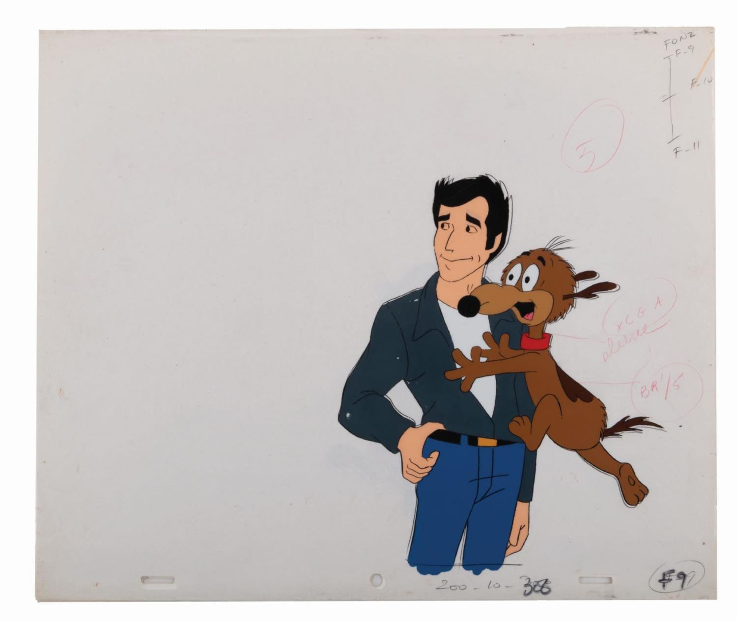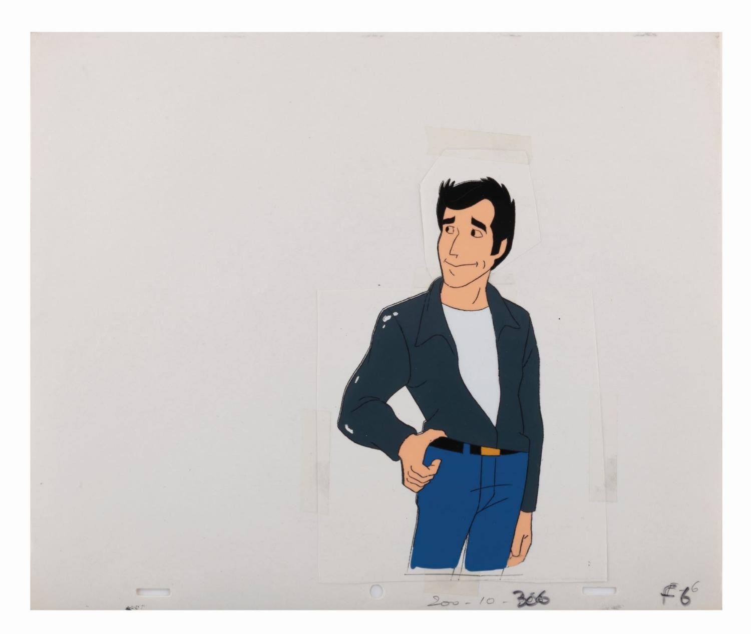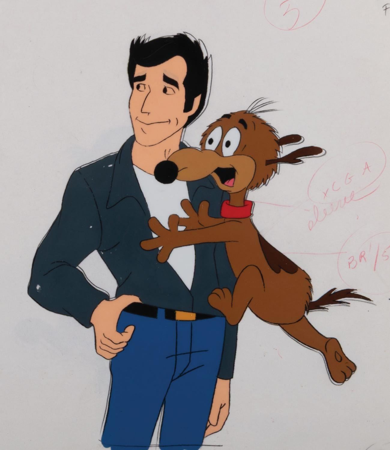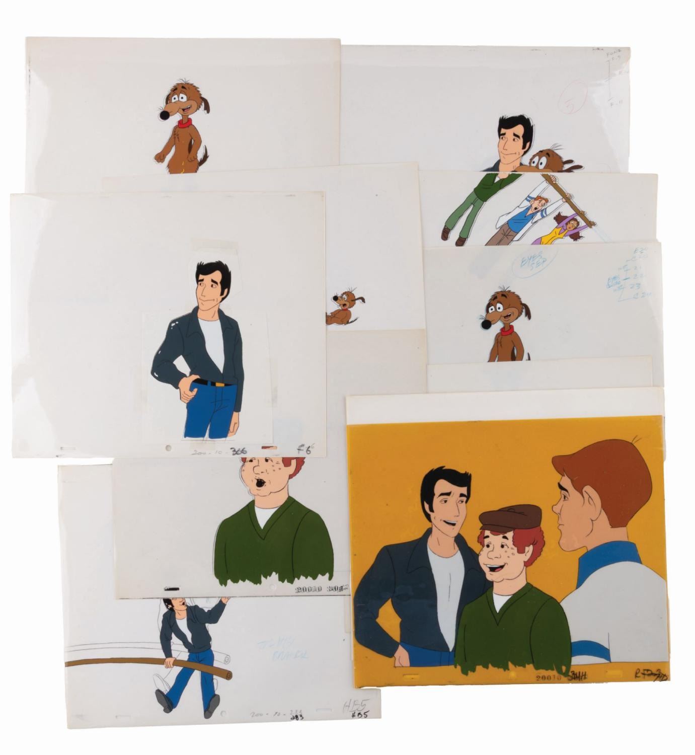 (Hanna-Barbera, 1980s) A collection of production cels and drawings from "Fonz and the Happy Day Gang" featuring The Fonz, Richie, Ralph, Cupcake, and Cool the dog. Included are 17 cels, some of which are eye, mouth, or effects layers, and 14 production drawings. Measuring 10.5" x 12.5", the cels and pencil drawings are in good, production-used condition with light discoloration, soiling, and spots where the cels have adhered to the drawing.