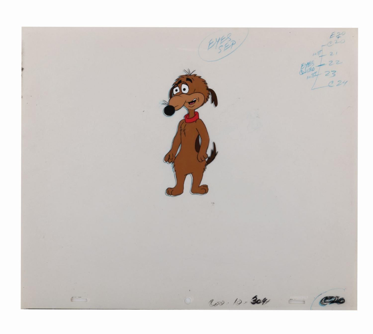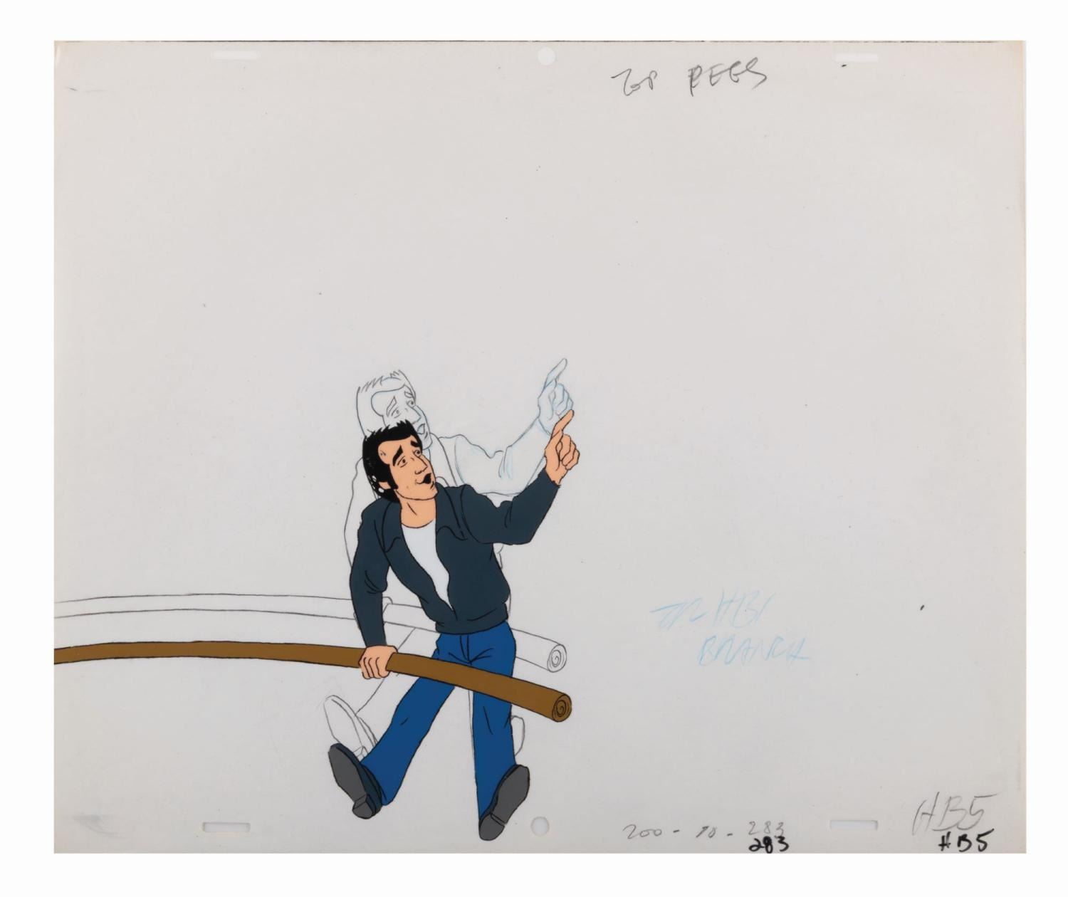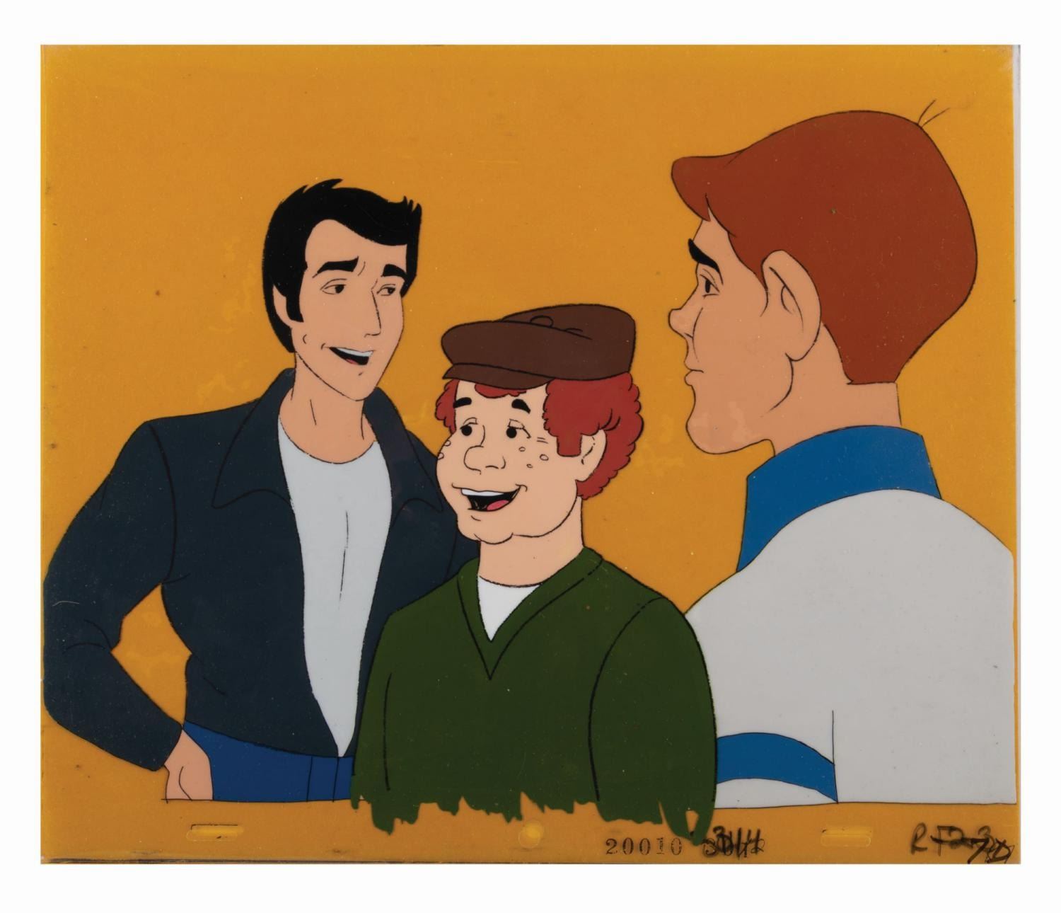 (Hanna-Barbera, 1980s) A collection of production cels and drawings from "Fonz and the Happy Day Gang" featuring The Fonz, Richie, Ralph, Cupcake, and Cool the dog. Included are 17 cels, some of which are eye, mouth, or effects layers, and 14 production drawings. Measuring 10.5" x 12.5", the cels and pencil drawings are in good, production-used condition with light discoloration, soiling, and spots where the cels have adhered to the drawing.