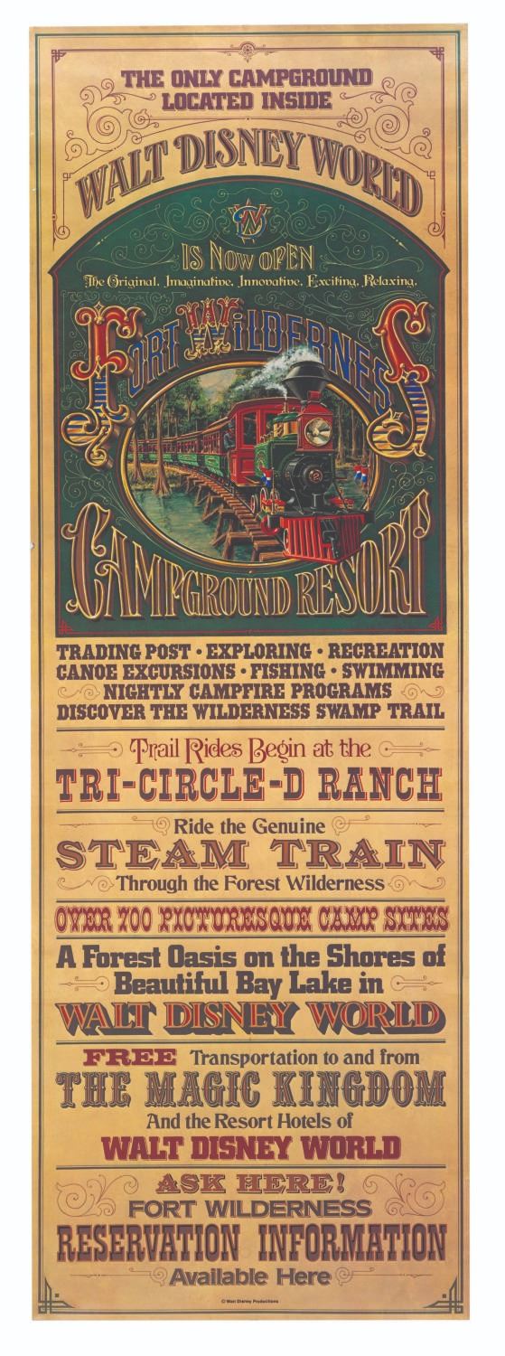 (Walt Disney World, 1971) A rare attraction poster for the opening of the Fort Wilderness Campground Resort at Walt Disney World. Inspired by 19th-century railroad advertisements, the poster promotes other attractions like the Wilderness Swamp Trail, canoe excursions, and the Fort Wilderness Railroad as envisioned by Walt Disney Imagineer Bob McDonnell. Measuring 15.5" x 46", the poster is in very good condition with light edge wear, some slight wrinkling, and tape residue on the reverse from display.