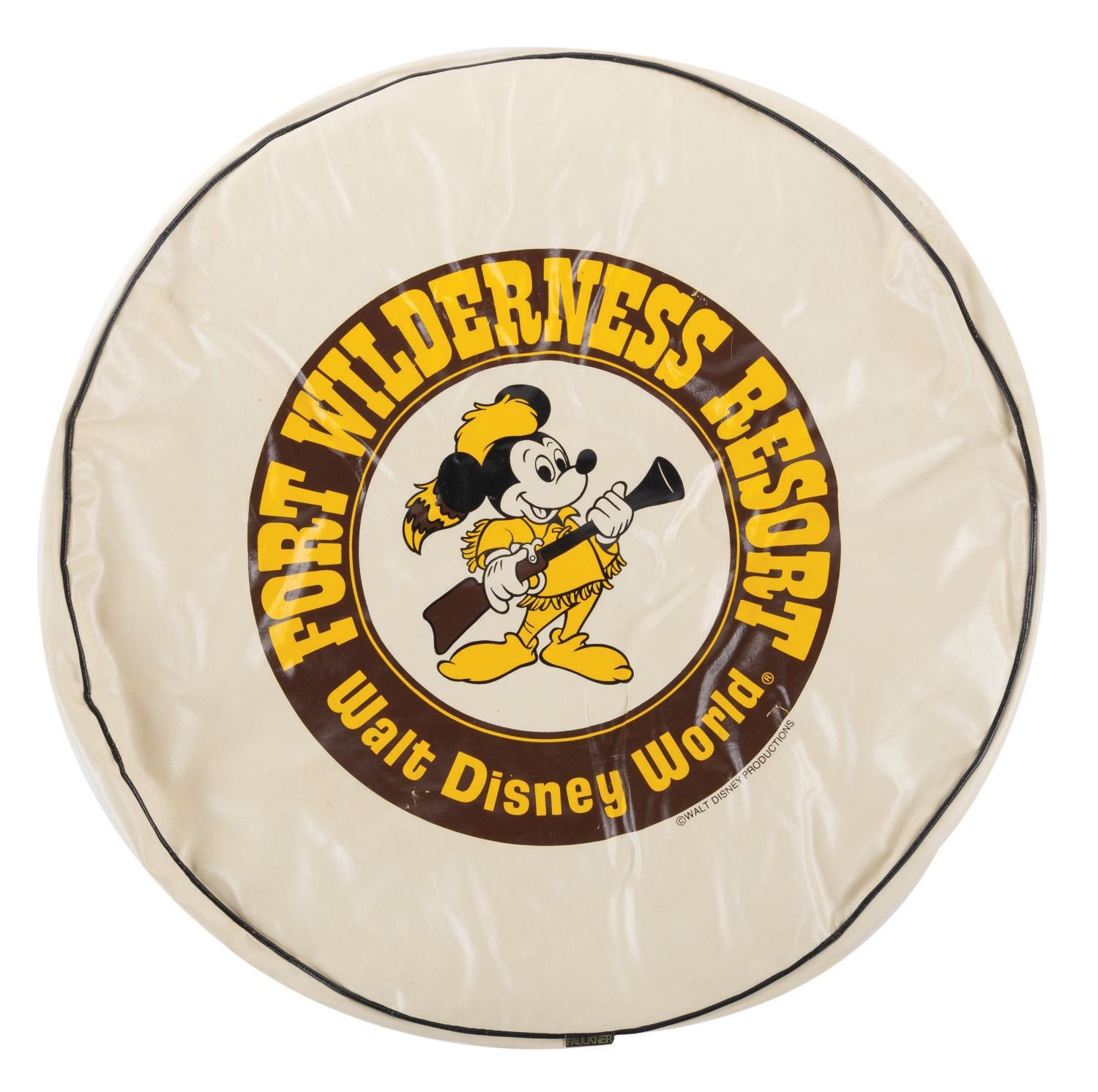 (Fort Wilderness, 1971) A vintage 1970s Fort Wilderness Resort & Campground Tire Cover. The cover features the original logo from the Campground. This logo was retired when a new gun-less logo was introduced. Measuring 27" in diameter and 12" wide, the piece is in very good condition with few creases, spots of discoloration, and signs of wear from handling or age.