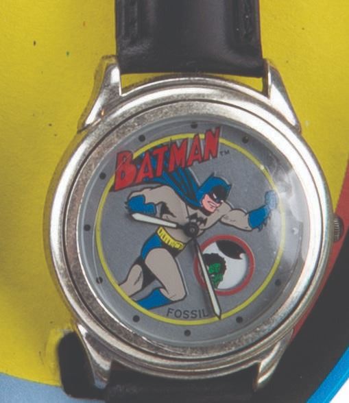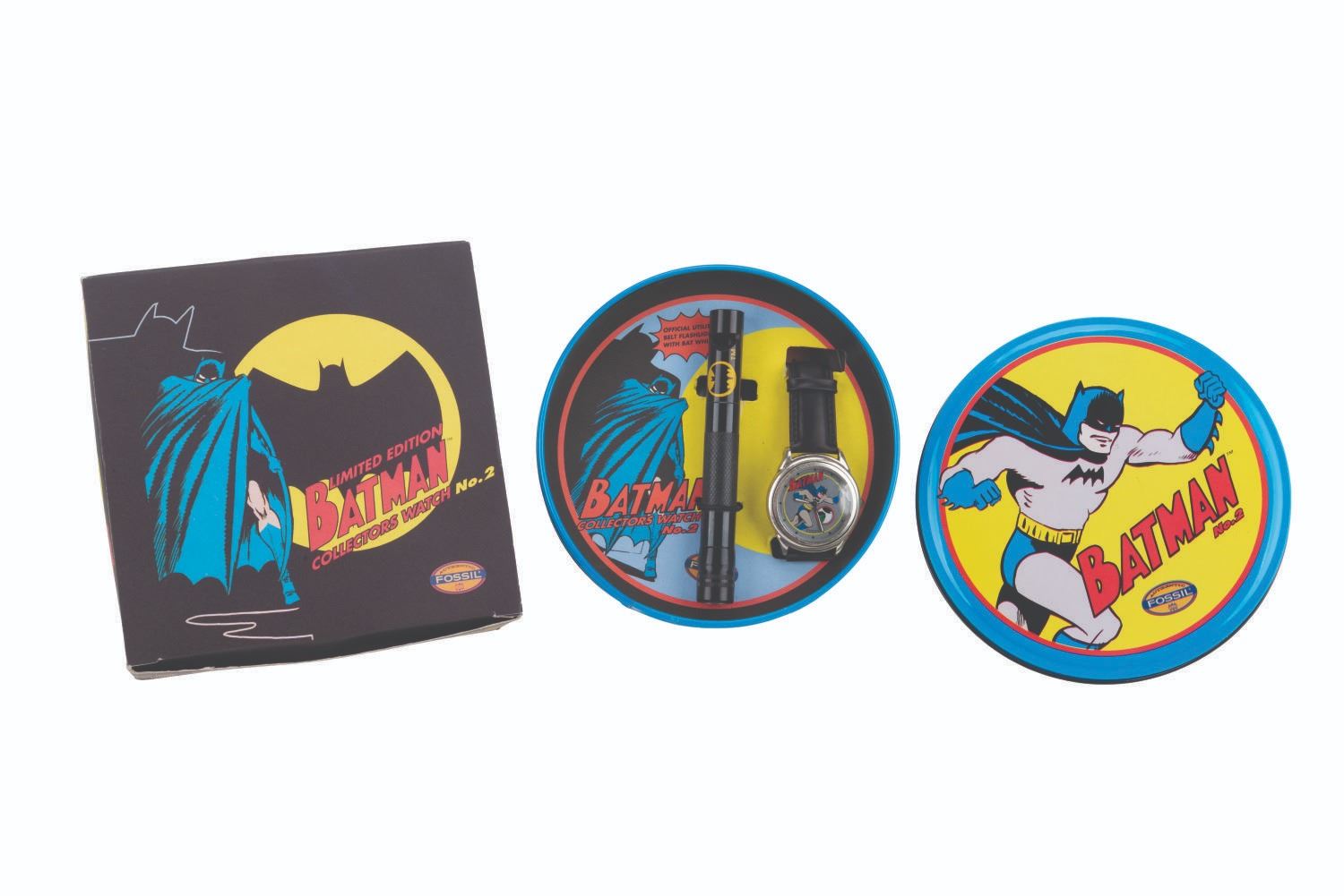 (Fossil, 1994) A Batman No.2 Collector's Watch and flashlight with whistle from Fossil, including the original box and circular tin. The watch and flashlight are in fine, as-new condition, requiring a battery and possibly service to function. Measuring 2.25 " x 5.5 " x 5.5 ", the original box and tin are in very good condition with light wear from handling and age.