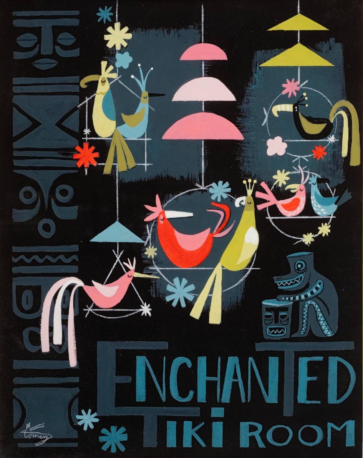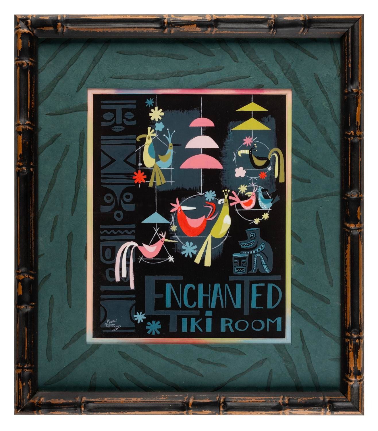 (Disney, 2010s) A framed WonderGround Gallery Enchanted Tiki Room print designed by El Gato Gomez. Measuring 8.5" x 11" in a 14" x 16.25" matte of a 15.5" x 17.75" bamboo-inspired frame, the art is in very good condition with intentional distress on the matte and light wear.