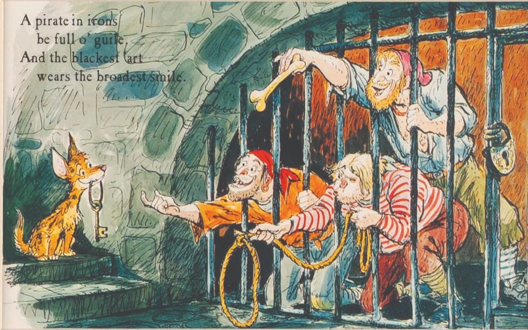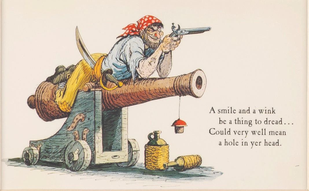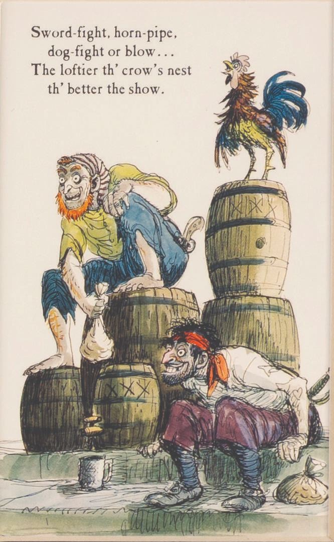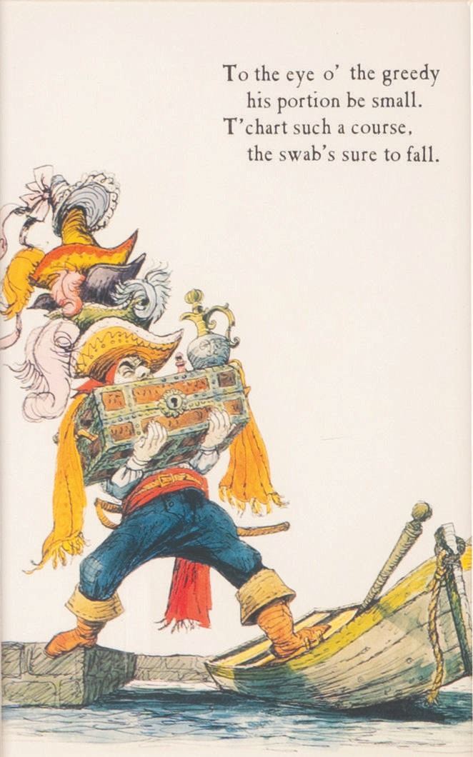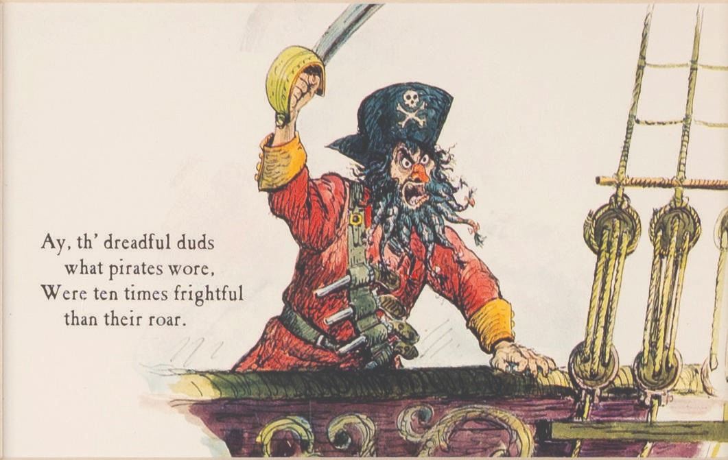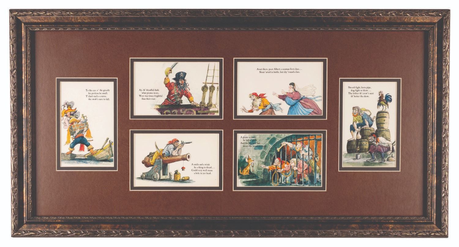 (Disneyland, 1960s) A framed collection of 6 souvenir Pirates of the Caribbean postcards featuring Disney Legend Marc Davis’ concept art for the attraction. Each 5.5” x 3.5” postcard is in fine condition presented in a 14.25” x 27.25” framed matte. The frame displays in good condition with two splits along the center of the bottom molding and upper right corner which may affect the structural integrity. Due to size and weight, this item requires special shipping arrangements. Please inquire before bidding.