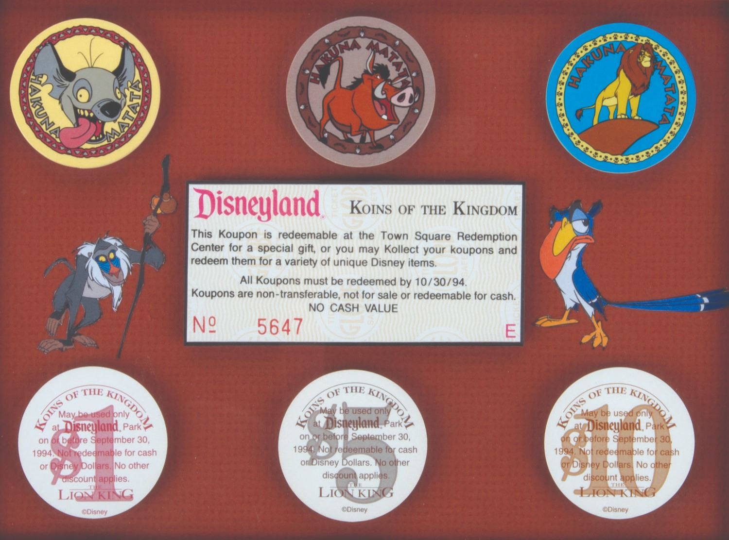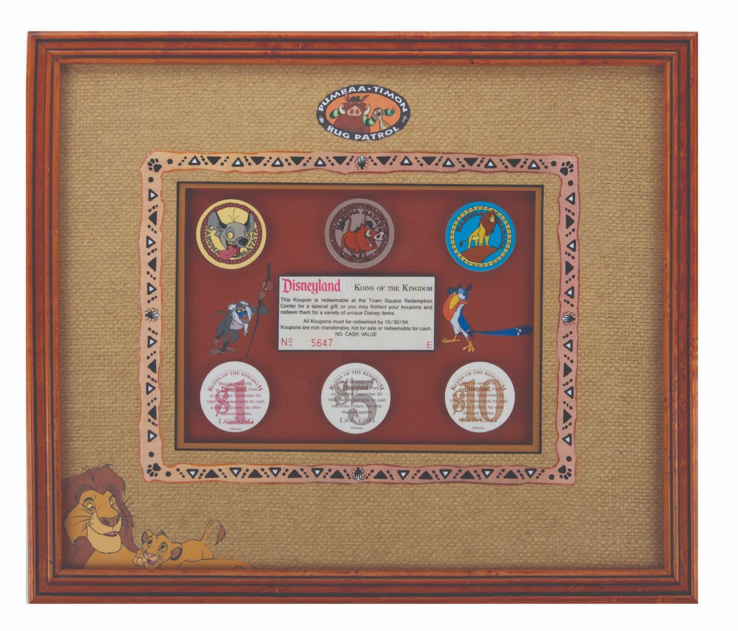 (Disneyland, 1994) A custom-framed set of six rare "Koins of the Kingdom" redemption coins from Disneyland. These tokens were part of the Park's tie-in promotion with Disney's "The Lion King." The "koins" were available for purchase by Annual Passholders, and redeemed for food and merchandise no later than September 30, 1994. The "Koins" measure 1.25" in diameter each and are mounted for display (with a "Koins of the Kingdom" "Koupon"). The framed piece measures 13.5"x15.5" and is in fine condition.