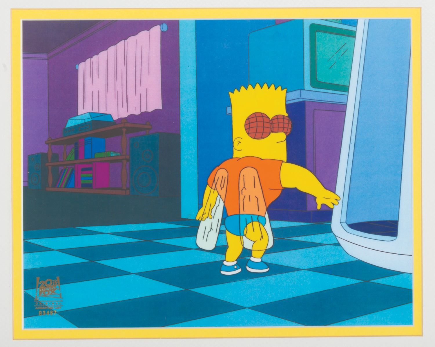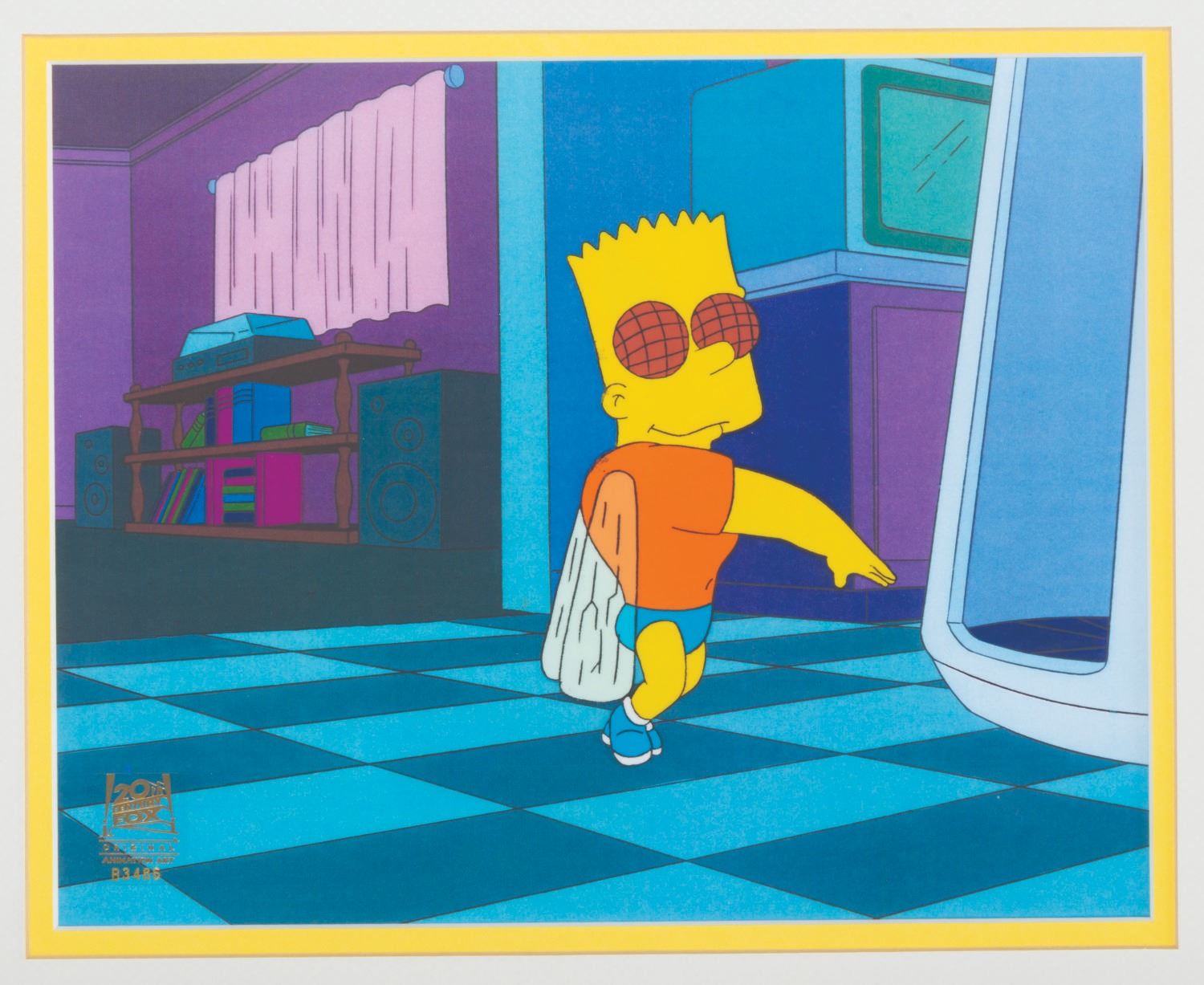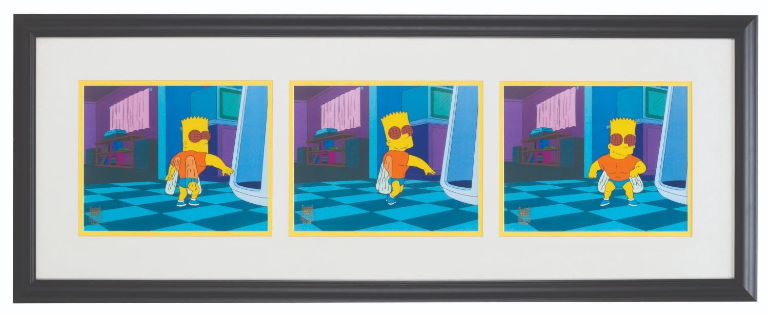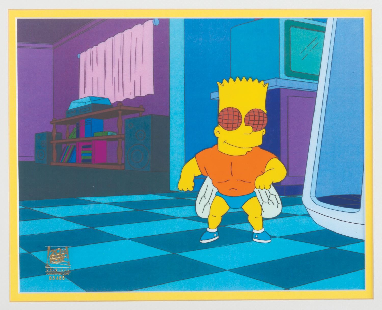 (Fox, 1997) A framed set of three"The Simpsons" production cels from the personal collection of the voice of Bart, Nancy Cartwright. The hand-painted cels are from the "Fly vs. Fly" segment of "Treehouse of Horror VIII," when Bart imagines himself becoming a mutant superhero. Bart's image size ranges from 3.5" x 5.5" to 4" x 5.25" on 8.5" x 11" visible cels, paired with color copy backgrounds. The entire framed and matted piece measures 17.25" x 44.5". The art is in very good condition with spots of paint loss, light line loss, and wear from production use, while the frame displays in very good condition with light wear to the matte.