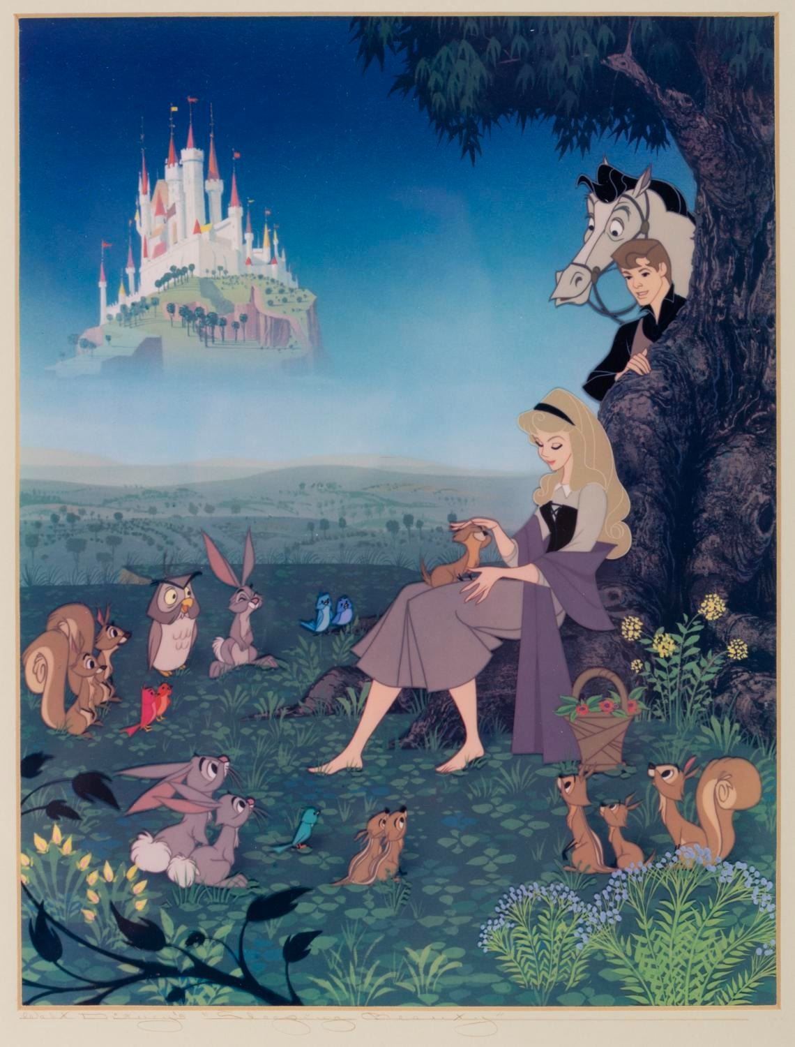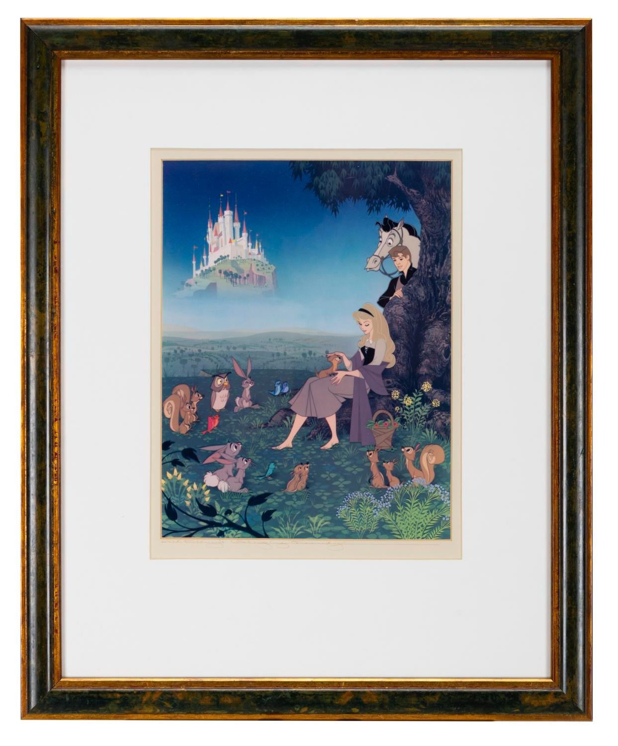 (Disney, 1959) A framed studio dye transfer featuring an image from Walt Disney’s "Sleeping Beauty." Dye transfers were reproductions of artwork using a high-quality photographic process known for incredible color vibrancy and resistance to fading. The studio would create these prints and give them as gifts to visitors, and later sold them at the Art Corner at Disneyland. This transfer has been beautifully framed but still retains its original matte, which was hand-lettered at the studio with the name of the production (indicating that this was probably a gift). The entire framed piece measures 17.5" x 22" with a 9" x 12" matte opening. The artwork and frame are both in very good condition, with some yellowing to the original studio matte.