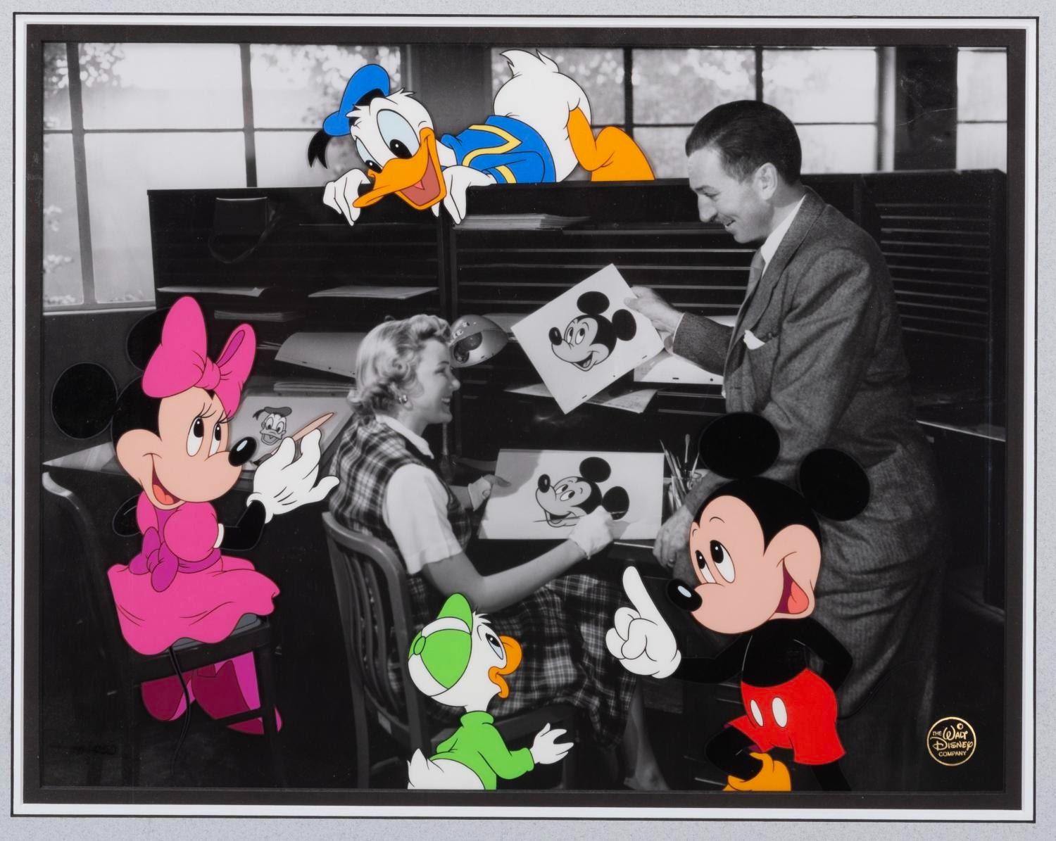 (Disney, 1995) A framed, hand painted cel of Mickey and friends over a photograph of Walt visiting the ink and paint department at the studio. Featuring Mickey, Minnie, Donald and Louie, the piece is in a limited edition of 950 and includes a certificate of authenticity. Mickey and friends measure 10” x 11.25” on a 10” x 13” visible cel and 18” x 21” overall in the frame. The piece is in very good condition with light scuffing and scratching to the frame.