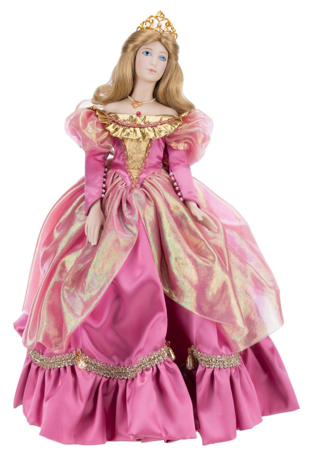 (Franklin Heirloom Dolls, 1987) A Cinderella fairy tale doll by Franklin Heirloom Dolls. Designed by famed doll artist Gerda Neubacher, Cinderella is made of hand-painted porcelain and costumed in satin organza and gold lamé, with handmade spun glass slippers, a necklace with electroplated 24 karat gold and faux pearls, and a tiara with three faux pearls and one-half point diamond. Measuring 19 " tall, Cinderella is in fine condition in the original box with display stand. The box exhibits heavy wear from handling, shipping, and age.