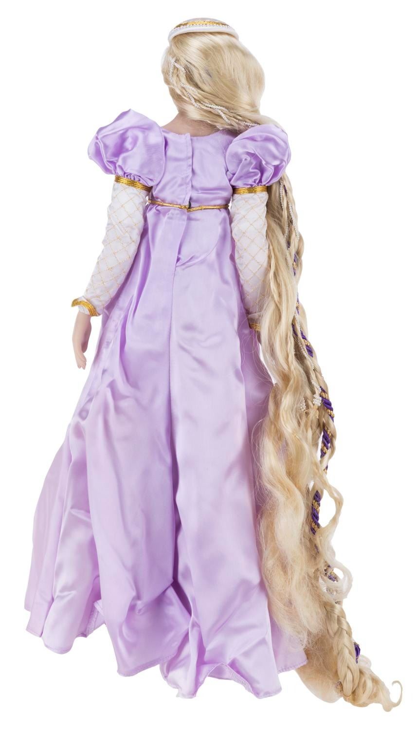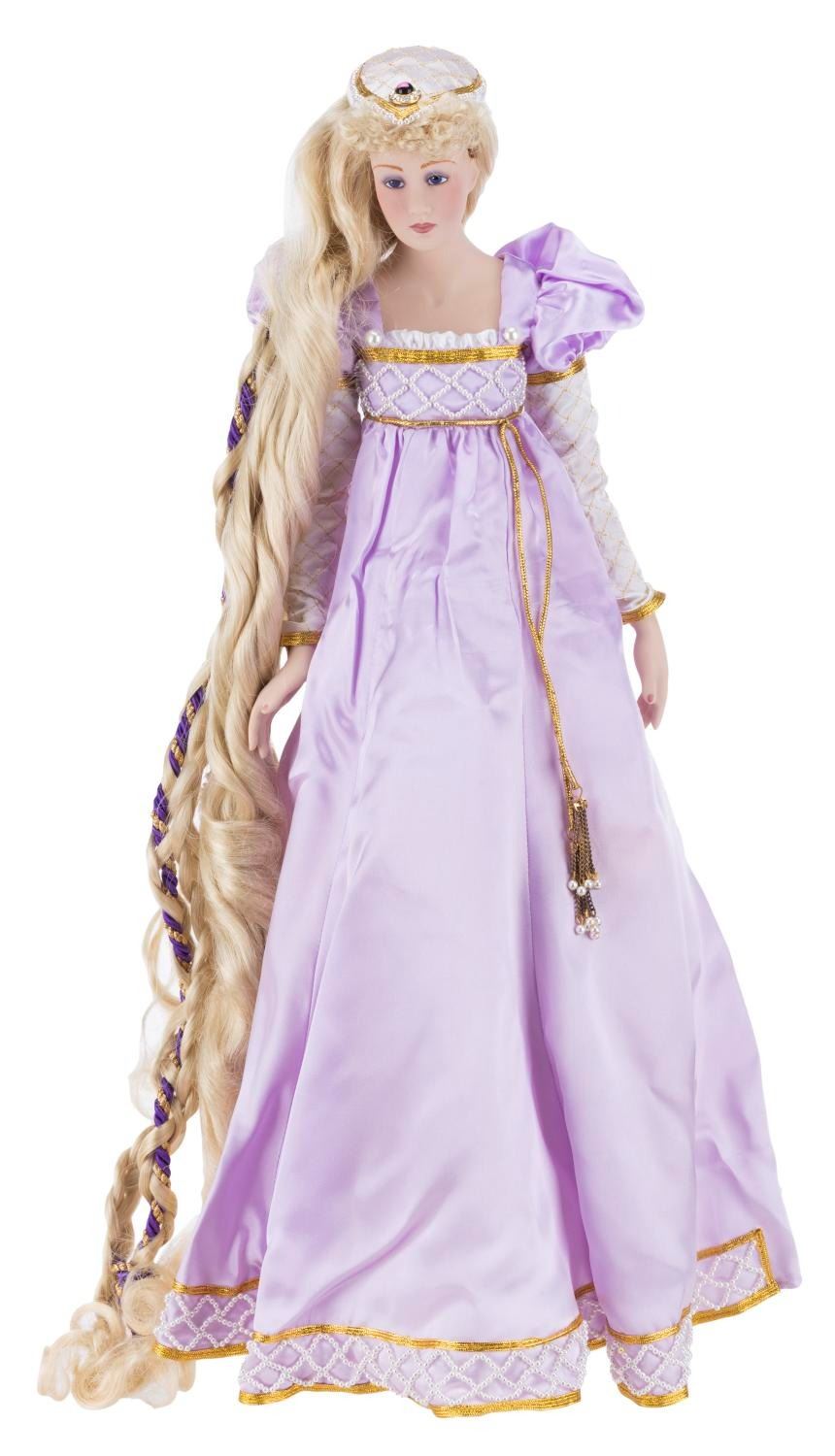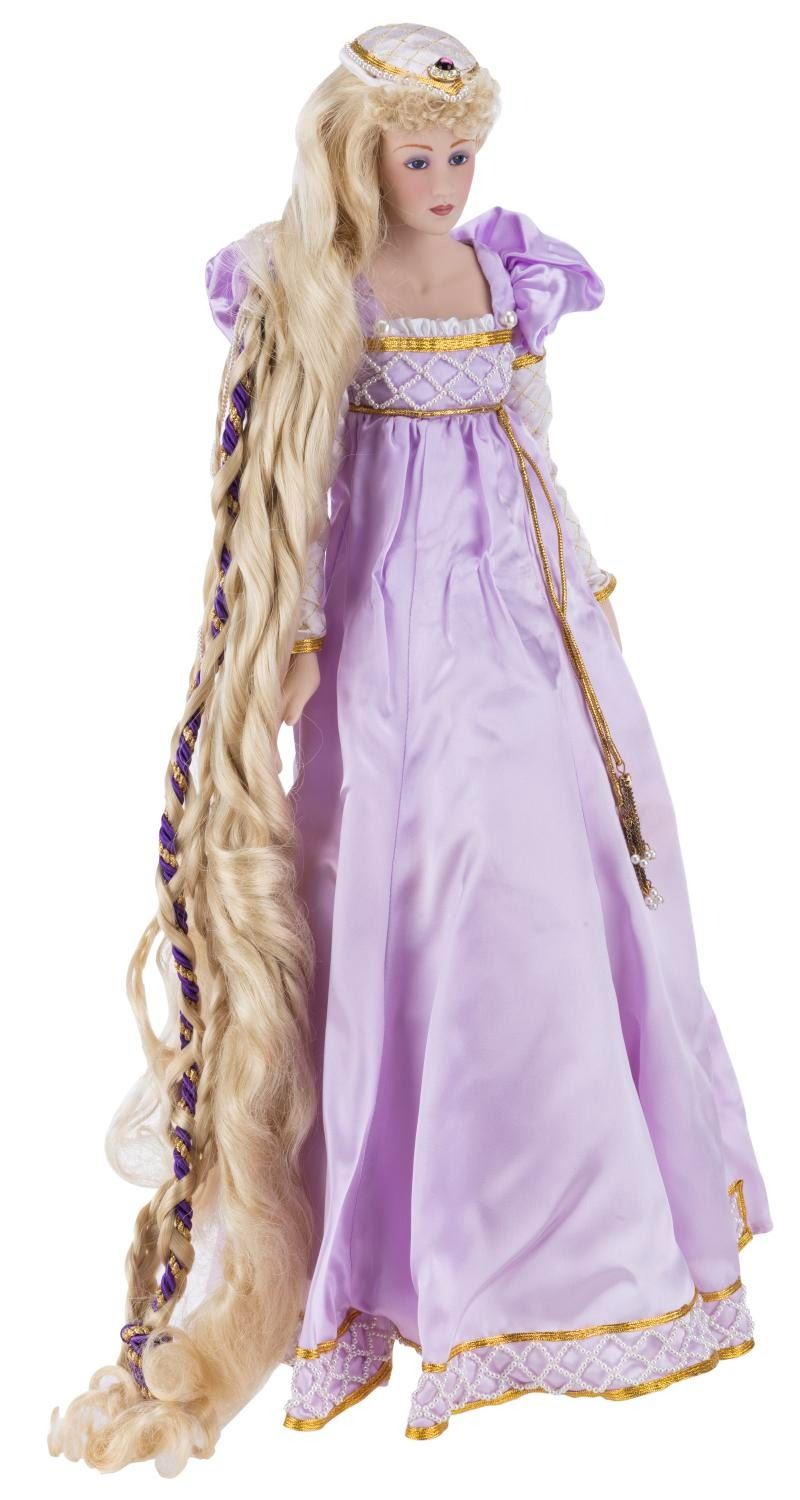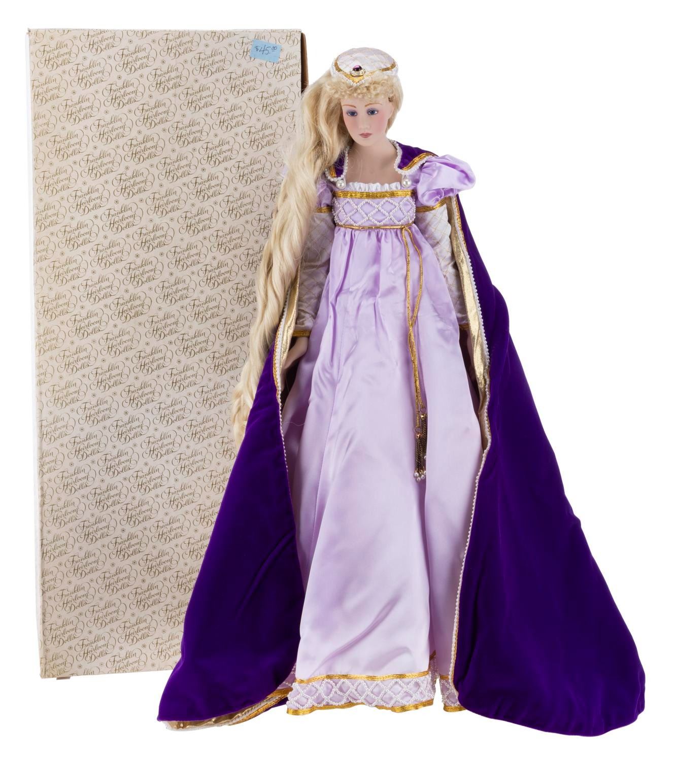 (Franklin Heirloom Dolls, 1988) A Rapunzel fairy tale doll by Franklin Heirloom Dolls. Designed by famed doll artist Gerda Neubacher, Rapunzel is made of hand-painted porcelain and features long flowing hair, a lilac satin dress with gold trim and beaded accents, and her purple cape. Measuring 20" tall, the doll is in very good condition with light matting to her hair from age, while her original box is in good condition with discoloration and edge wear from handling and storage.