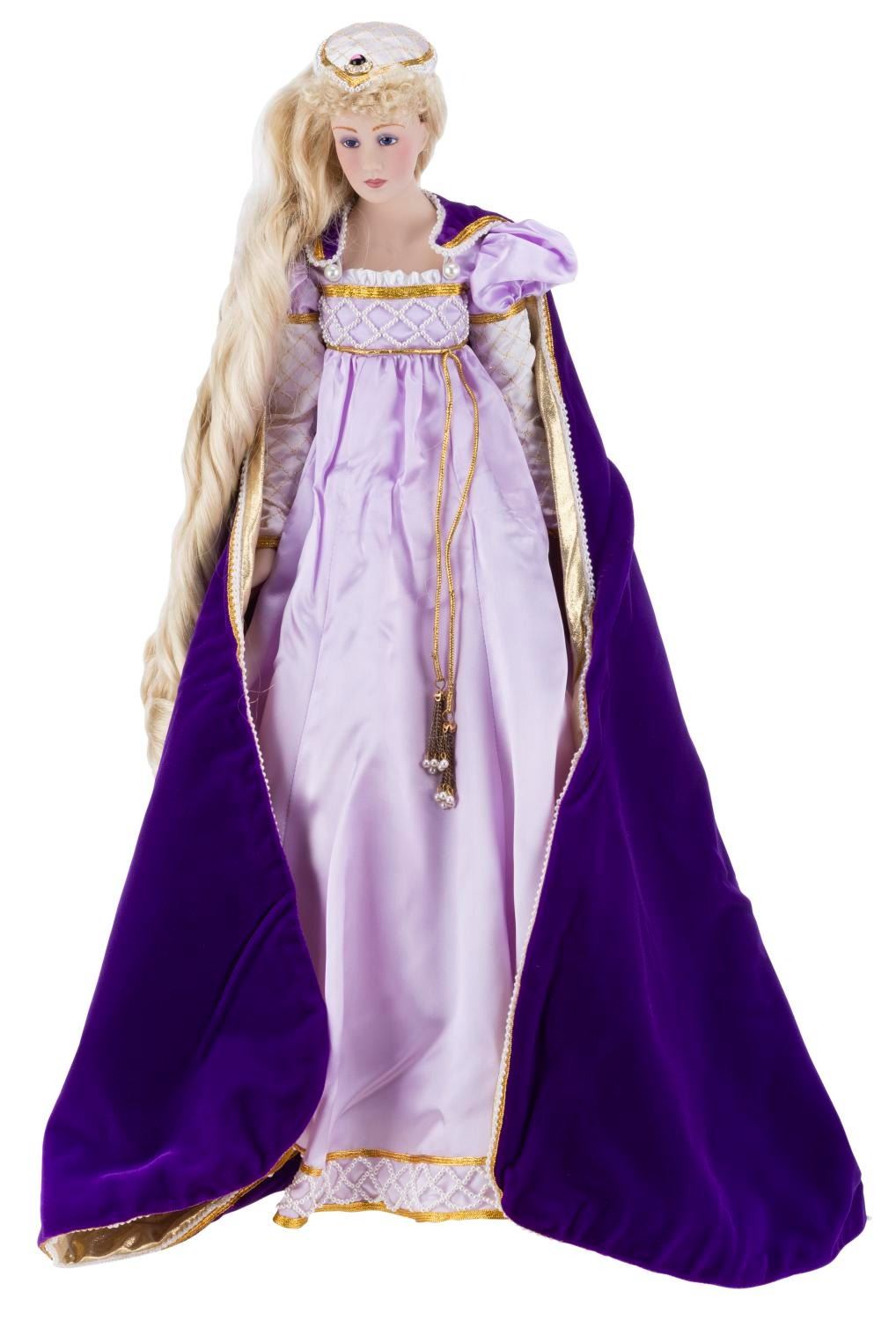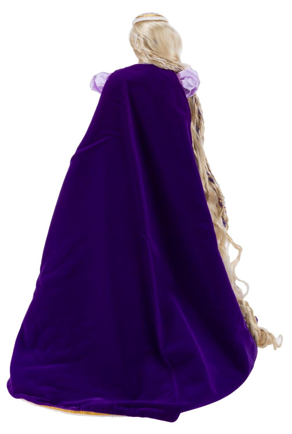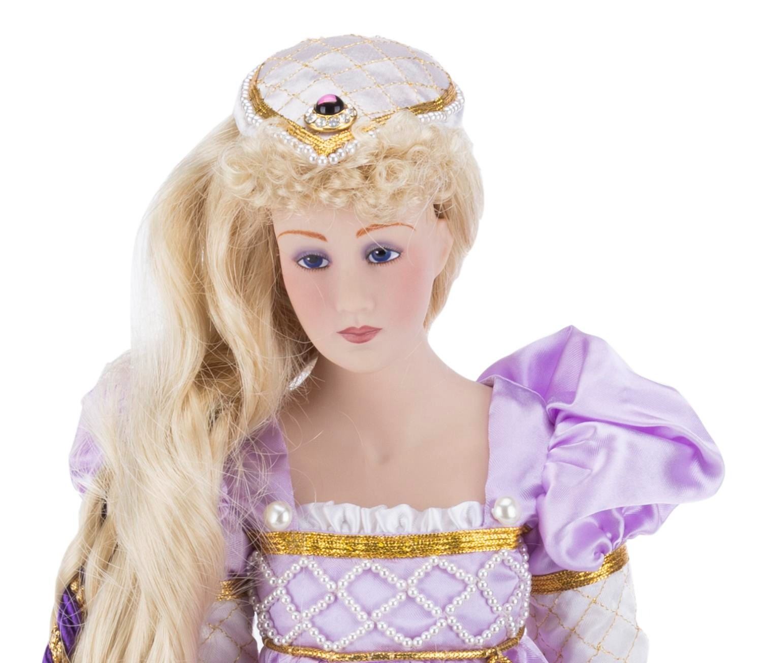 (Franklin Heirloom Dolls, 1988) A Rapunzel fairy tale doll by Franklin Heirloom Dolls. Designed by famed doll artist Gerda Neubacher, Rapunzel is made of hand-painted porcelain and features long flowing hair, a lilac satin dress with gold trim and beaded accents, and her purple cape. Measuring 20" tall, the doll is in very good condition with light matting to her hair from age, while her original box is in good condition with discoloration and edge wear from handling and storage.