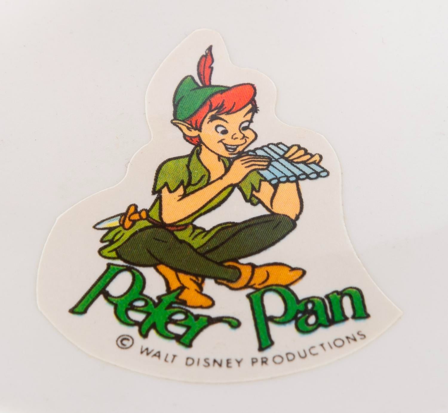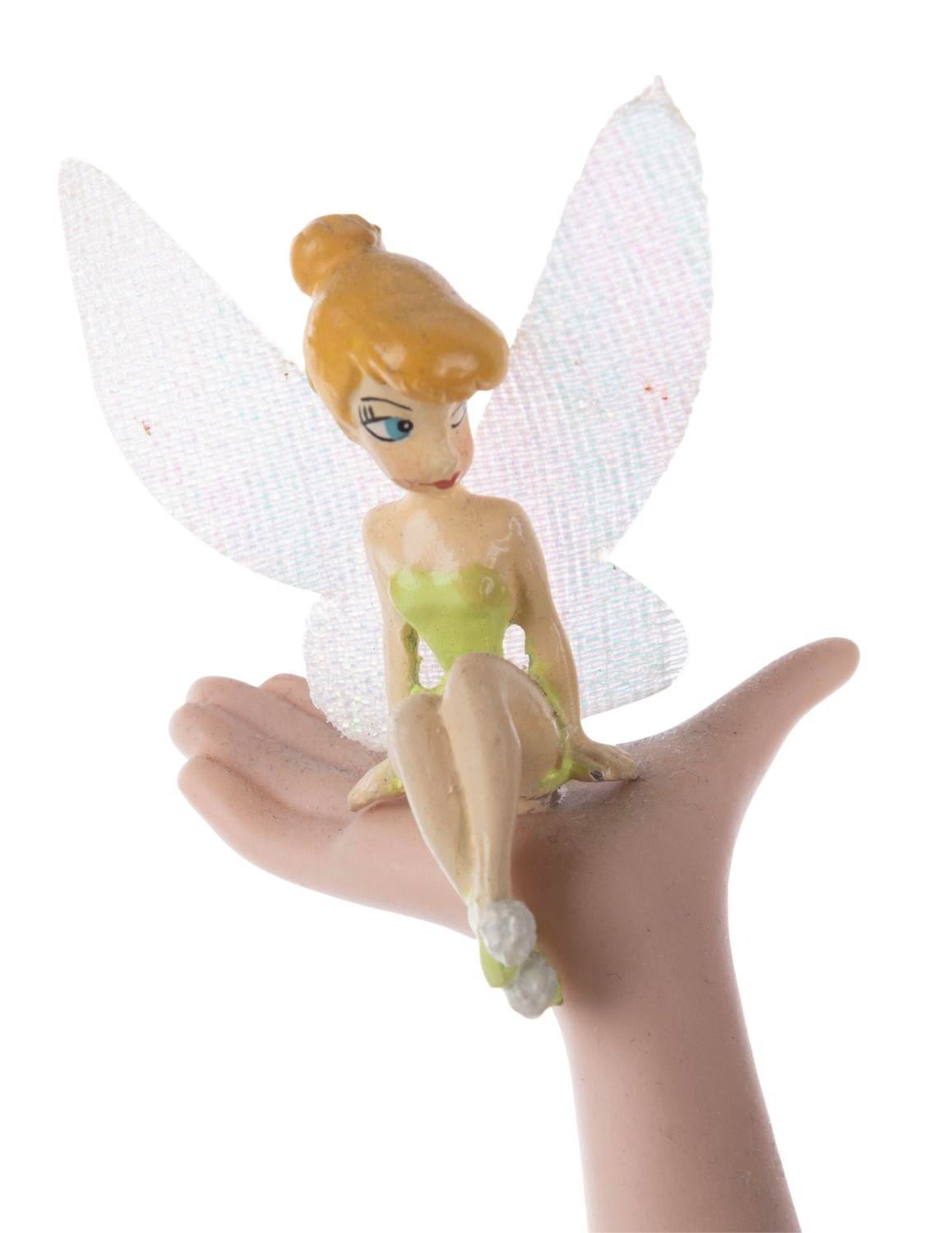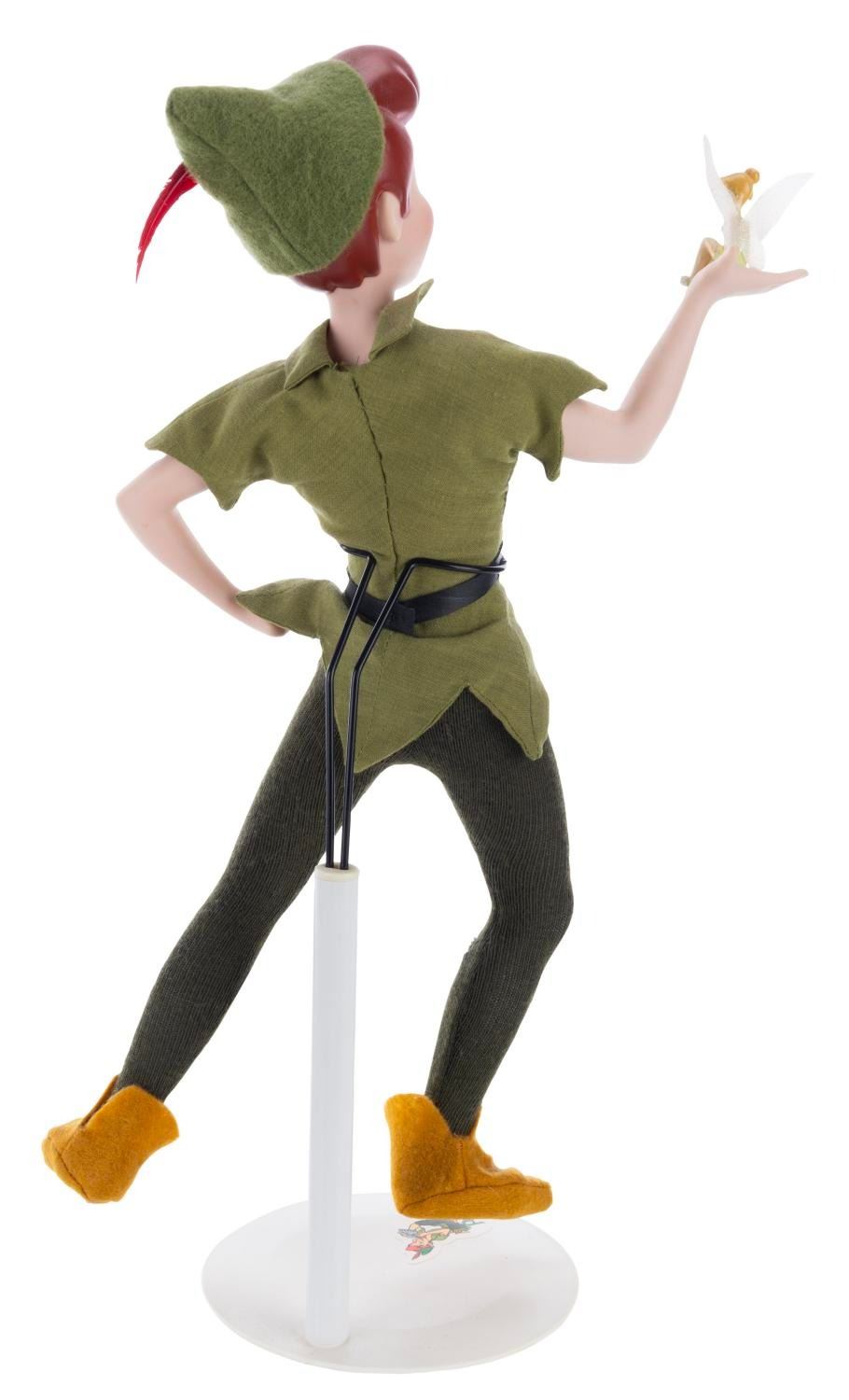 (Franklin Mint, 1991) A Peter Pan doll sculpted from fine bisque porcelain, hand-painted with meticulously tailored fabric clothing and accessories. Peter holds his favorite fairy Tinker Bell in his right hand. Produced in 1991 by the Franklin Mint, the 13.25" tall doll is in very good condition with two small areas of discoloration on Peter's chest and shoulder, a .25" run in the back of the tights, and two small spots on Tinker Bell's wings.