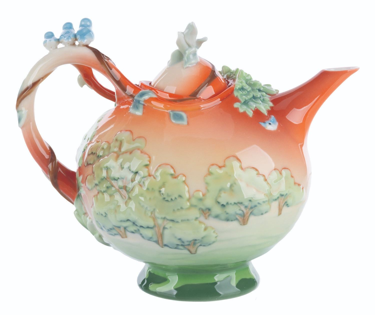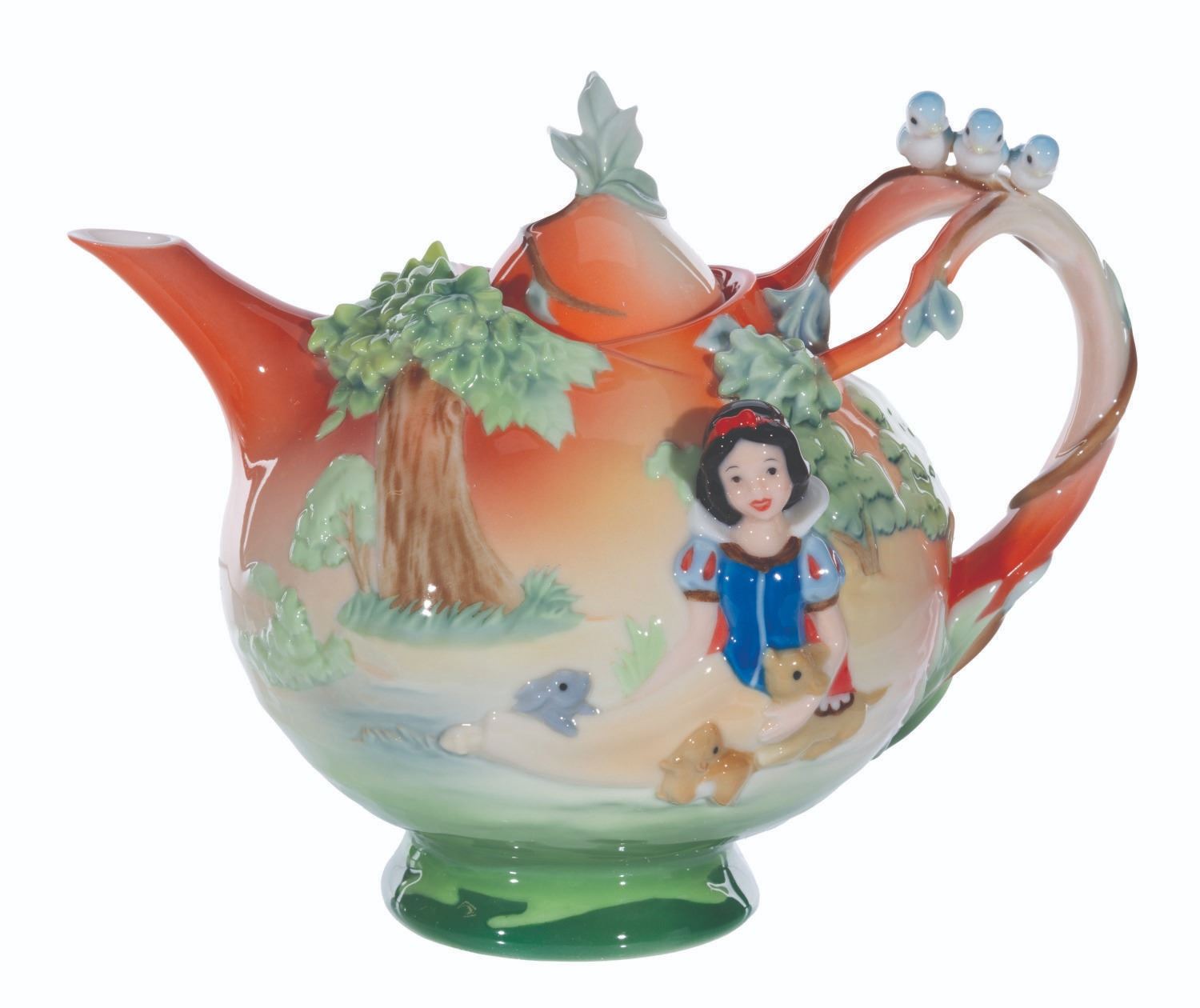 (Disney, 2008) A Walt Disney Collectibles Snow White teapot by Franz. The teapot was designed by Chang Yu Yin and sculpted by Su Fen, and features a relief of Snow White with her animal forest friends. Measuring 6” x 8”, the teapot and lid are in fine condition and come with the original, very good condition box.