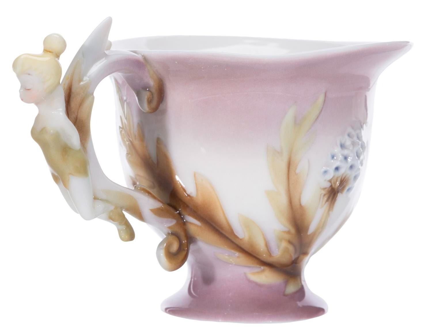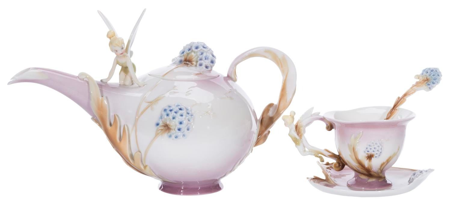 (Disney, 2000s) A Walt Disney Collectibles Tinker Bell porcelain teapot, cup, saucer, and spoon by Franz. This well-sculpted set, released in a limited edition of 500, features Tinker Bell on the cup handle, Tink on top of the teapot, and flowers throughout. Ranging in size from the 2.5” tall and 3.25” in diameter cup to the 7” tall and 5.5” in diameter teapot, the lot is in fine condition. The pieces come with their original boxes and certificates of authenticity.