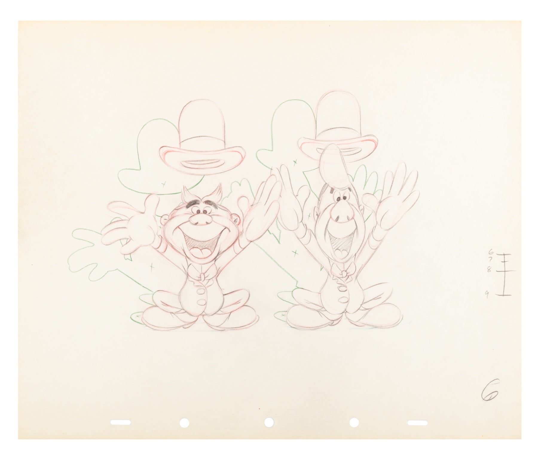 (Disney, 1941) An original production drawing featuring caricatures of Disney Legends Fred Moore and Ward Kimball from the animated short “Nifty Nineties.” With an image size of 8.25” x 5.5” on 10” x 12” animation paper, the drawing is in very good condition with light wear from handling and slight color shift to the paper from age.
