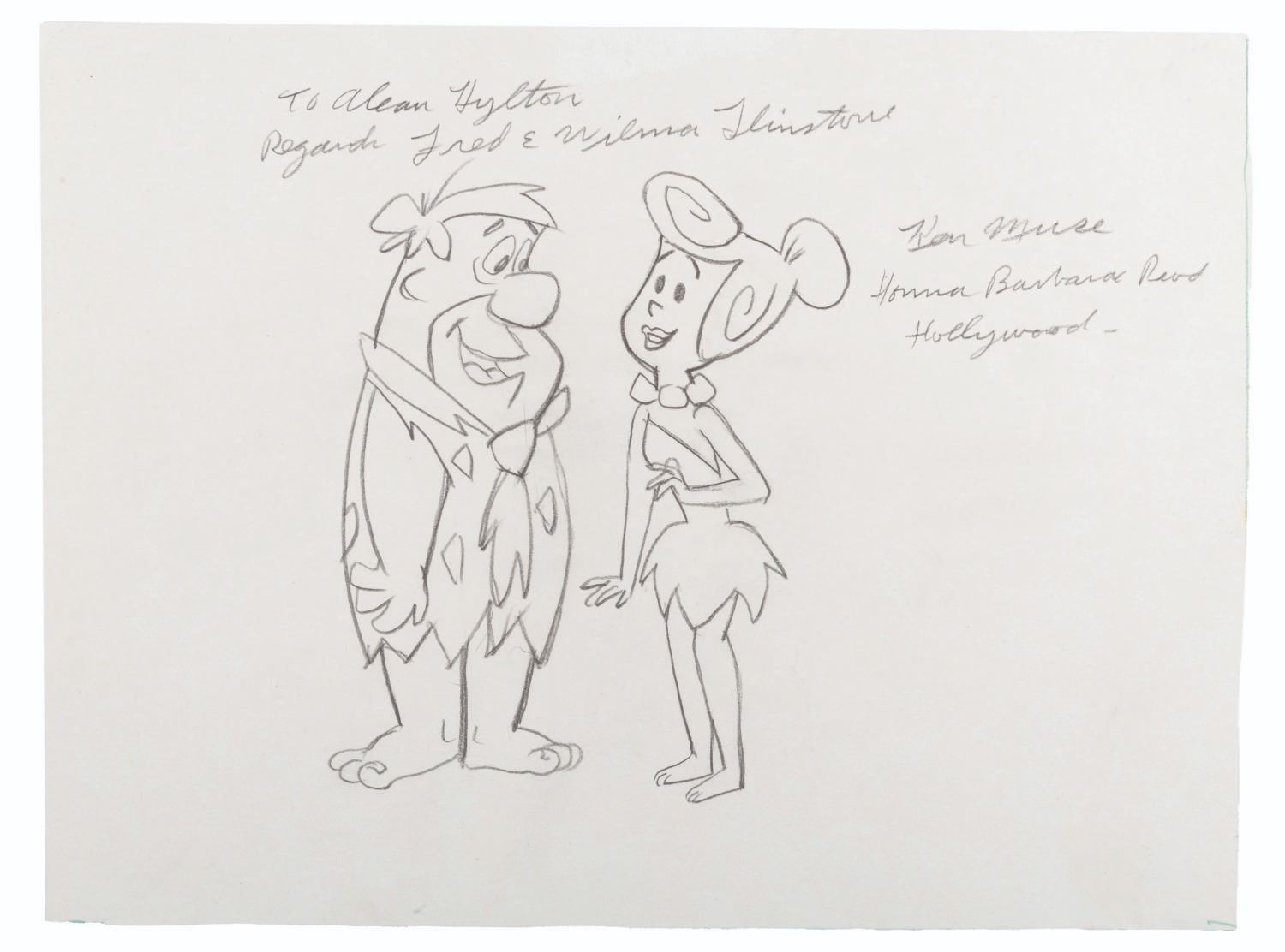 (Muse, 1970s-80s) A pencil drawing of Fred and Wilma Flintstone by animator Ken Muse, signed with a dedication to super collector Alan Hylton. Muse worked on the pilot for The Flintstones and many other Hanna Barbera titles, as well as animating Jerry Mouse dancing with the live-action Gene Kelly in “Anchors Aweigh.” With an image size of 5” x 6.5” on 8.5” x 11.5” paper, the drawing is in very good condition.