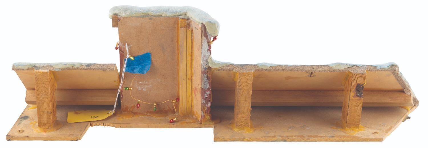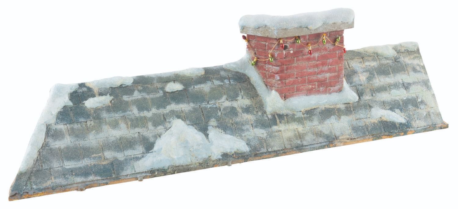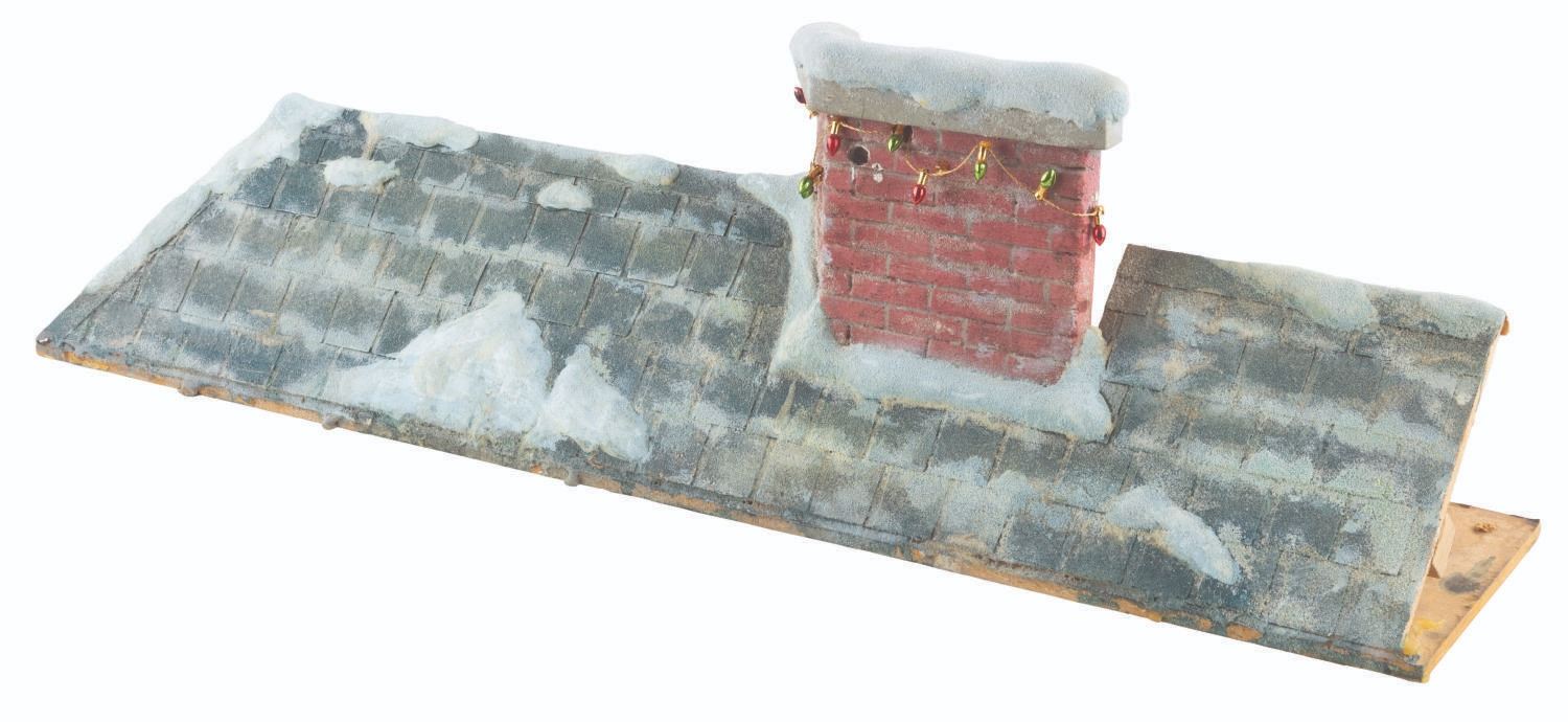 (Freeform, 2000s) A screen-used rooftop miniature model from Freeform's 25 Days of Christmas interstitials. The annual television celebration features a jam-packed lineup of Christmas programming during the holiday season. This rooftop model is seen in an interstitial where Santa Claus peeks out of the chimney. Measuring 24" x 5" x 7" tall, the wooden rooftop model is unpainted on the reverse and is in very good condition with light wear from production use.