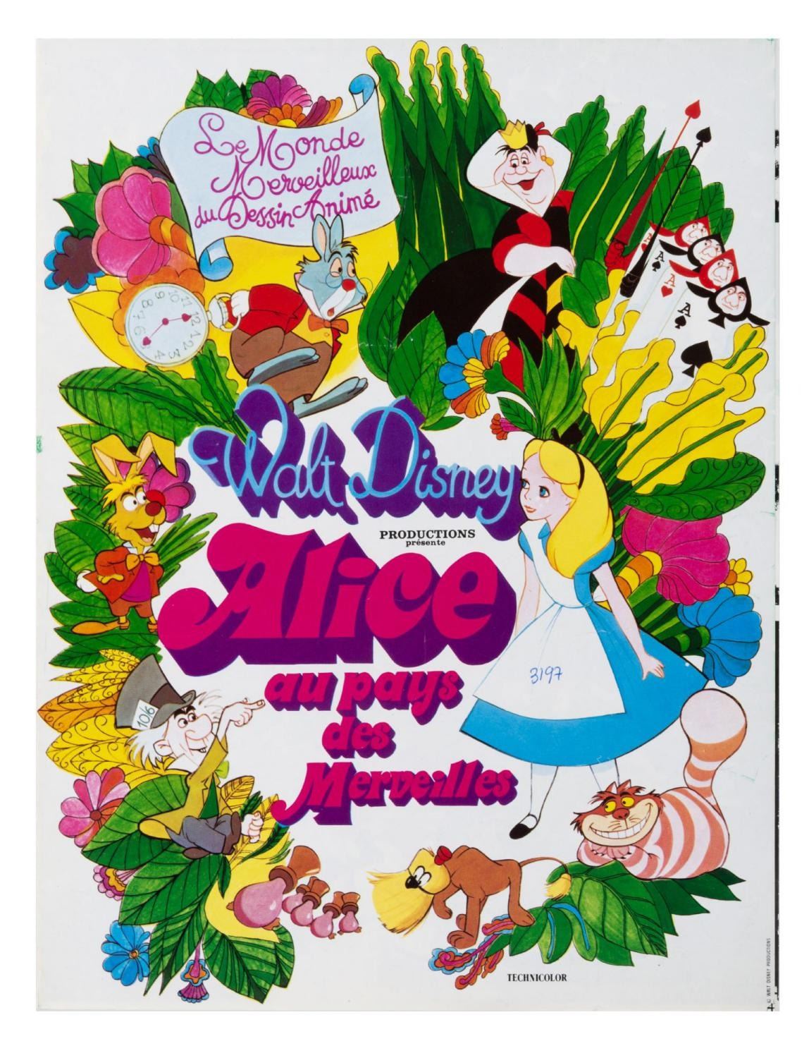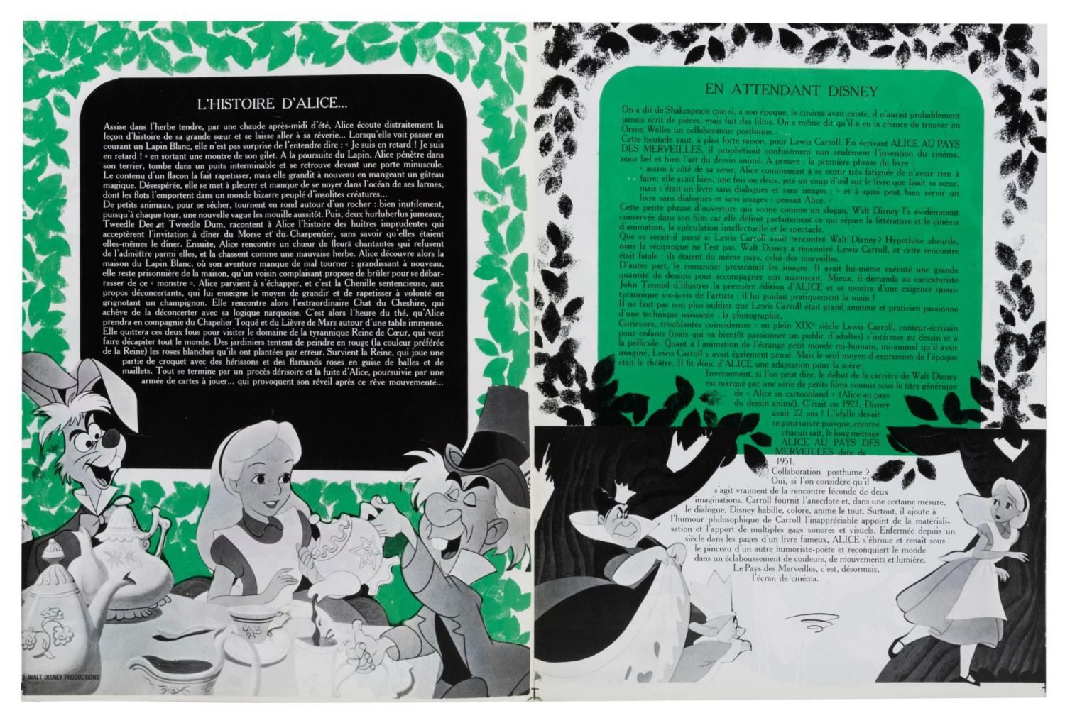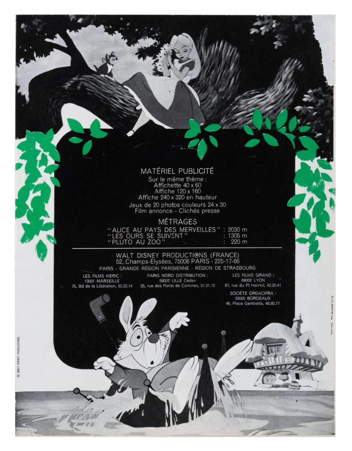 (Disney, 1970s) A promotional flyer for a 1970s French re-release of Walt Disney's "Alice in Wonderland." Measuring 9" x 12", the flyer is in good condition with light edge wear, creasing, and numbers written in pen.