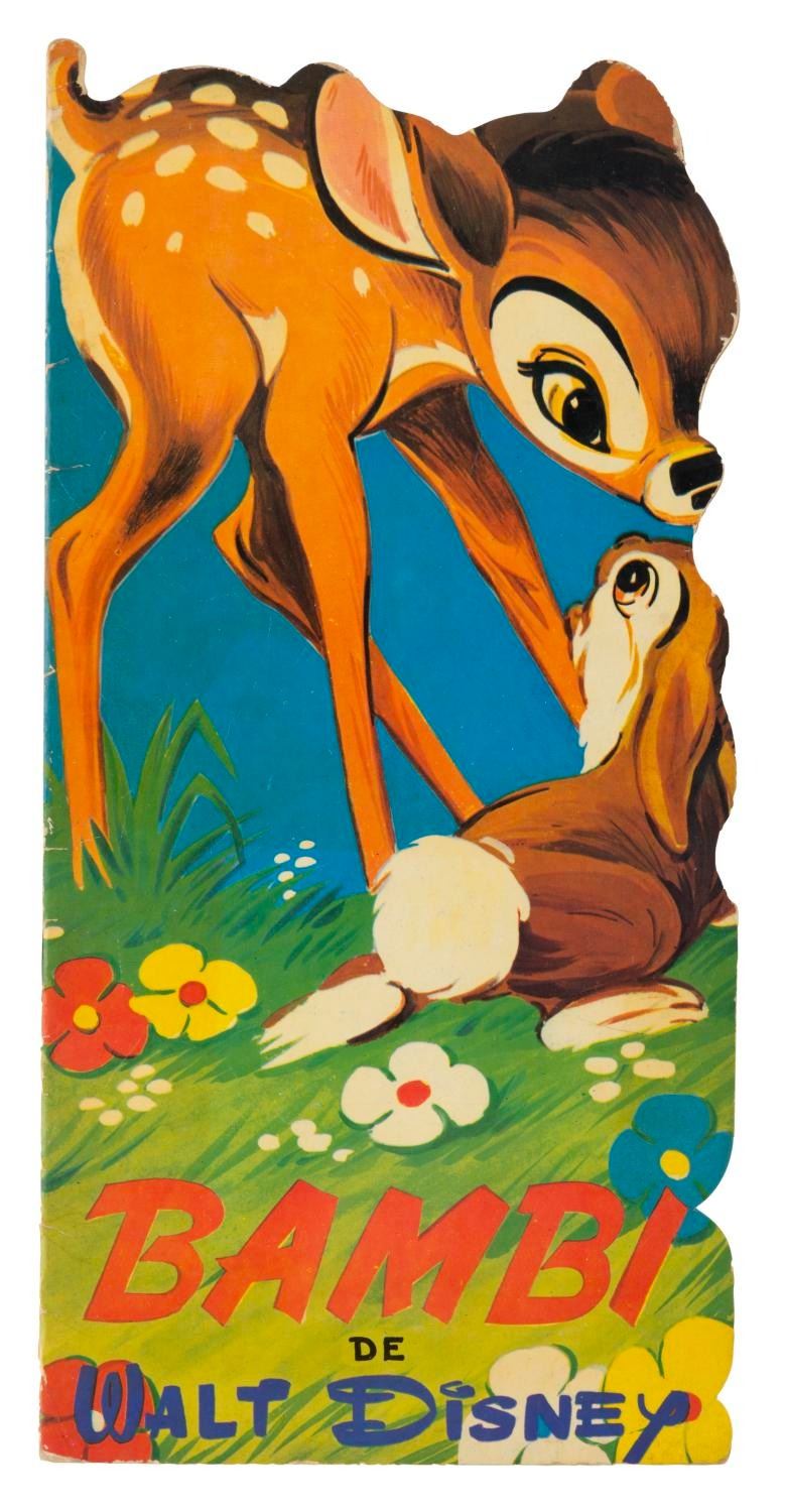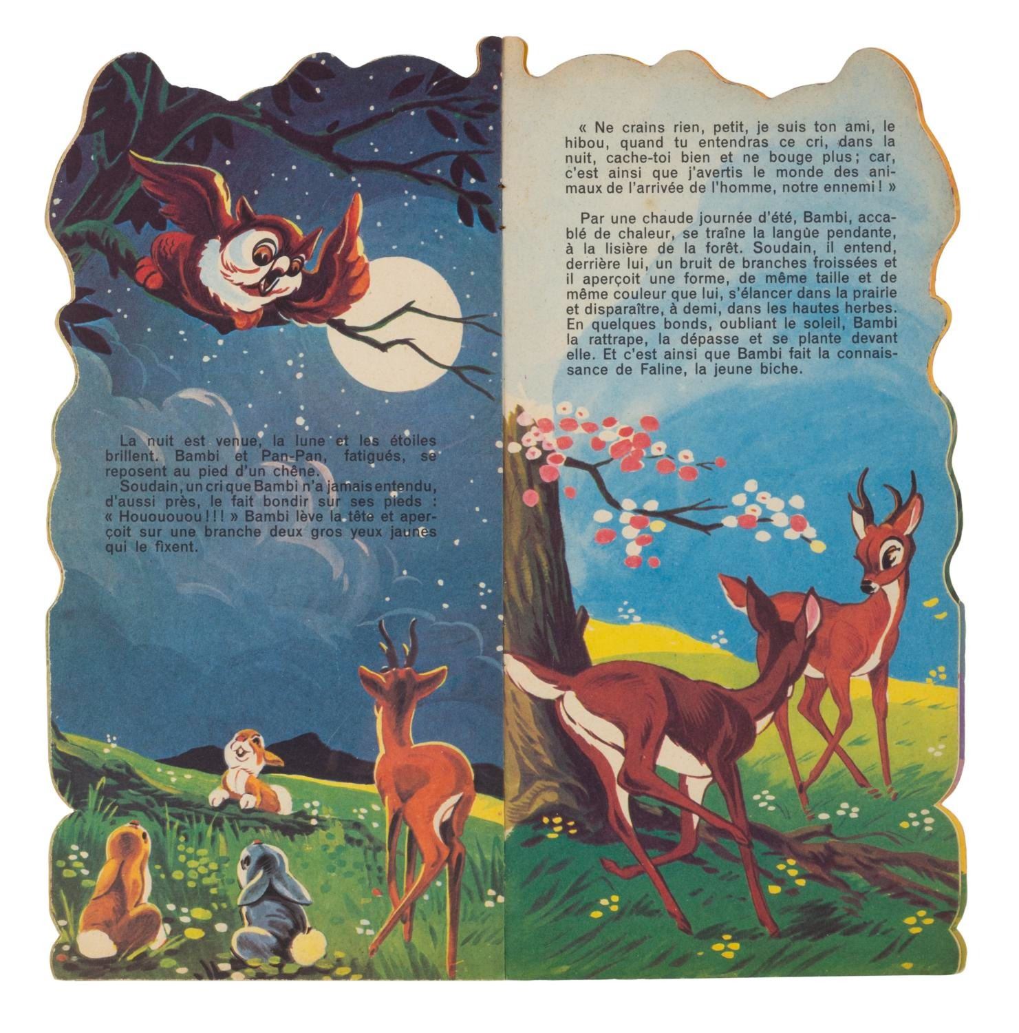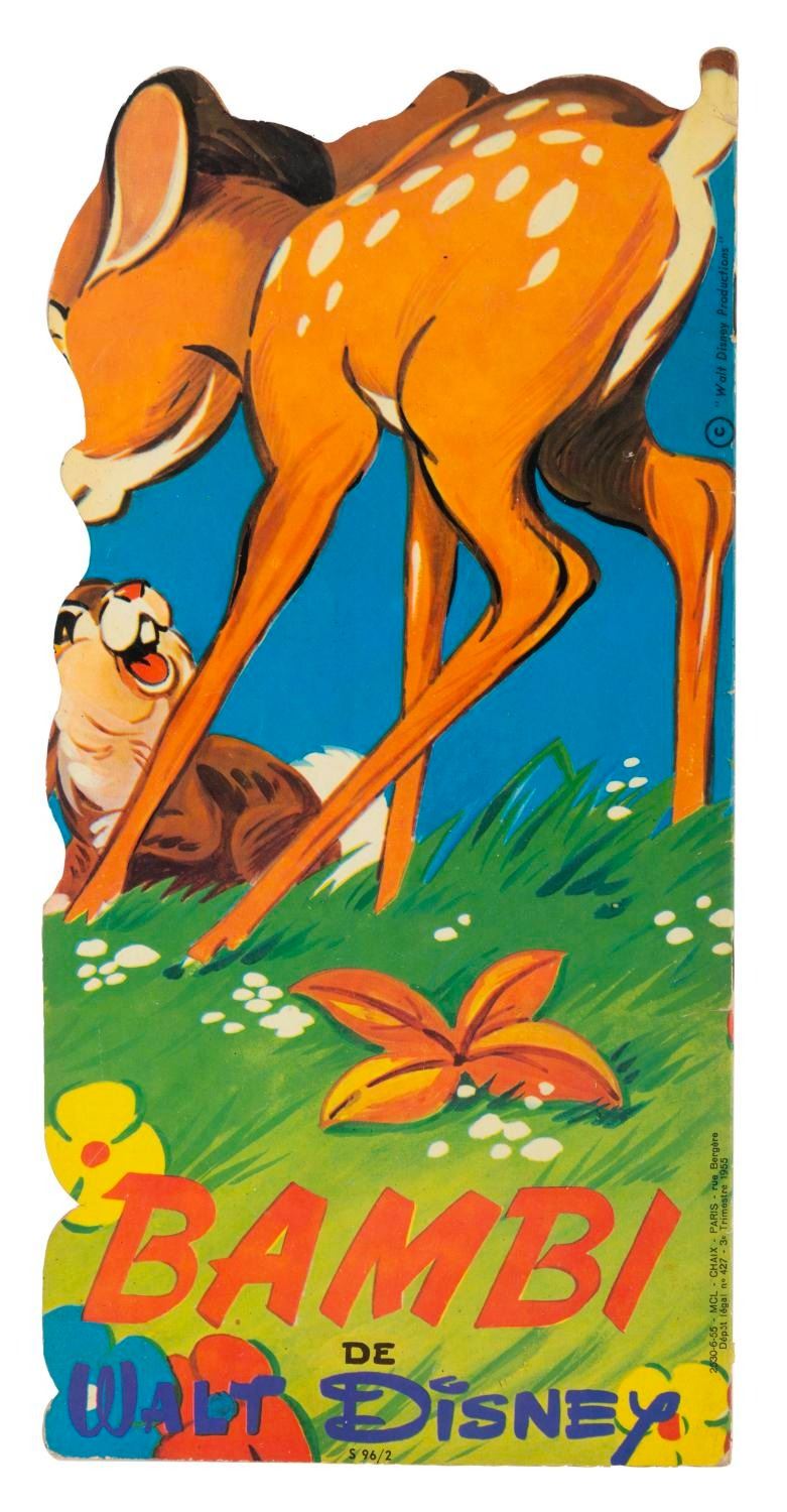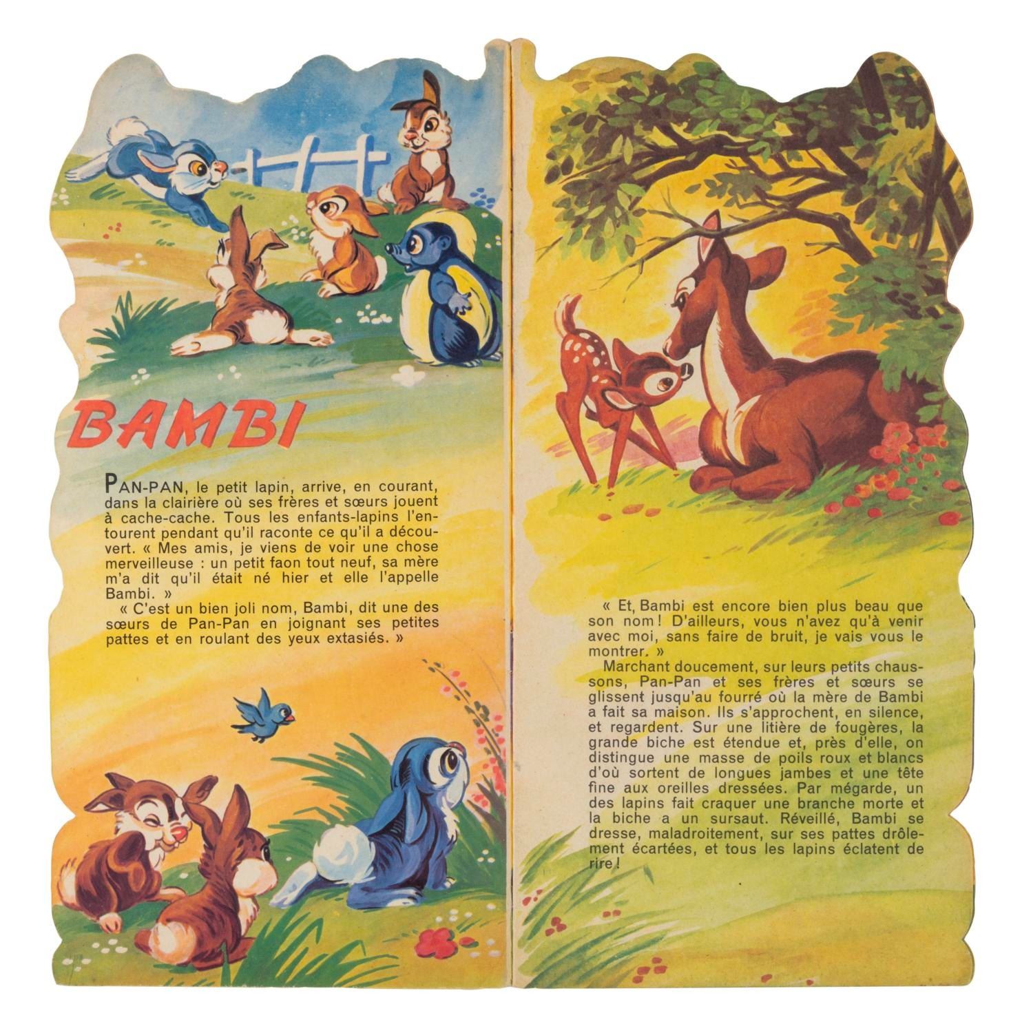 (1955) A die-cut Bambi de Walt Disney story book from France. Measuring 5.5" x 11.25", the book is in good condition with creases, scratches, and wear.